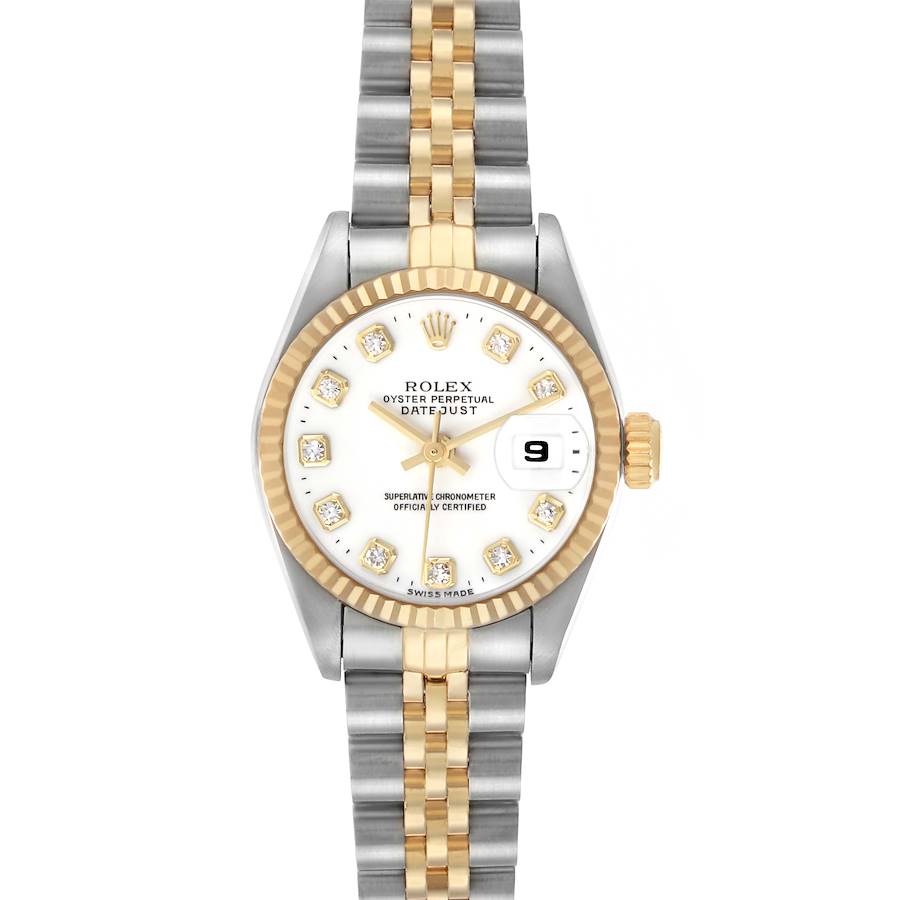 Rolex Datejust White Diamond Dial Steel Yellow Gold Ladies Watch 69173. Officially certified chronometer automatic self-winding movement. Stainless steel and 18k yellow gold oyster case 26.0 mm in diameter. Rolex logo on the 18k yellow gold crown. 18k yellow gold fluted bezel. Scratch resistant sapphire crystal with a cyclops magnifier. White dial with original Rolex factory hour markers and yellow gold baton hands. Outer stick minute markers. Date calendar at the 3 o'clock aperture. Stainless steel and 18k yellow gold jubilee bracelet with a fold-over clasp. Fits a 6" wrist.