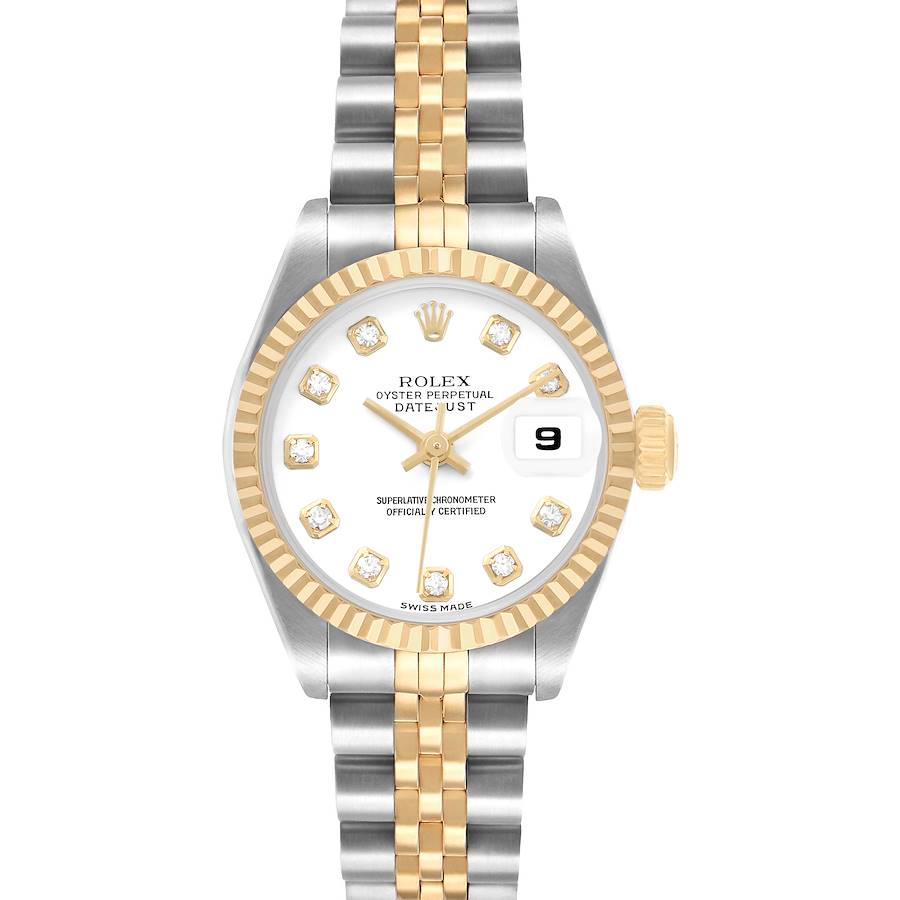 Rolex Datejust White Diamond Dial Steel Yellow Gold Ladies Watch 79173. Officially certified chronometer automatic self-winding movement. Stainless steel oyster case 26.0 mm in diameter. Rolex logo on the 18K yellow gold crown. 18k yellow gold fluted bezel. Scratch resistant sapphire crystal with cyclops magnifier. White dial with original Rolex factory diamond hour markers and yellow gold baton hands. Date calendar at the 3 o'clock aperture. Stainless steel and 18k yellow gold jubilee bracelet with a fold-over clasp. Fits a 6 1/4" wrist.