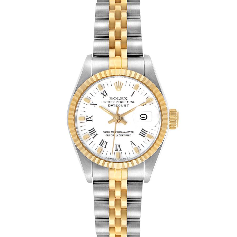 Rolex Datejust White Roman Dial Steel Yellow Gold Ladies Watch 69173. Officially certified chronometer automatic self-winding movement. Stainless steel and 18k yellow gold oyster case 26.0 mm in diameter. Rolex logo on the 18k yellow gold crown. 18k yellow gold fluted bezel. Scratch resistant sapphire crystal with a cyclops magnifier. White dial with black painted Roman numeral hour markers with yellow gold square accents. Luminescent yellow gold baton hands. Outer dot minute marker track. Date calendar at the 3 o'clock aperture. Stainless steel and 18k yellow gold jubilee bracelet with a fold-over clasp. Fits a 6 1/4" wrist.