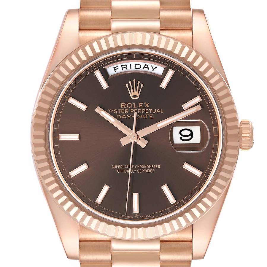 Rolex Day-Date 40 President Rose Gold Brown Dial Watch 228235. Officially certified chronometer self-winding movement. 18K rose gold case 40 mm in diameter. High polished lugs. Rolex logo on a crown. 18K rose gold fluted bezel. Scratch resistant sapphire crystal with cyclops magnifier. Brown dial with with raised luminous baton hour markers. Date window at 3 o'clock aperture. Day window at 12 o'clock. Minute markers around the outer rim. 18K rose gold bracelet with a hidden clasp. Fits a 7 1/4" wrist.