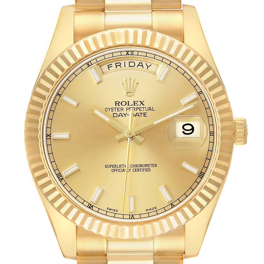 Rolex Day-Date II 41 President Yellow Gold Champagne Dial Watch 218238. Officially certified chronometer self-winding movement. 18K yellow gold case 41 mm in diameter. Rolex logo on a crown. 18K yellow gold fluted bezel. Scratch resistant sapphire crystal with cyclops magnifier. Champagne dial with raised luminous baton hour markers. Date window at 3 o'clock aperture. Day window at 12 o'clock. Minute markers around the outer rim. 18K yellow gold bracelet with a hidden clasp. Fits 7 1/4" wrist.