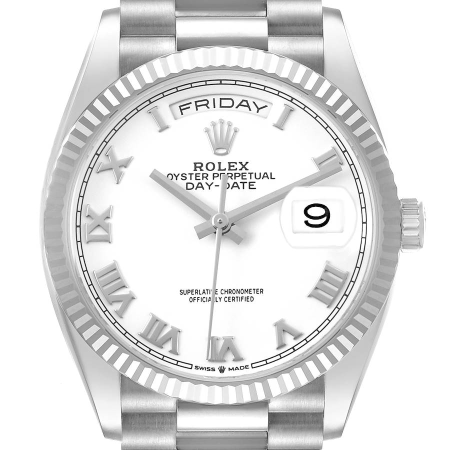 Rolex Day Date President Roman Dial White Gold Mens Watch 128239. Officially certified chronometer automatic self-winding movement. 18k white gold oyster case 36.0 mm in diameter. Rolex logo on a crown. 18k white gold fluted bezel. Scratch resistant sapphire crystal with cyclops magnifier. White dial with raised roman numeral hour markers. Outer minute and 1/2 seconds divisions, aperture for day at 12, aperture for date at 3. 18k white gold presidential bracelet. Fits 7 1/4" wrist.