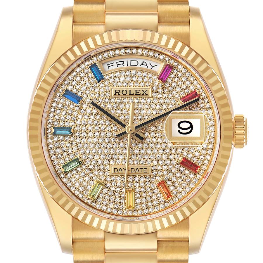 Rolex Day Date Yellow Gold Pave Diamond Rainbow Dial Watch 128238 Box Card. Officially certified chronometer automatic self-winding movement. Double quick set function. 18k yellow gold oyster case 36.0 mm in diameter. Rolex logo on the crown. 18K yellow gold fluted bezel. Scratch resistant sapphire crystal with cyclops magnifier. Original Rolex factory pave diamond dial with original Rolex factory baguette diamonds hour markers in rainbox setting. Date calendar at 3 o'clock aperture. Day of the week window at 12. 18k yellow gold president bracelet. Fits 7 3/4" wrist.