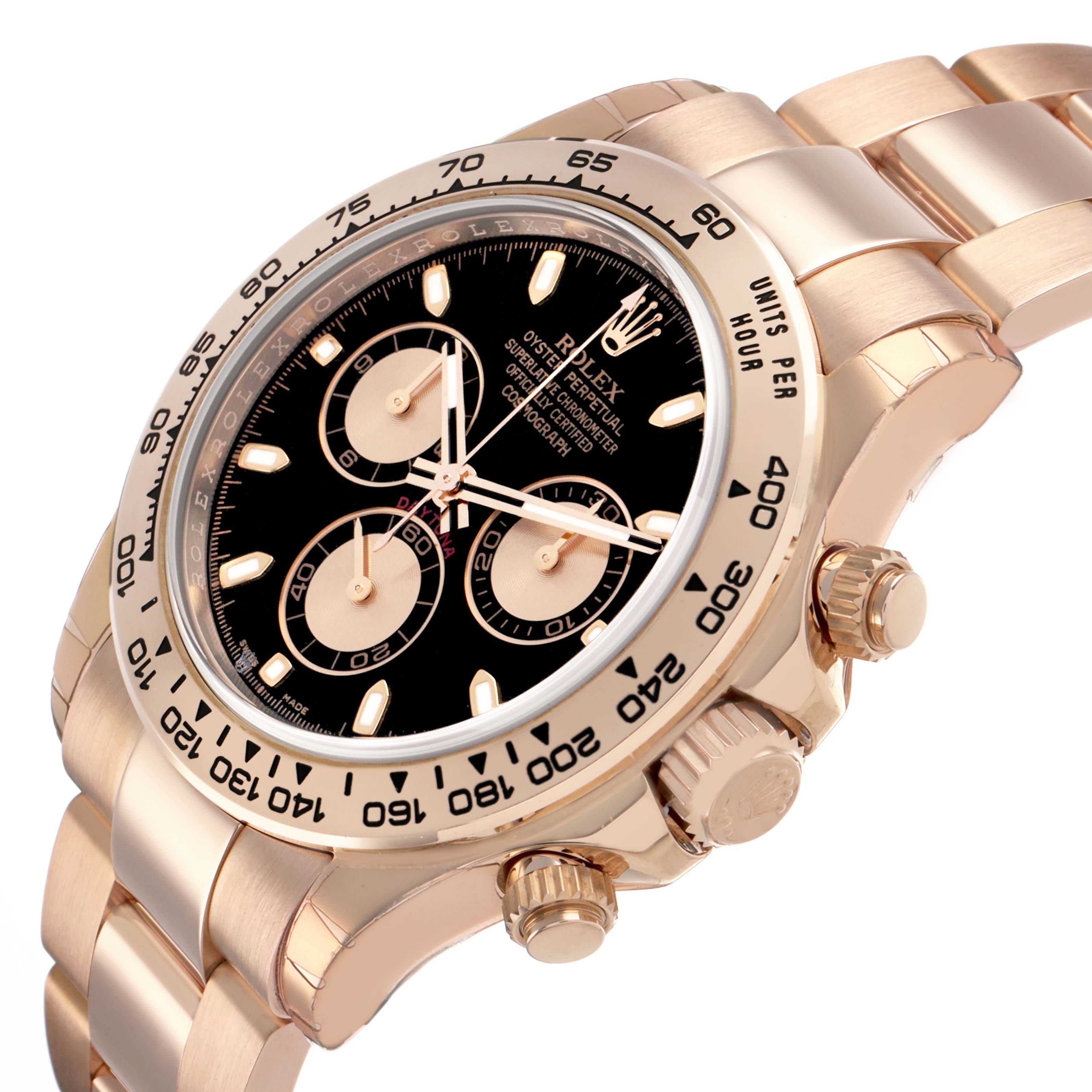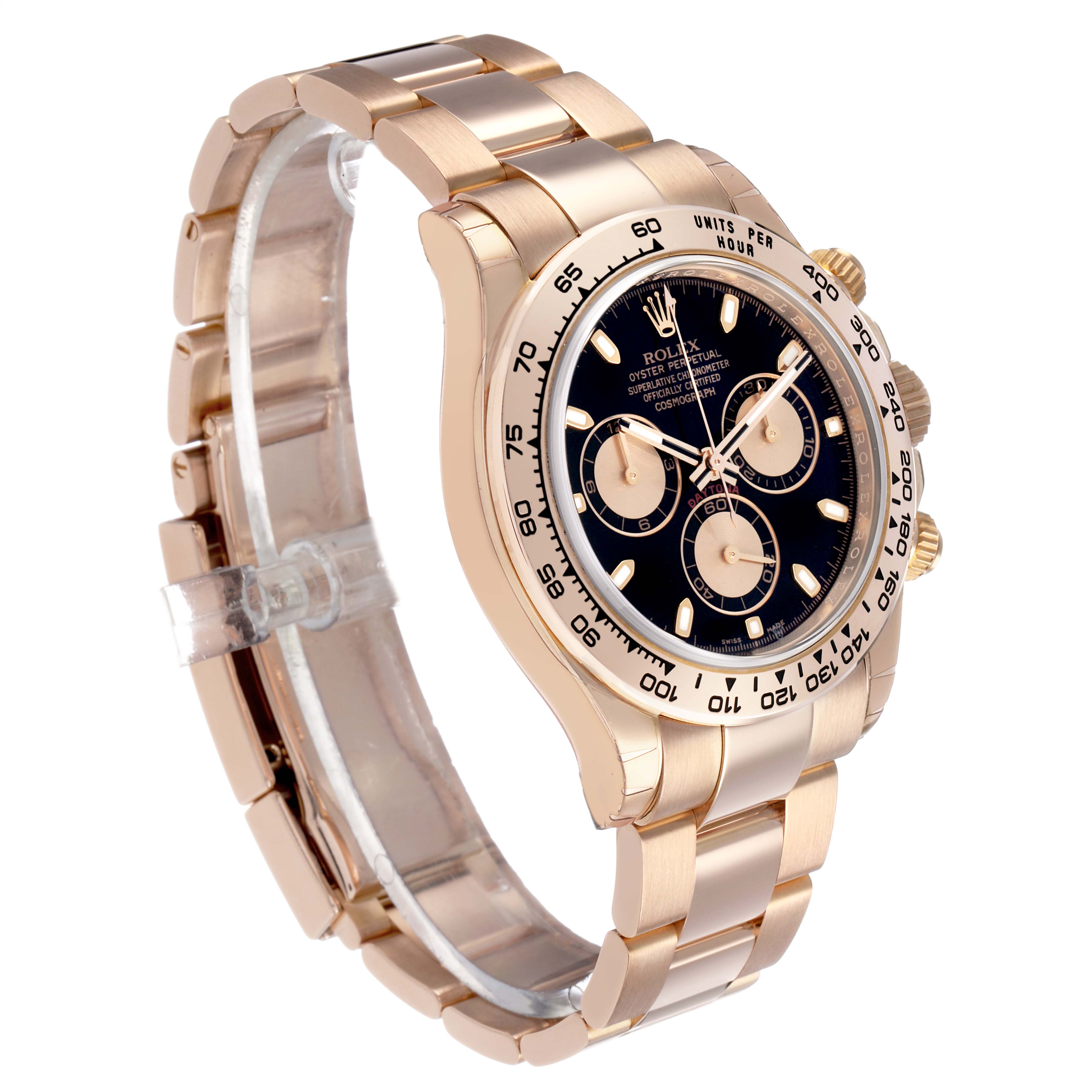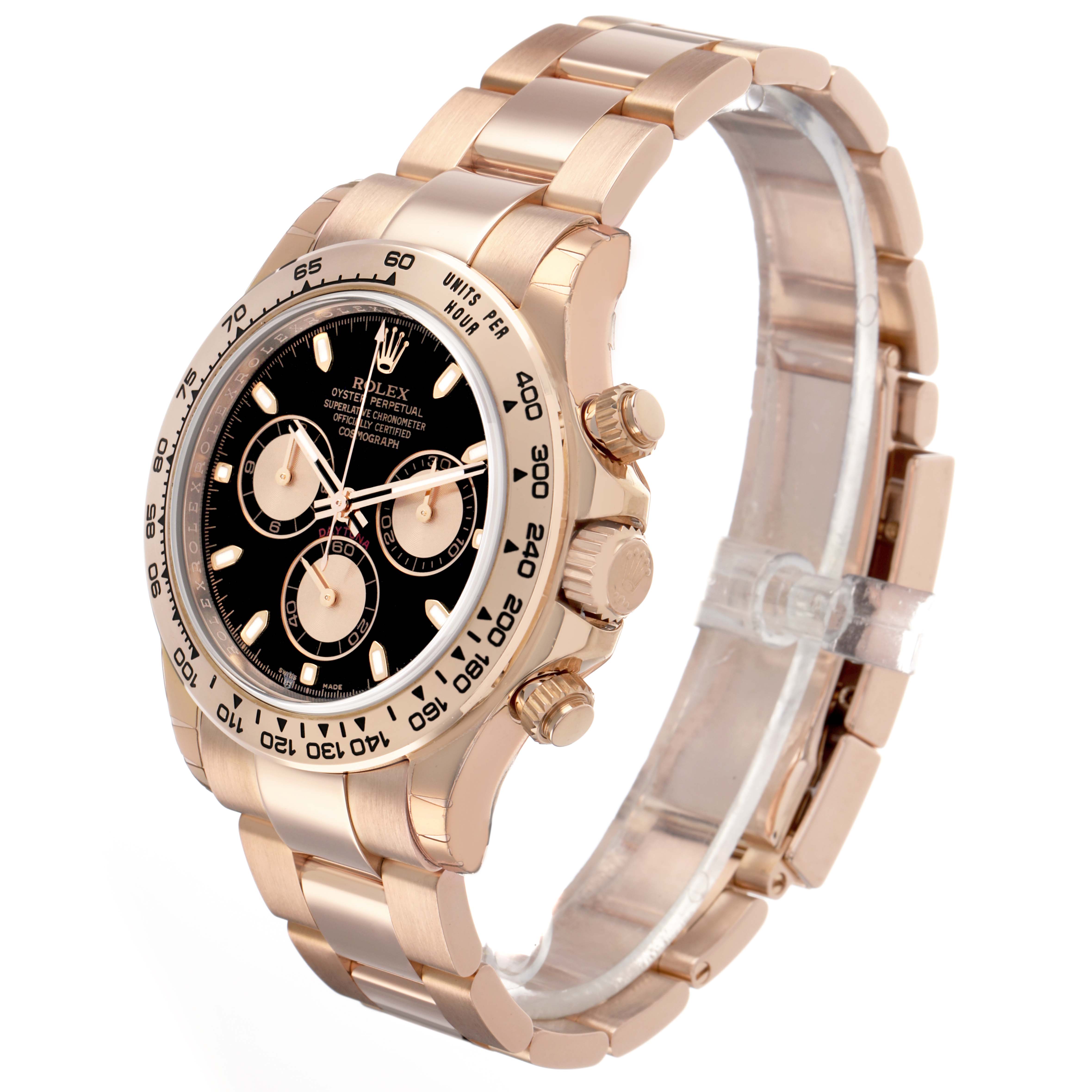 Rolex Daytona Cosmograph Rose Gold Black Dial Mens Watch 116505. Officially certified chronometer automatic self-winding movement. 18k everose gold case 40.0 mm in diameter. Special screw-down push buttons. Screw-down caseback. Chronograph pushers and crown with guards. 18k rose gold bezel with engraved tachymeter scale. Scratch resistant sapphire crystal. Black dial with raised luminous hands and hour makers. Three engine turned subdials -- 12 hours, 30 minutes, and running seconds. Outer minute and 1/5 seconds divisions. 18k rose gold oyster bracelet with flip-lock clasp. Fits an 8" wrist.