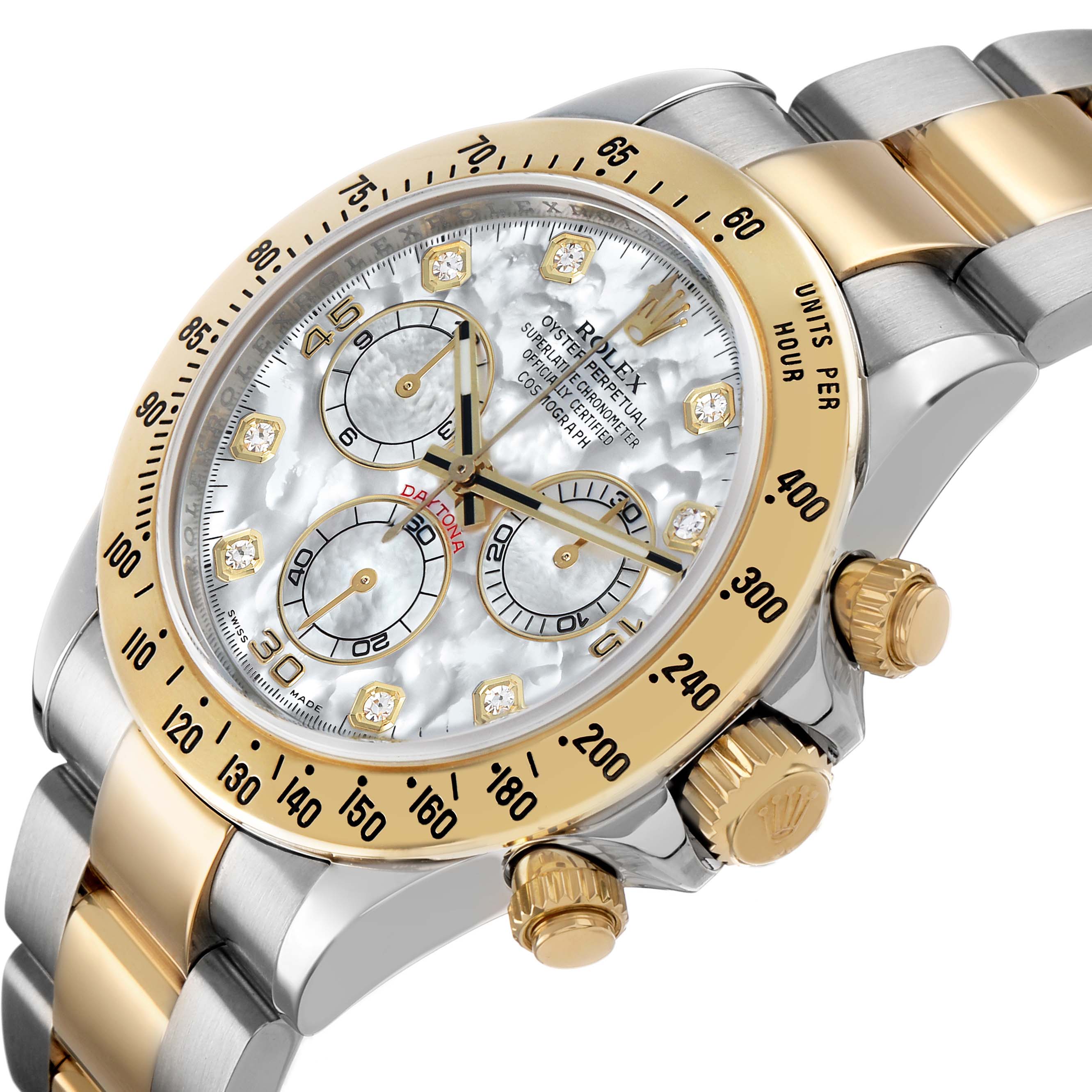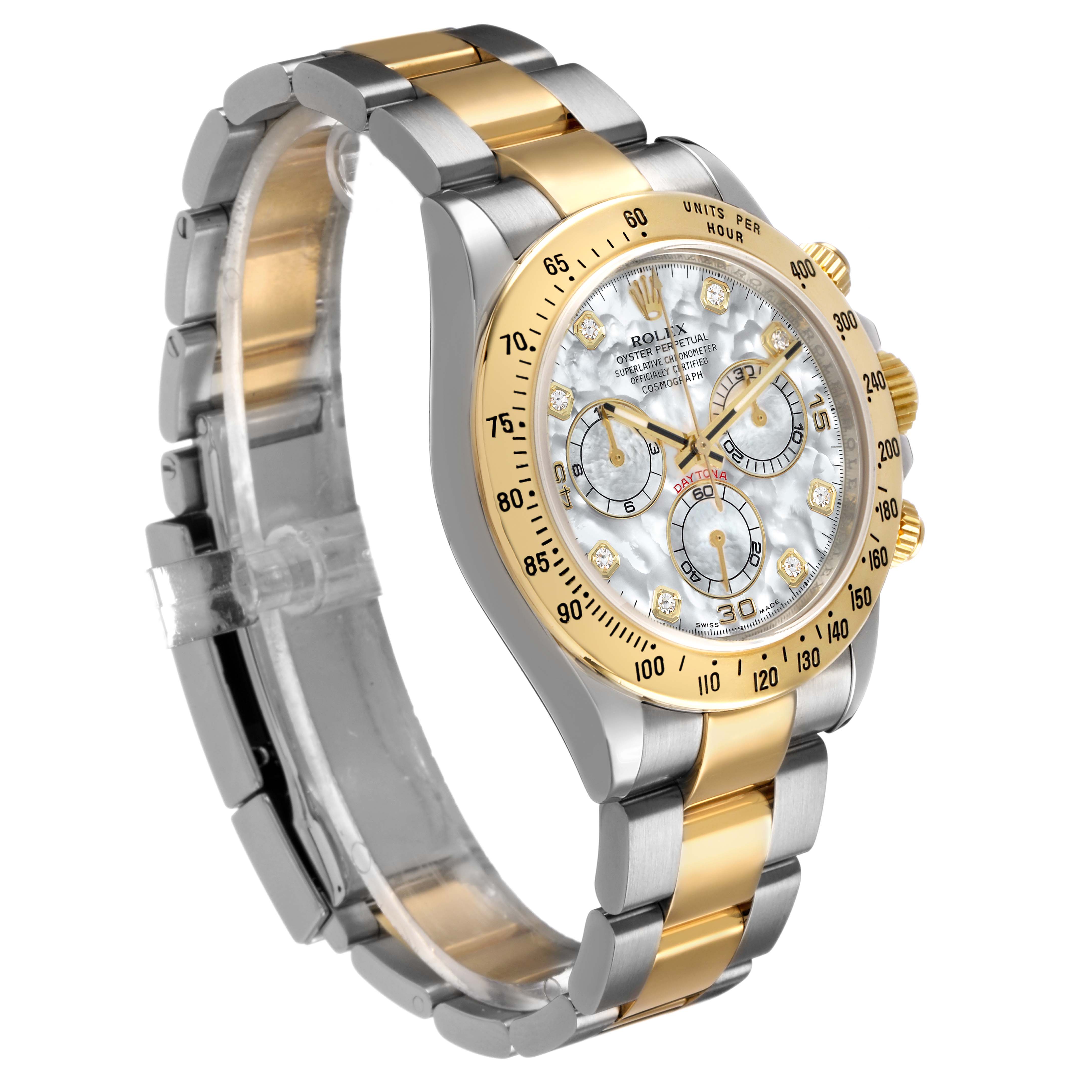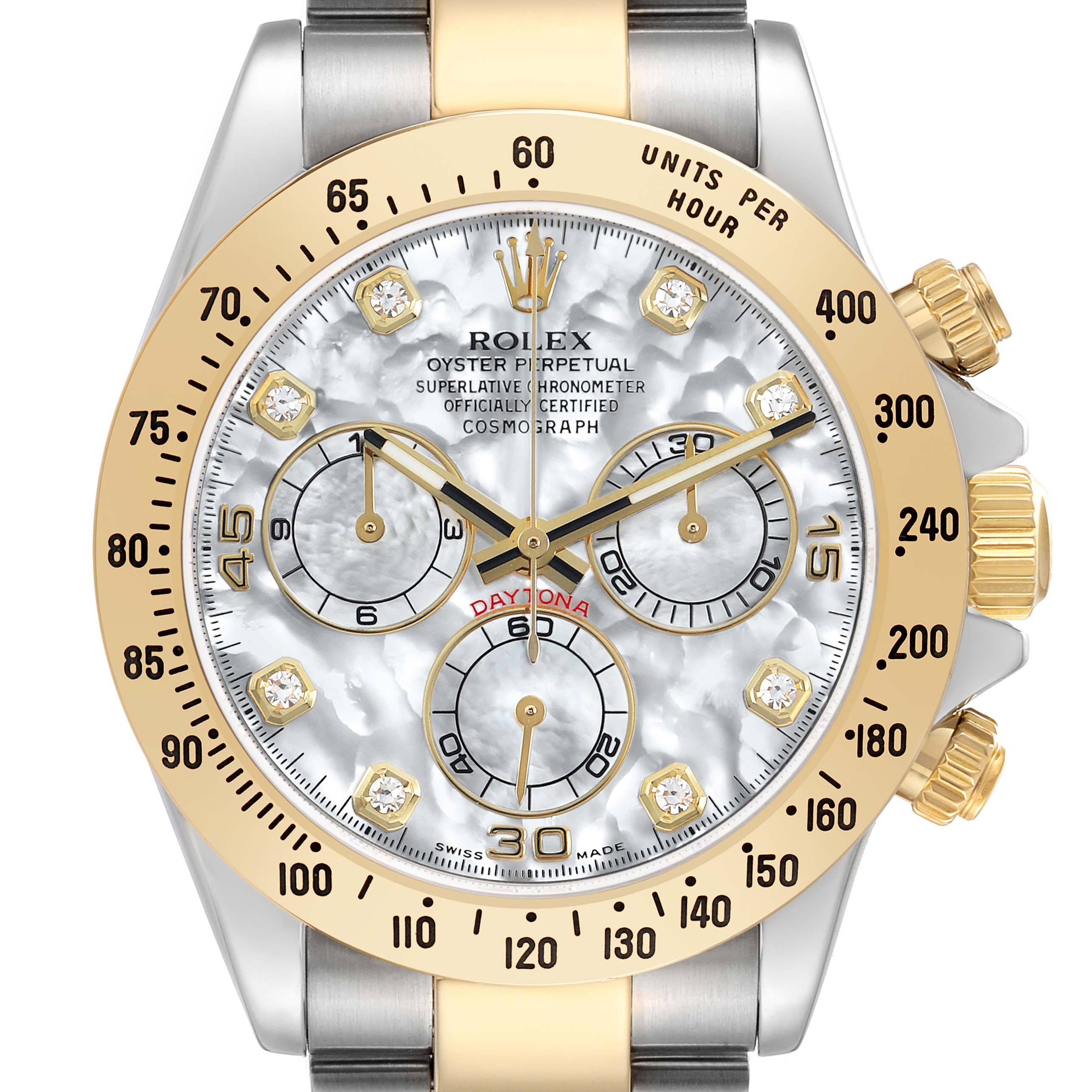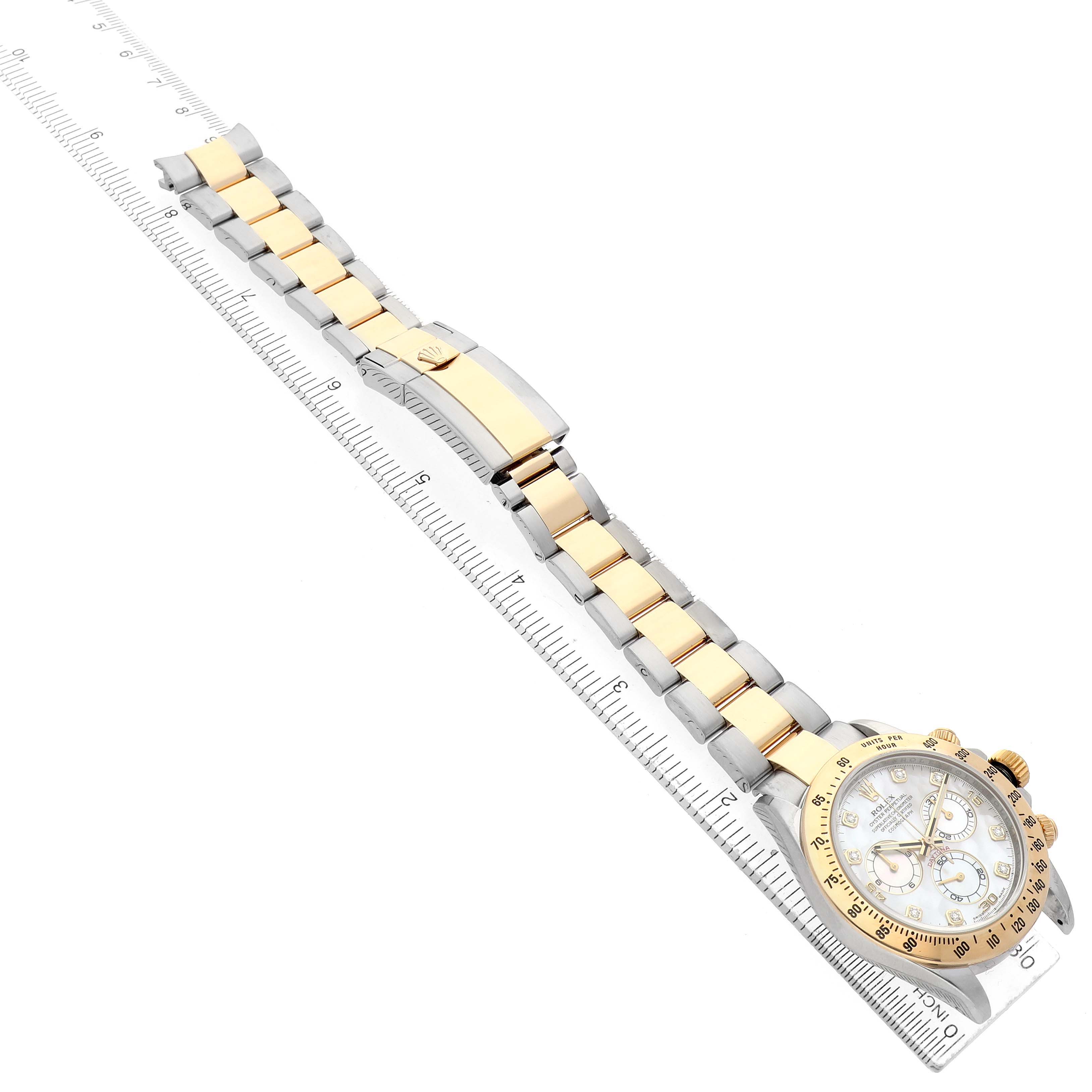 Rolex Daytona MOP Diamond Dial Steel Yellow Gold Mens Watch 116523 Box. Officially certified chronometer automatic self-winding movement. Stainless steel and 18K yellow gold oyster case 40.0 mm in diameter. Special screw-down push buttons. Triplock winding crown protected by the crown guards. Two pushers operate the chronograph functions. Pointed crown guards. Rolex logo on the 18k yellow gold crown. 18K yellow gold bezel engraved with the tachymeter scale. Scratch resistant sapphire crystal. Mother of Pearl dial with original Rolex factory diamond hour markers and yellow gold baton hands. Outer minute and 1/5-second stick markers. Three yellow gold subdials-- running small seconds, 12-hour, and 30-minute chronograph registers. Stainless steel and 18K yellow gold oyster bracelet with a flip-lock clasp. Fits a 7 3/4" wrist.
