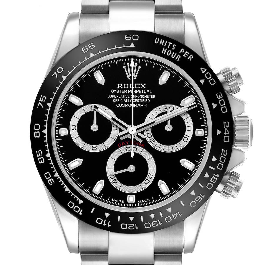 Rolex Daytona Steel Black Dial Mens Watch 116500. Officially certified chronometer automatic self-winding chronograph movement. Stainless steel oyster case 40.0 mm in diameter. Two screw-down pushers operate the chronograph functions. Pointed crown guards. Rolex logo on the screw-down crown. Black monobloc Cerachrom ceramic bezel engraved with the tachymeter scale. Scratch-resistant sapphire crystal. Black dial with luminescent baton hour markers and hands. Three steel-outlined subdials -- running small seconds, 30-minute, and 12-hour chronograph registers. Outer minute and 1/5 second stick markers. Stainless steel oyster bracelet with a flip-lock clasp and easylink micro-adjustment. Fits an 8'' wrist.
