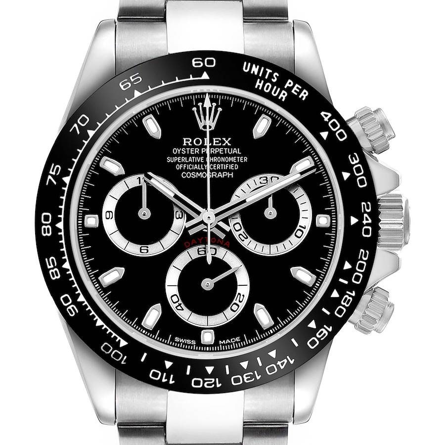 Rolex Daytona Steel Black Dial Mens Watch 116500. Officially certified chronometer automatic self-winding chronograph movement. Stainless steel oyster case 40.0 mm in diameter. Two screw-down pushers operate the chronograph functions. Pointed crown guards. Rolex logo on the screw-down crown. Black monobloc Cerachrom ceramic bezel engraved with the tachymeter scale. Scratch-resistant sapphire crystal. Black dial with luminescent baton hour markers and hands. Three steel-outlined subdials -- running small seconds, 30-minute, and 12-hour chronograph registers. Outer minute and 1/5 second stick markers. Stainless steel oyster bracelet with a flip-lock clasp and easylink micro-adjustment. Fits an 7.5'' wrist.