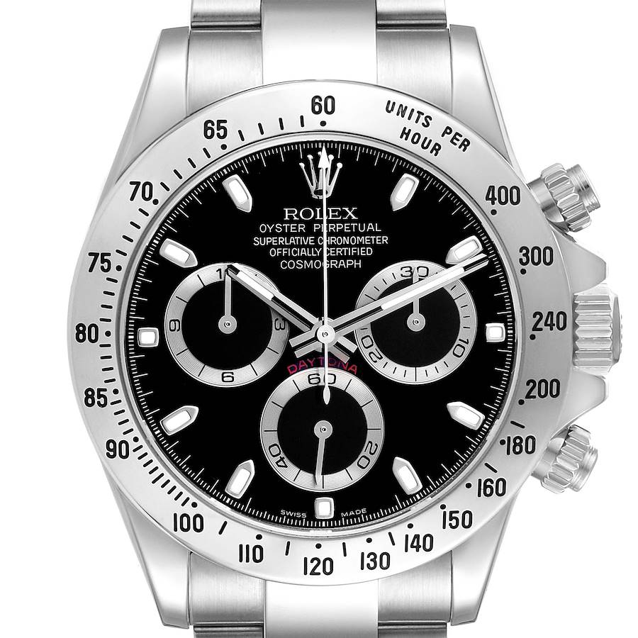 Rolex Daytona Steel Black Dial Mens Watch 116520. Officially certified chronometer automatic self-winding movement. Stainless steel case 40 mm in diameter. Special screw-down push buttons. Polished stainless steel bezel with engraved tachymeter scale. Scratch-resistant sapphire crystal. Black dial with luminous hands and hour markers. Three stainless steel outlined chronograph subdials -- running small seconds, 30 minutes, and 12 hours. Stainless steel oyster bracelet with flip-lock clasp. Fits a 7.5" wrist.