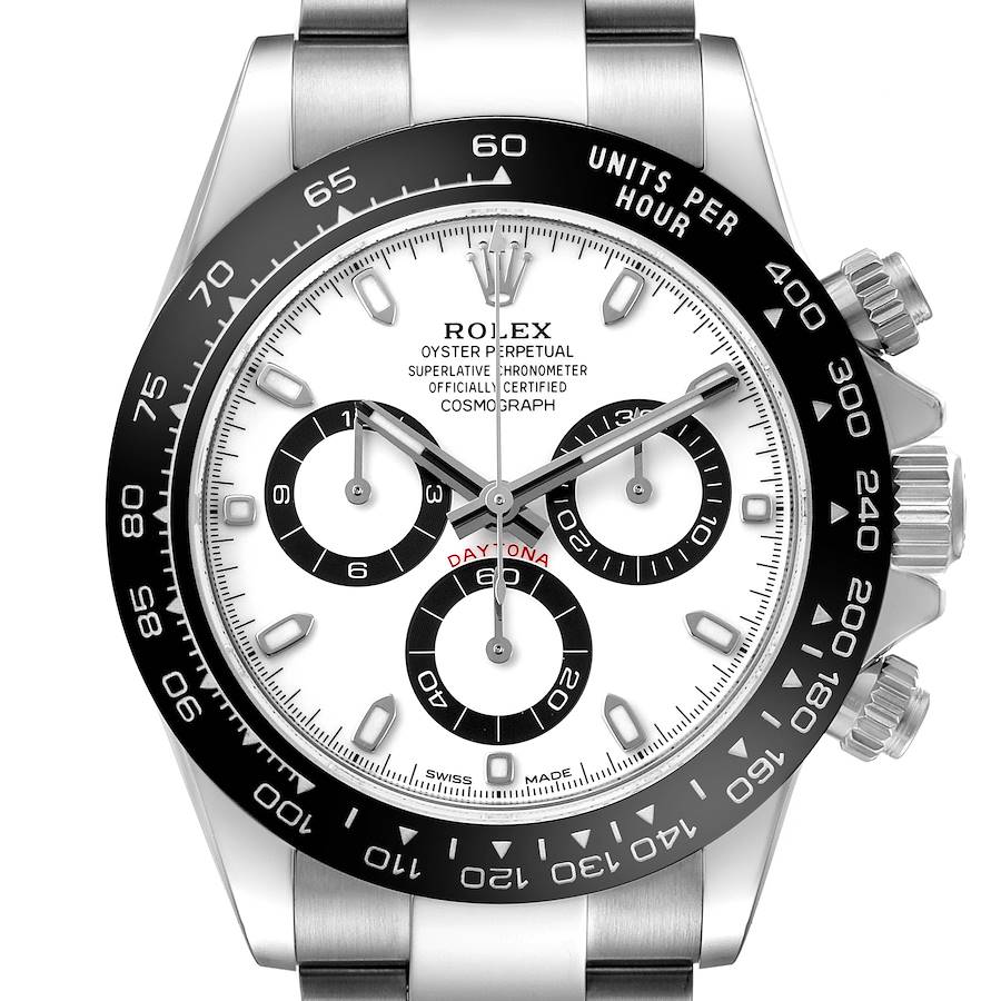 Rolex Daytona Steel White Panda Dial Ceramic Bezel Mens Watch 116500LN Box Card. Officially certified chronometer automatic self-winding chronograph movement. Stainless steel oyster case 40.0 mm in diameter. Two screw-down pushers operate the chronograph function. Pointed crown guards. Rolex logo on the crown. Black monobloc Cerachrom ceramic bezel engraved with the tachymeter scale. Scratch resistant sapphire crystal. White "Panda" dial with luminescent baton hour markers and hands. Three black-outlined subdials -- running small seconds, 30-minutes, and 12-hour chronograph registers. Outer minute and 1/5-second stick markers. Stainless steel oyster bracelet with flip-lock clasp and easylink micro-adjustment. Fits an 8'' wrist.