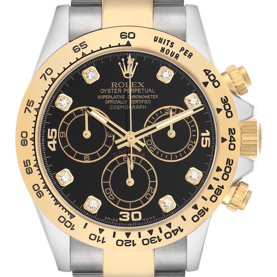 Rolex Daytona Steel Yellow Gold Diamond Mens Watch 116503 Box Card. Officially certified chronometer automatic self-winding movement. Rhodium-plated, oeil-de-perdrix decoration, straight line lever escapement, monometallic balance adjusted to 5 positions, shock absorber, self-compensating free sprung Breguet balance spring, Microstella regulating screws, hack mechanism. Stainless steel and 18K yellow gold case 40.0 mm in diameter. Special screw-down push buttons. Triplock winding crown protected by the crown guards. 18k yellow gold tachymeter engraved bezel. Scratch resistant sapphire crystal. Black dial with original Rolex factory diamond hour markers. Outer 1/5th seconds track. Gold outlined subdials --60 seconds, 12-hour, and 30-minute registers. Luminous yellow gold and black baton hands. Stainless steel and 18k yellow gold oyster bracelet with flip-lock clasp.Fits 7 3/4" wrist.