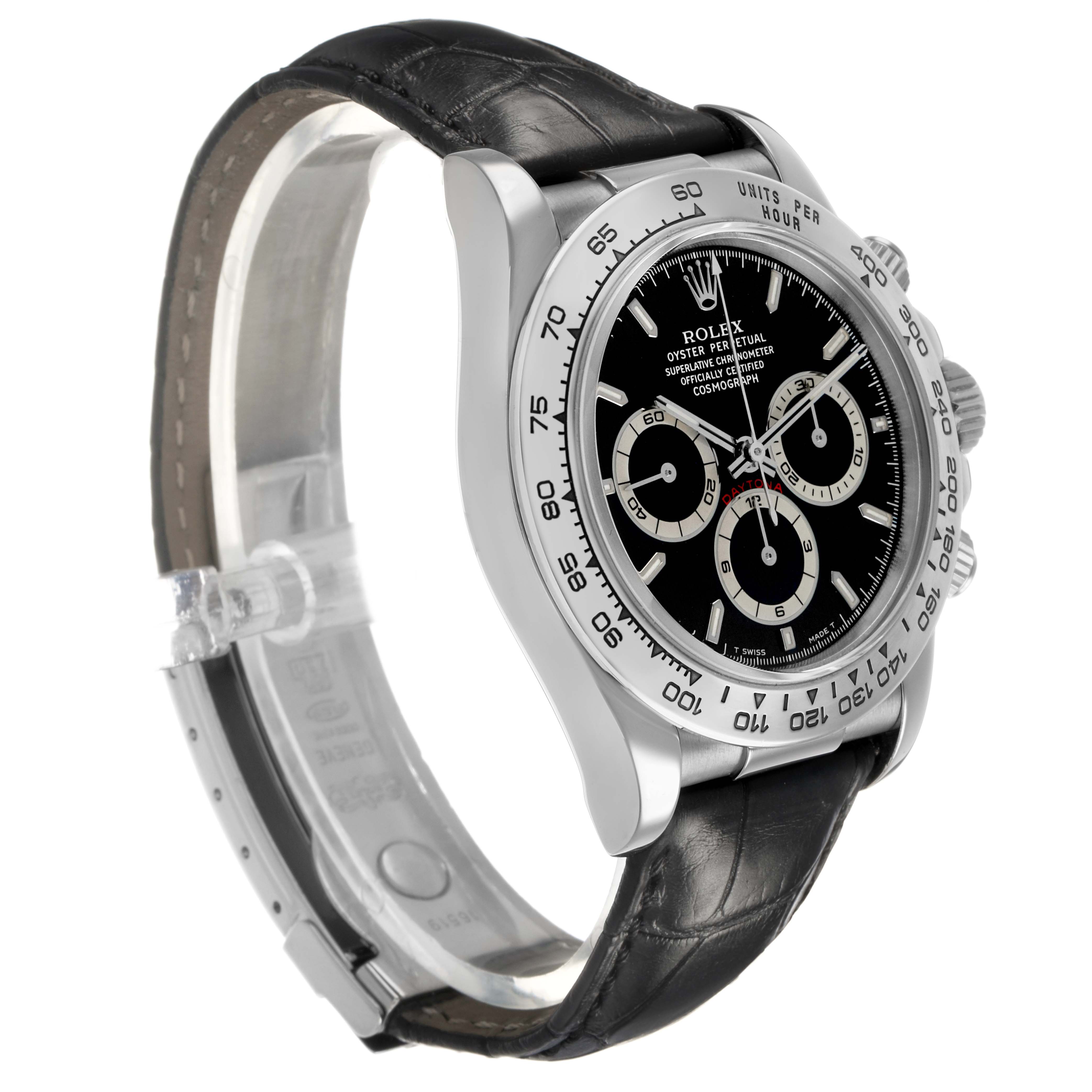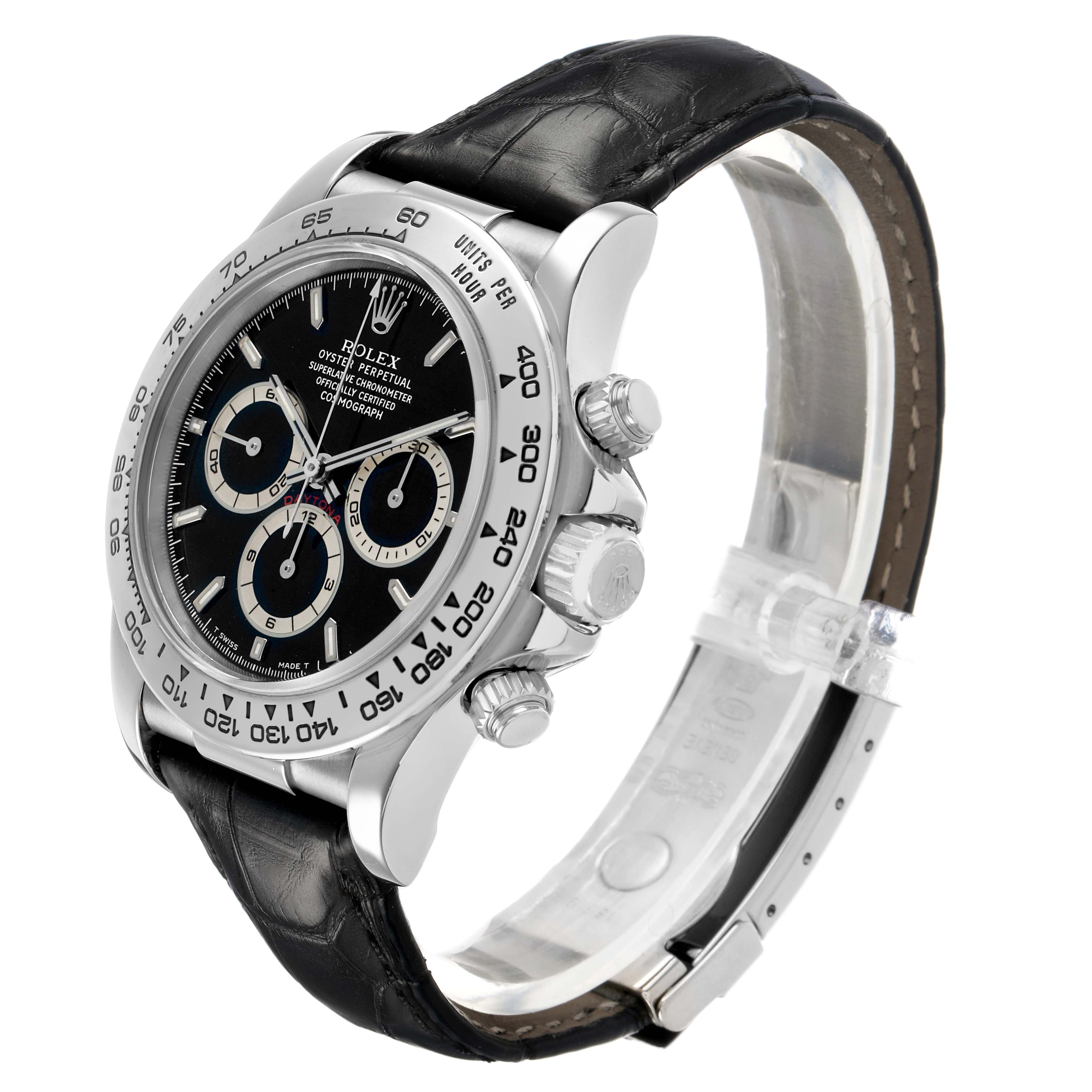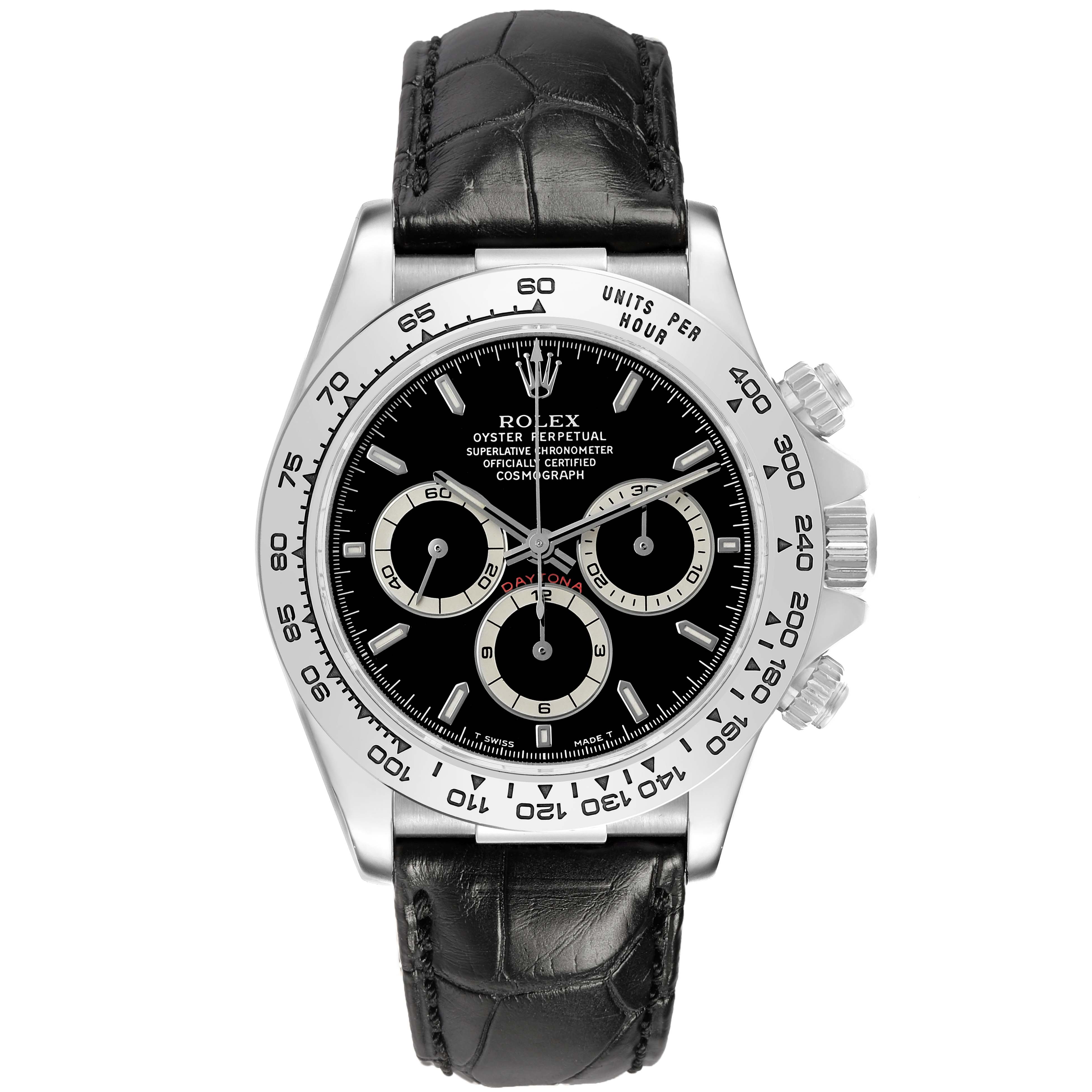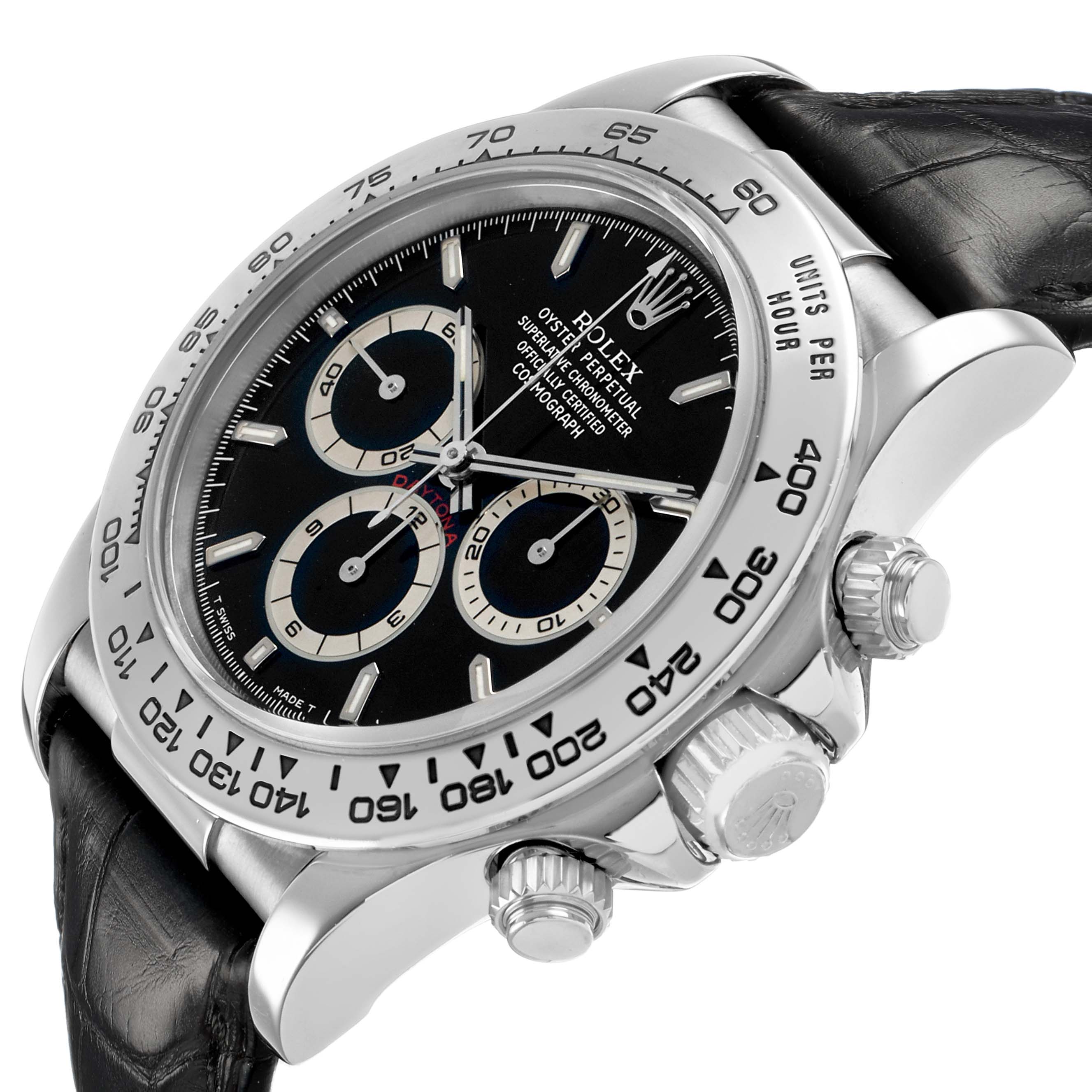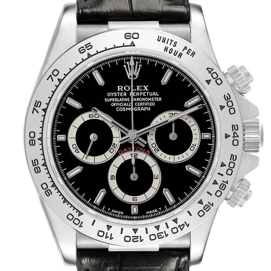 Rolex Daytona White Gold Black Dial Mens Watch 16519 Box Papers. Officially certified chronometer self-winding movement. 18K white gold oyster case 40.0 mm in diameter. Two pushers operate the chronograph functions. Rolex logo on the crown. 18K white gold bezel engraved with the tachymeter scale. Scratch resistant sapphire crystal. Black dial with luminescent hour markers and baton hands. Three subdials: running small seconds and the 30-minute and 12-hour chronograph registers. Black leather strap with an 18K white gold flip-lock deployant clasp.