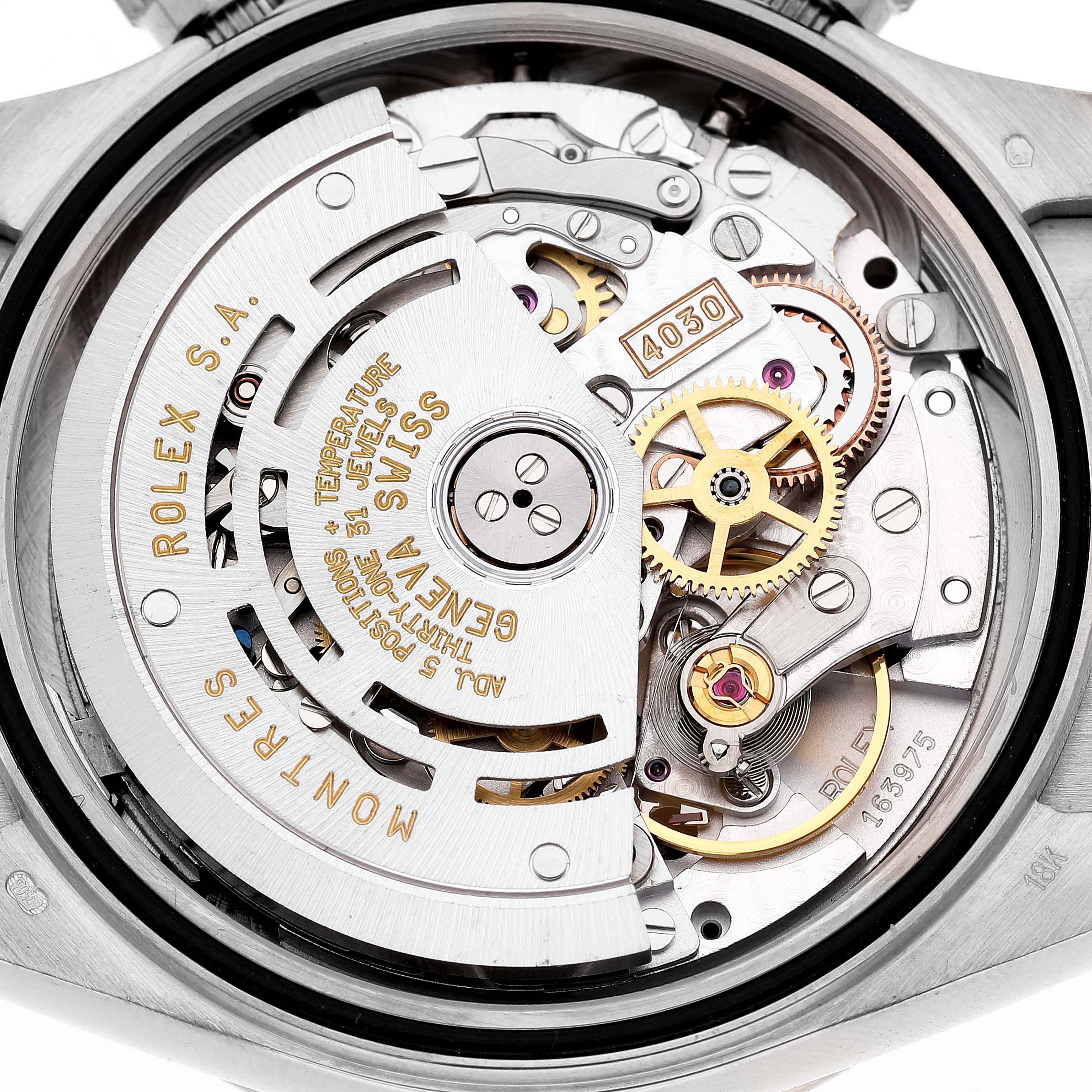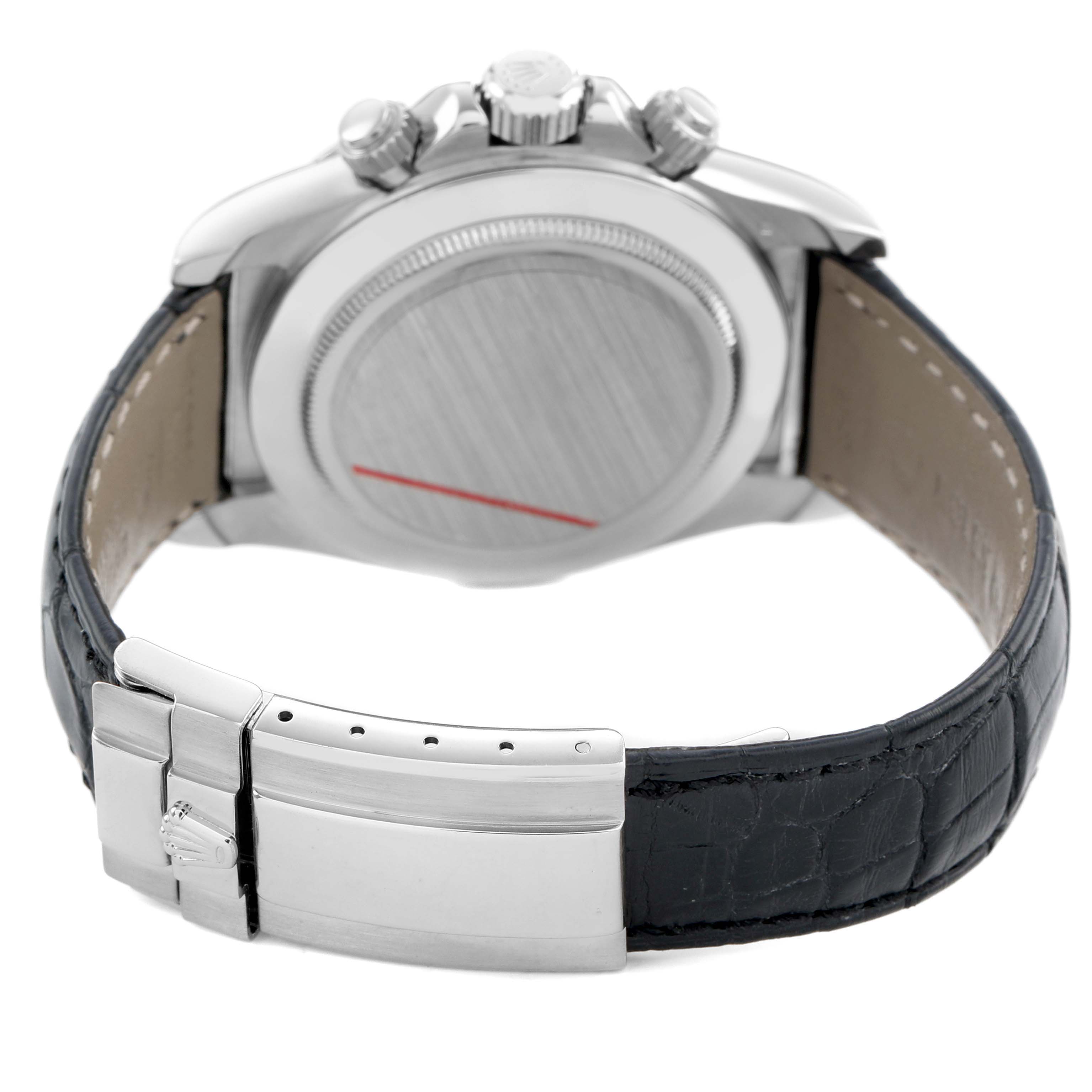 | Case: | 18K white gold oyster case 40.0 mm in diameter. Two pushers operate the chronograph functions. Rolex logo on the crown. |