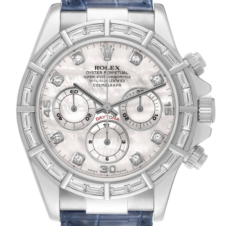 Rolex Daytona White Gold Mother of Pearl Baguette Diamond Mens Watch 16589. Officially certified chronometer automatic self-winding chronograph movement. 18K white gold case 40.0 mm in diameter. Screwed-down case back, buttons and crown, Triplock winding crown protected by the crown guard. 18k white gold original Rolex factory baguette diamond bezel. Scratch resistant sapphire crystal. Mother of pearl dial with baton white gold hands and original Rolex factory diamond hour markers. Minute markers around the outer rim. Three chronograph sub-dials: 60 second, 30 minute and 1/10th of a second. Blue leather strap with 18K white gold deployent clasp.