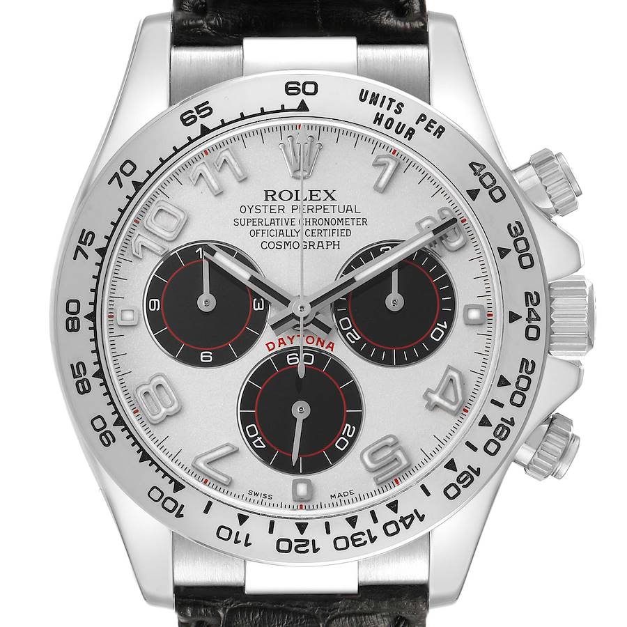 Rolex Daytona White Gold Silver Racing Dial Mens Watch 116519. Officially certified chronometer self-winding movement. 18K white gold case 40.0 mm in diameter. Special screw-down push buttons. 18K white gold tachymeter engraved bezel. Scratch resistant sapphire crystal. Silver racing dial with Arabic numerals and luminous hands. Three black chronograph sub-dials: 60 second, 30 minute and 1/10th of a second. Custom black leather strap with 18K white gold deployant buckle.