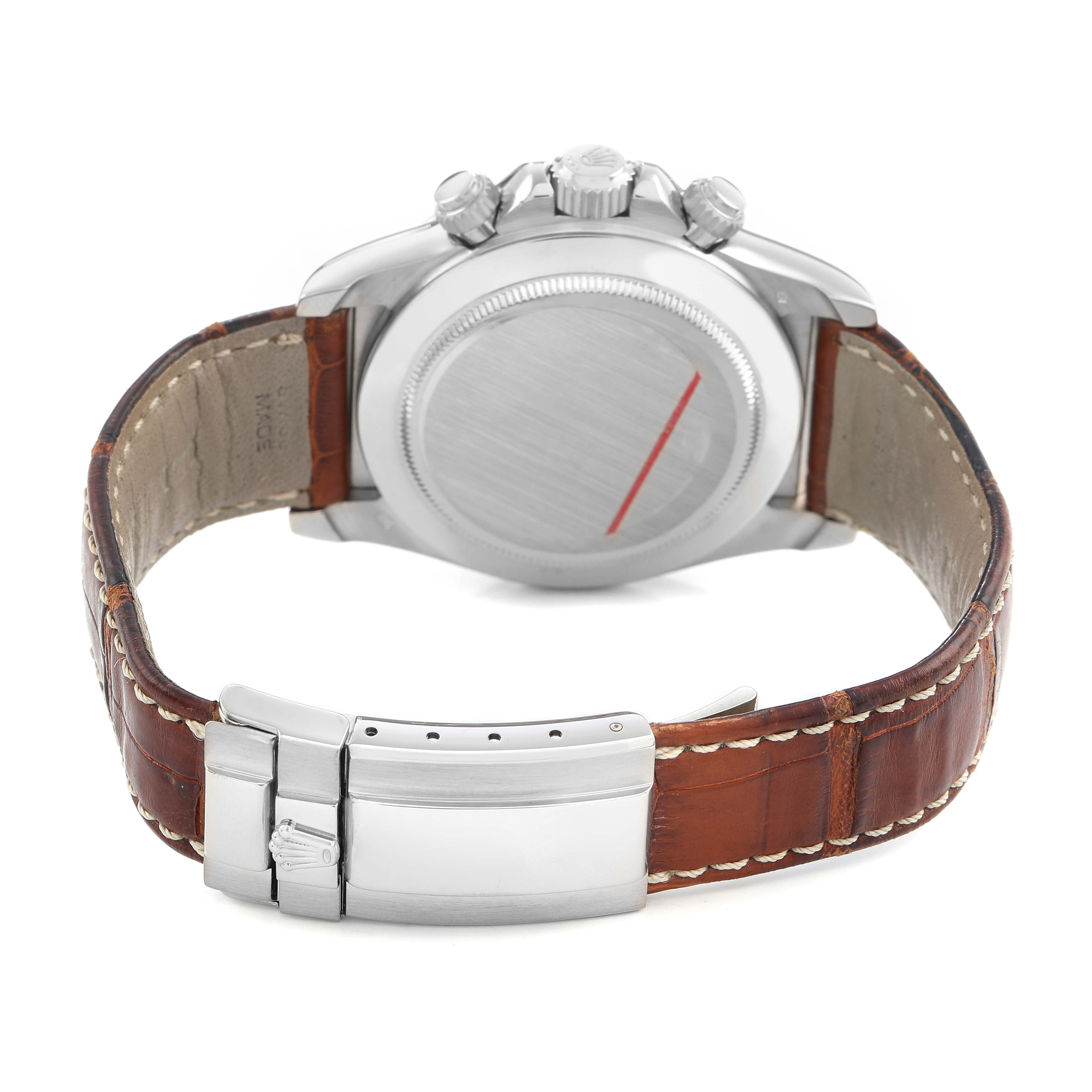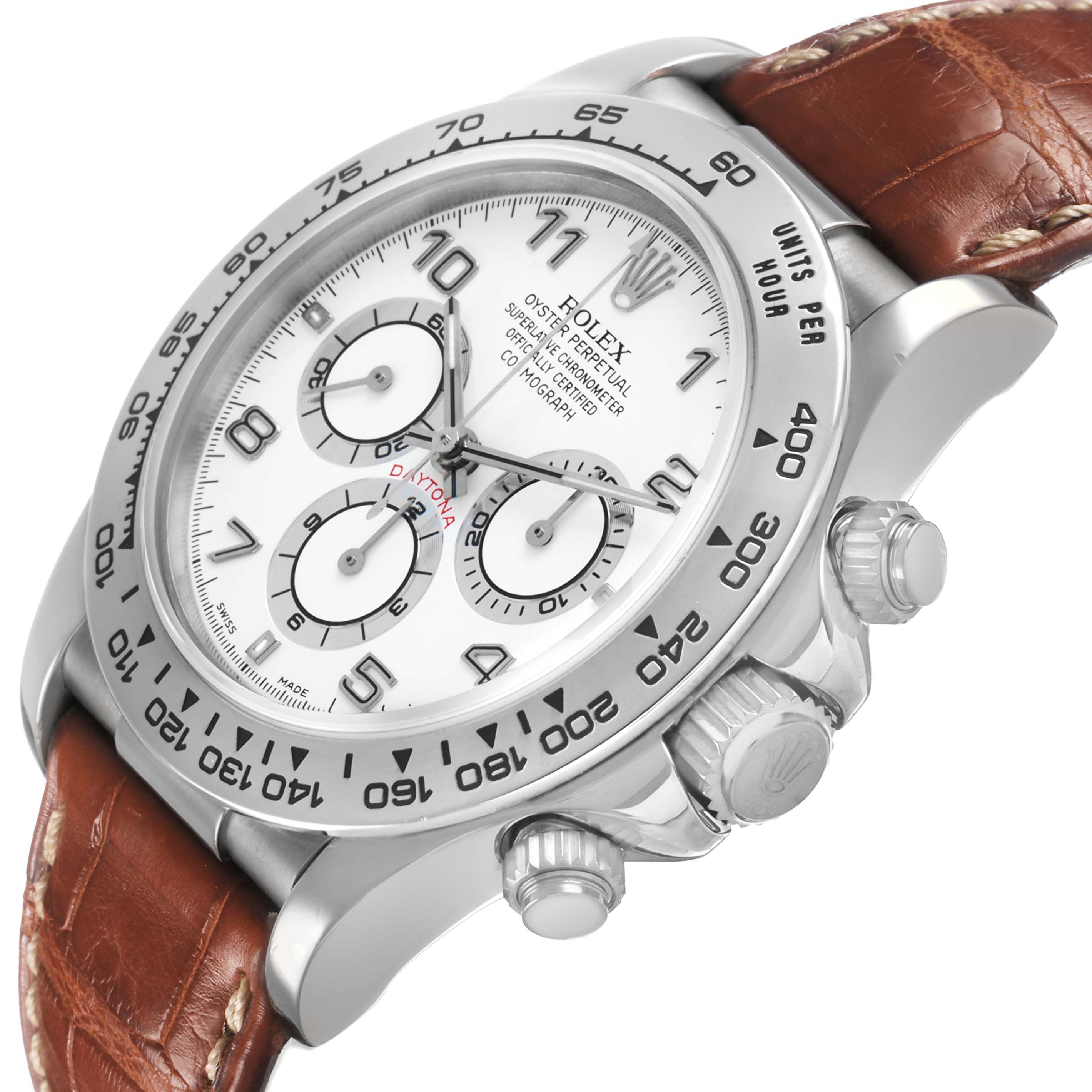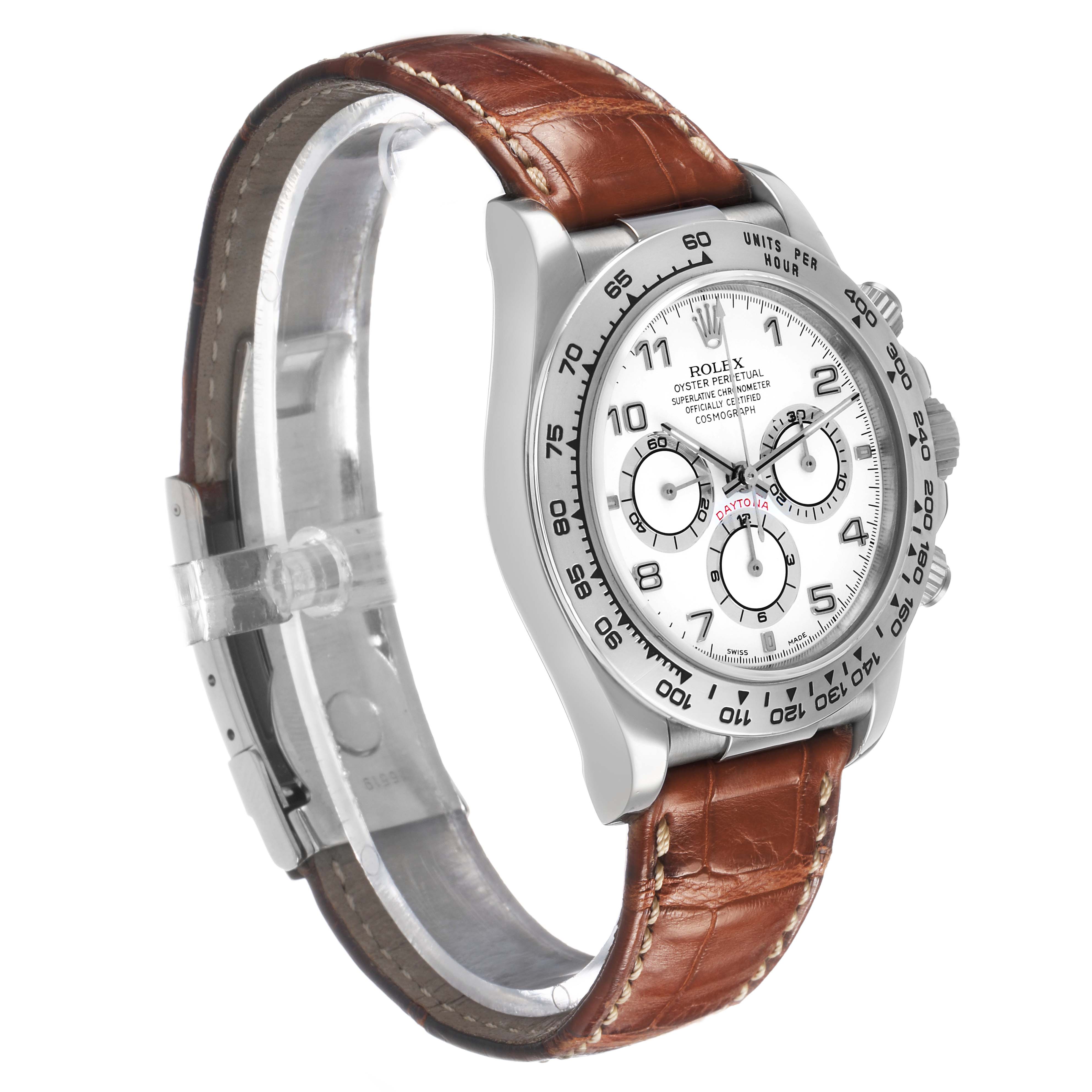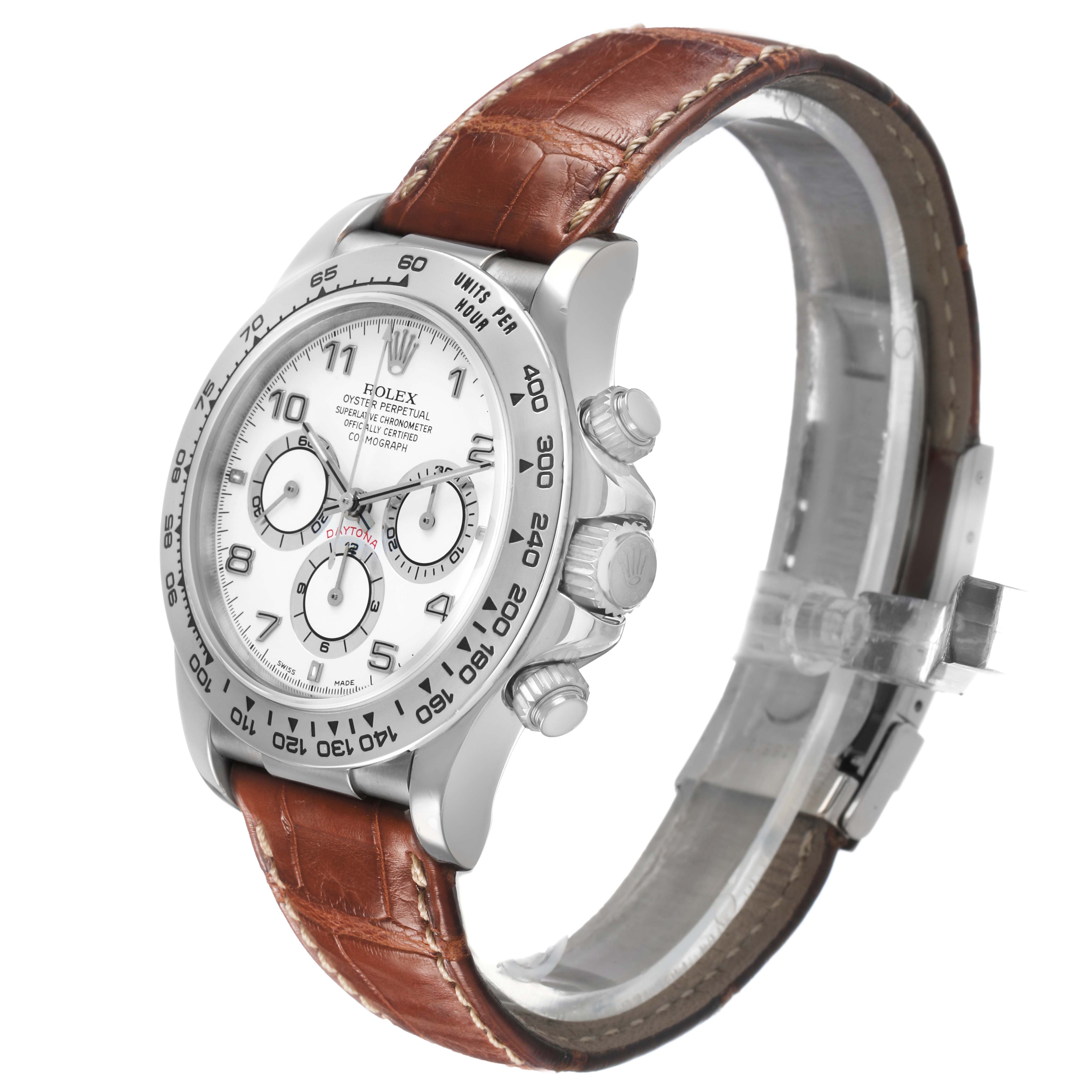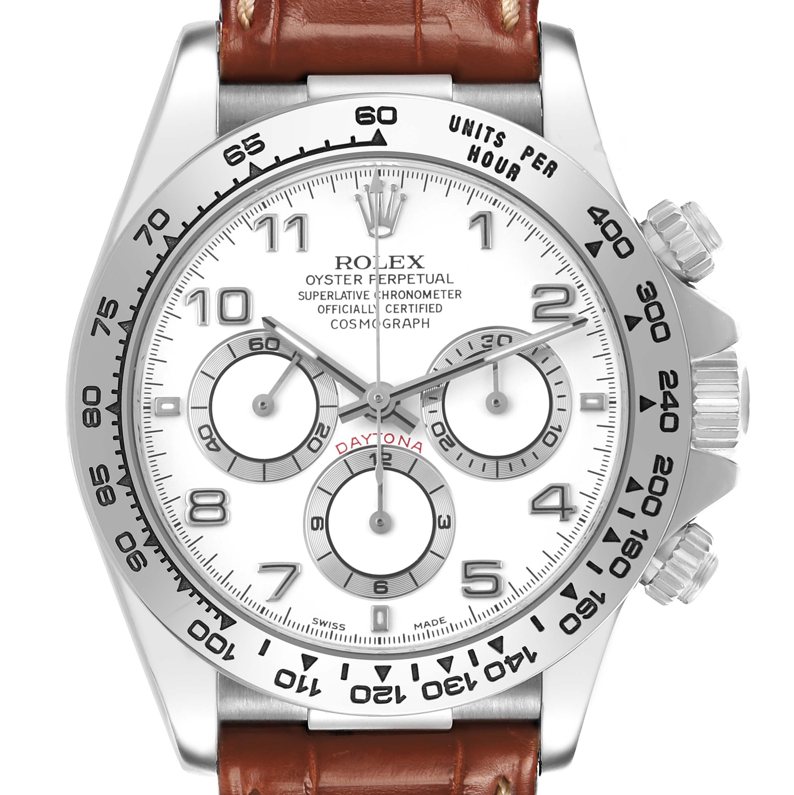 Rolex Daytona White Gold White Dial Mens Watch 16519 Box Papers. Officially certified chronometer self-winding movement. 18K white gold oyster case 40.0 mm in diameter. Two pushers operate the chronograph functions. Rolex logo on the crown. 18K white gold bezel engraved with the tachymeter scale. Scratch resistant sapphire crystal. White dial with raised 18K white gold Arabic numeral hour markers and luminescent baton hands. Three subdials: running small seconds and the 30-minute and 12-hour chronograph registers. Brown leather strap with an 18K white gold flip-lock deployant clasp.