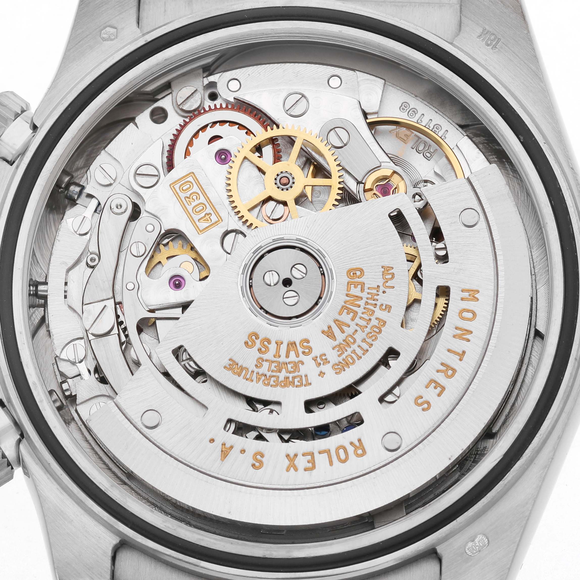 | Case: | 18K white gold oyster case 40.0 mm in diameter. Two pushers operate the chronograph functions. Rolex logo on the crown. |