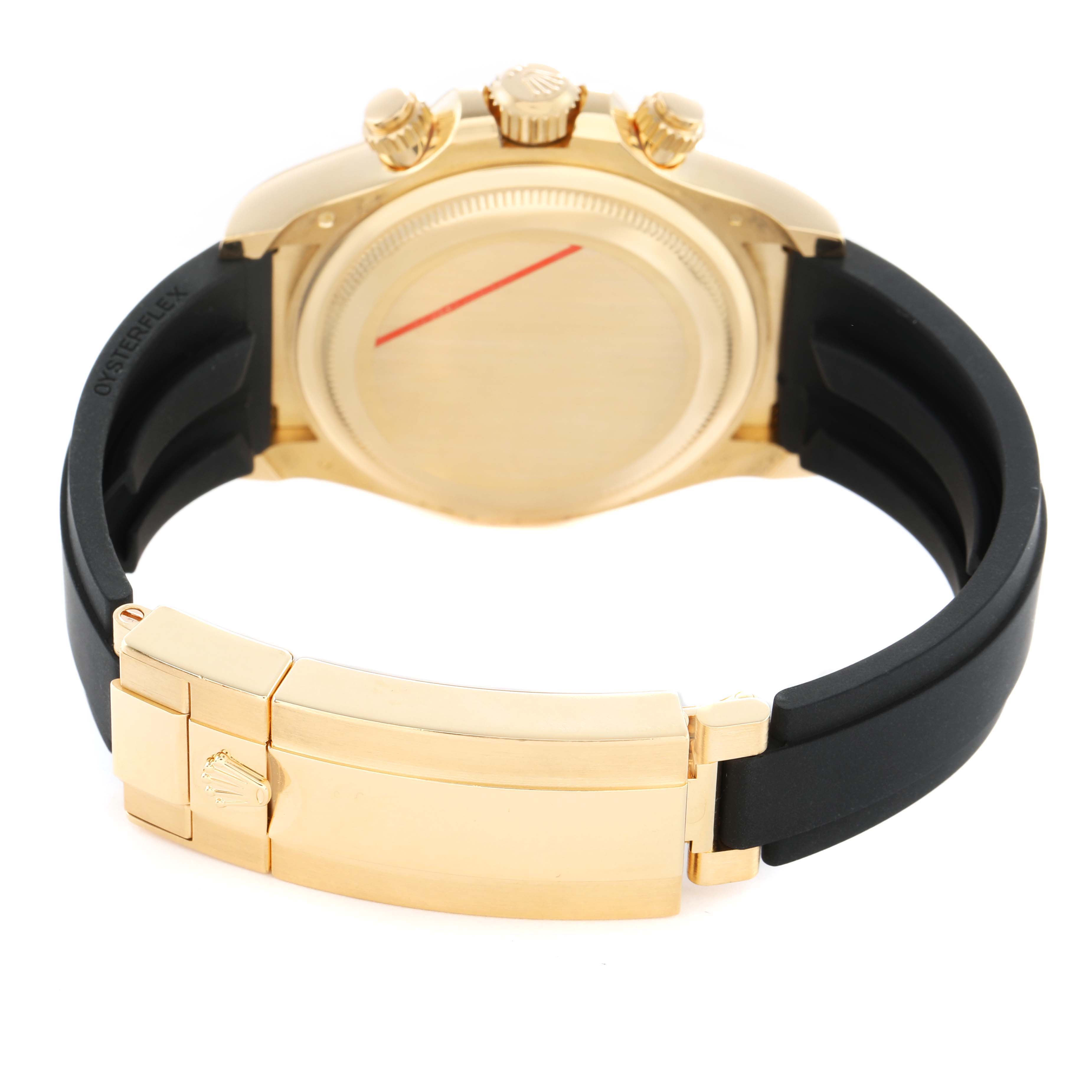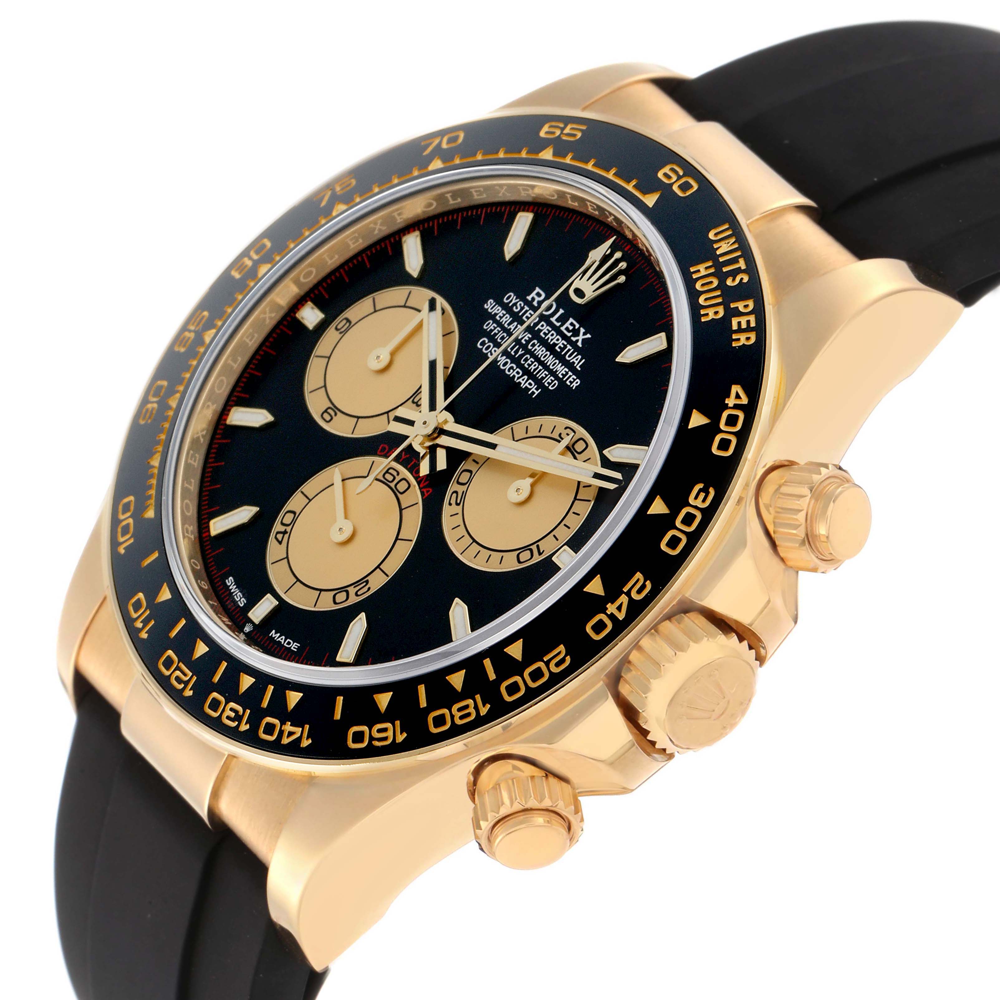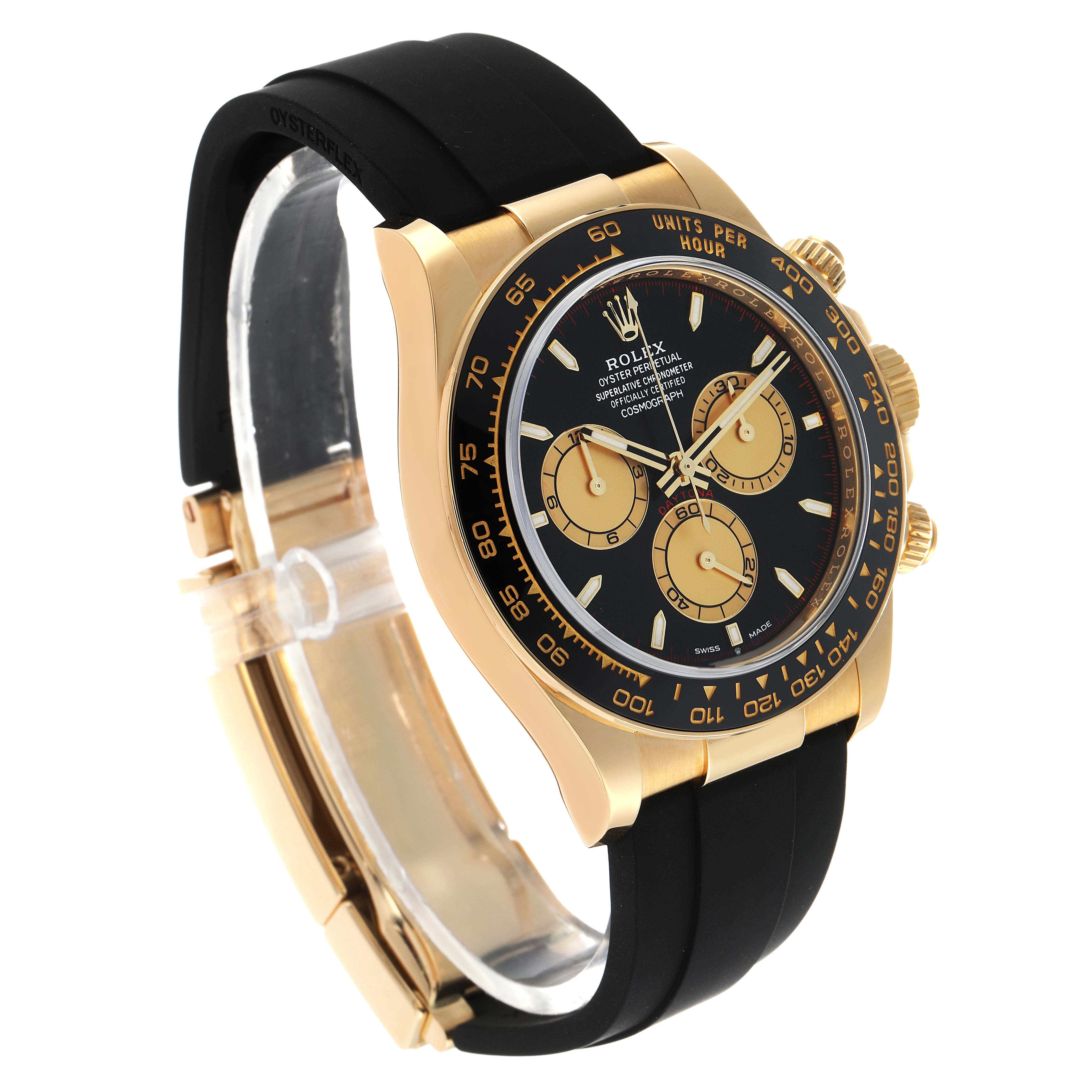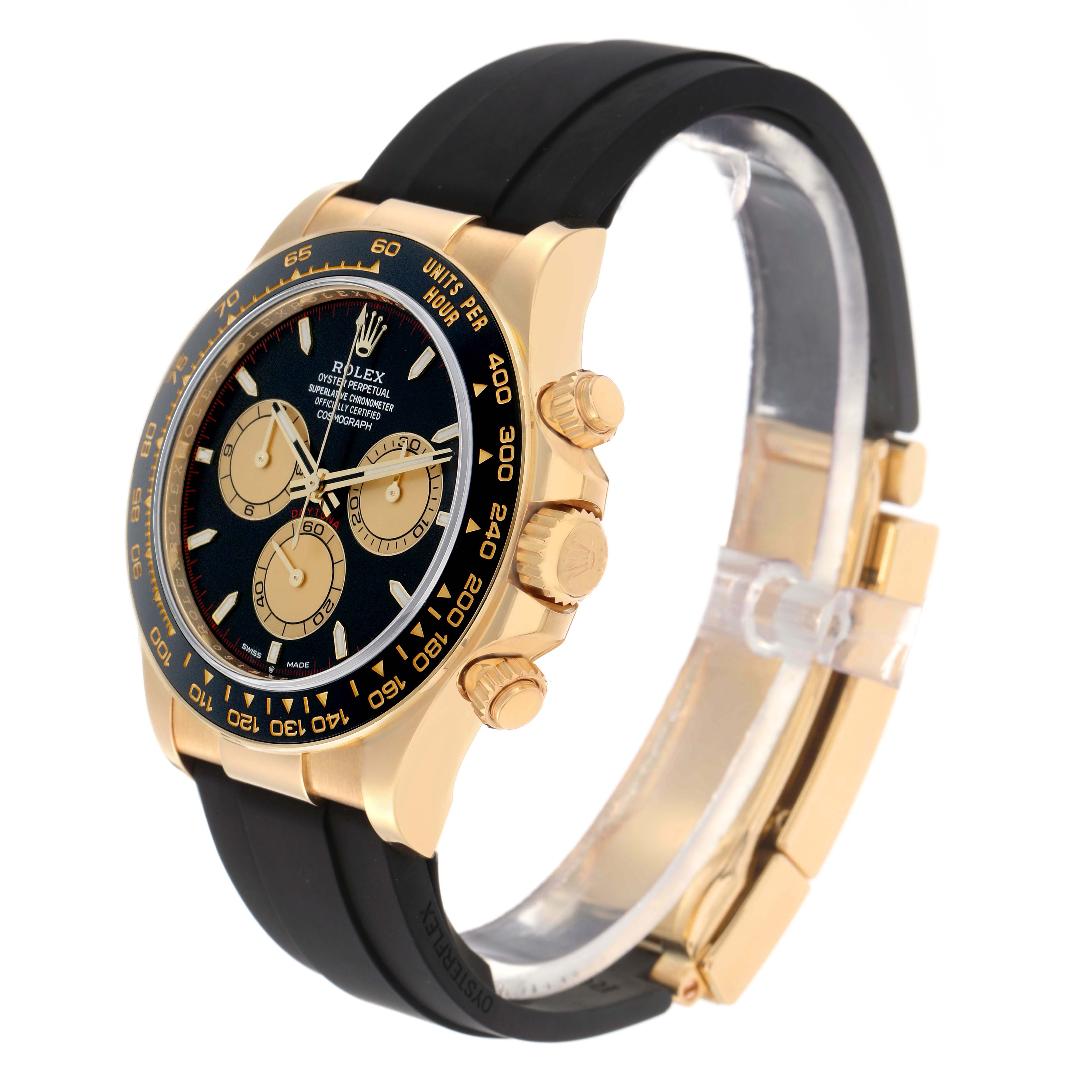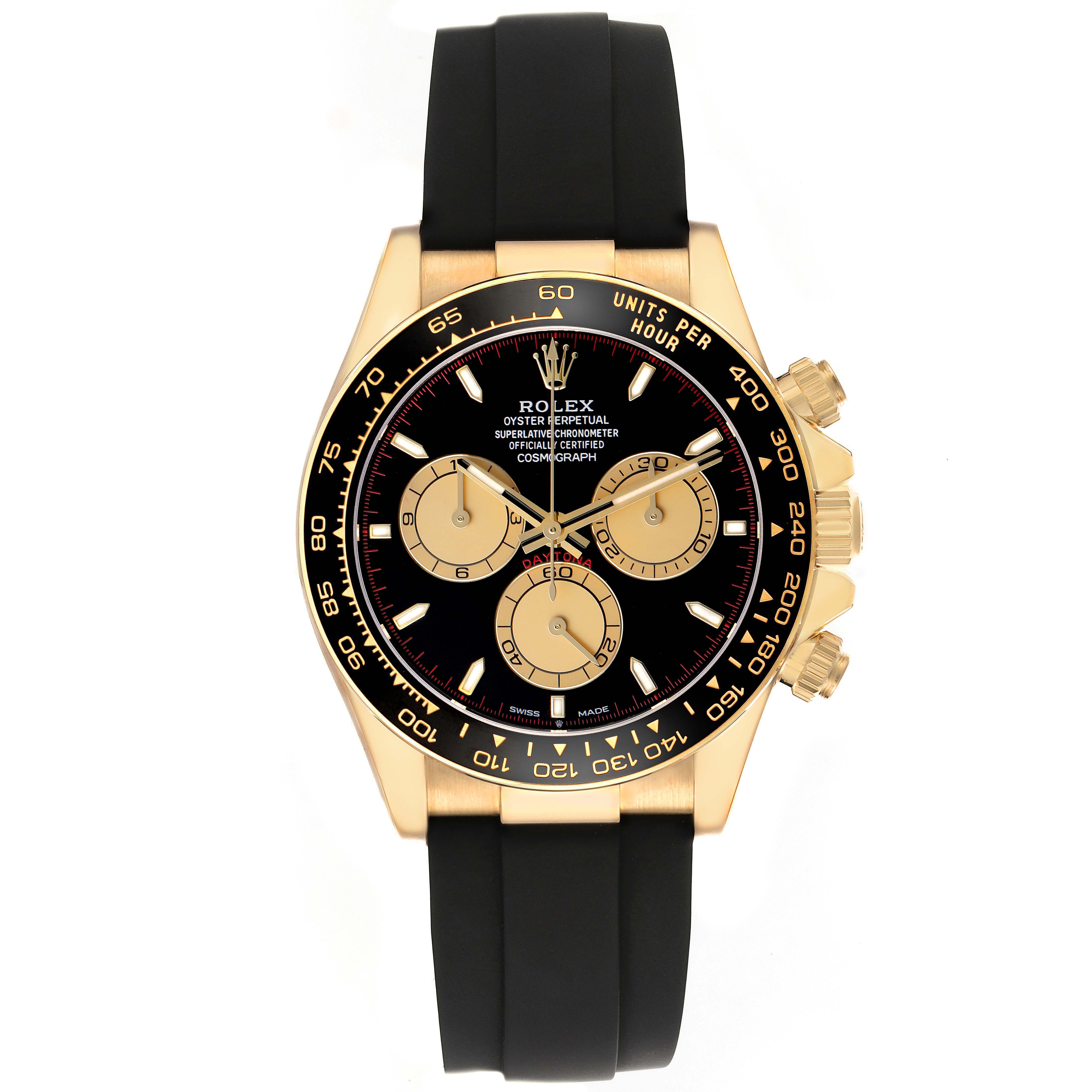Rolex Daytona Yellow Gold Black Dial Oysterflex Mens Watch 126518. Officially certified chronometer automatic self-winding movement. 18K yellow gold oyster case 40.0 mm in diameter. Special screw-down yellow gold push buttons that operate the chronograph function. Pointed crown guards. Rolex logo on the 18k yellow gold crown. 18K yellow gold black bezel with gold outlined tachymeter scale. Scratch resistant sapphire crystal. Intense black dial with yellow gold luminescent baton hands and hour markers. Three yellow gold outlined chronograph subdials -- running small seconds at 6 o'clock, 30-minutes at 3 o'clock, and 12-hours at 9 o'clock. Black oysterflex strap with an 18K yellow gold flip-lock clasp.