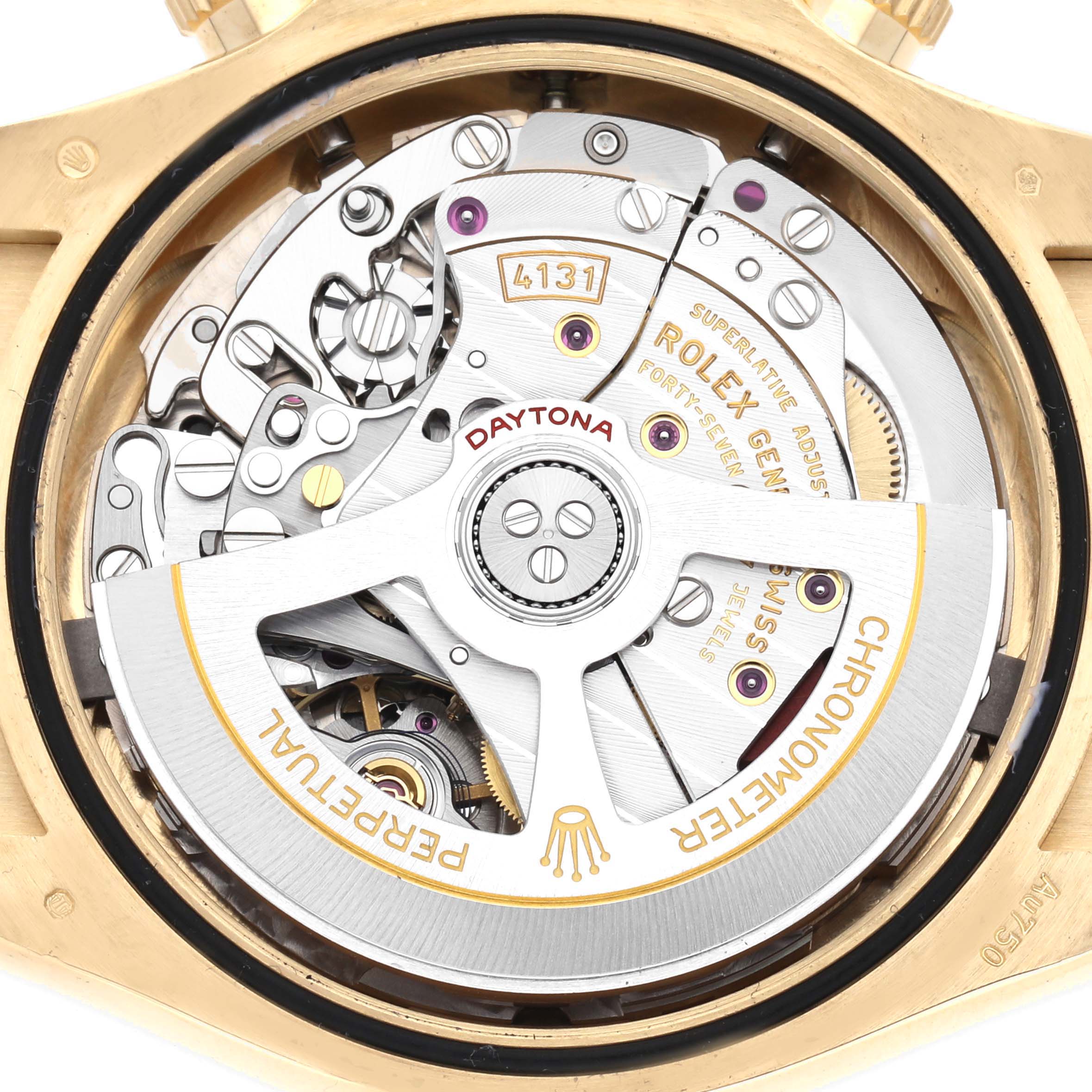 | Case: | 18K yellow gold oyster case 40.0 mm in diameter. Special screw-down yellow gold push buttons that operate the chronograph function. Pointed crown guards. Rolex logo on the 18k yellow gold crown. |