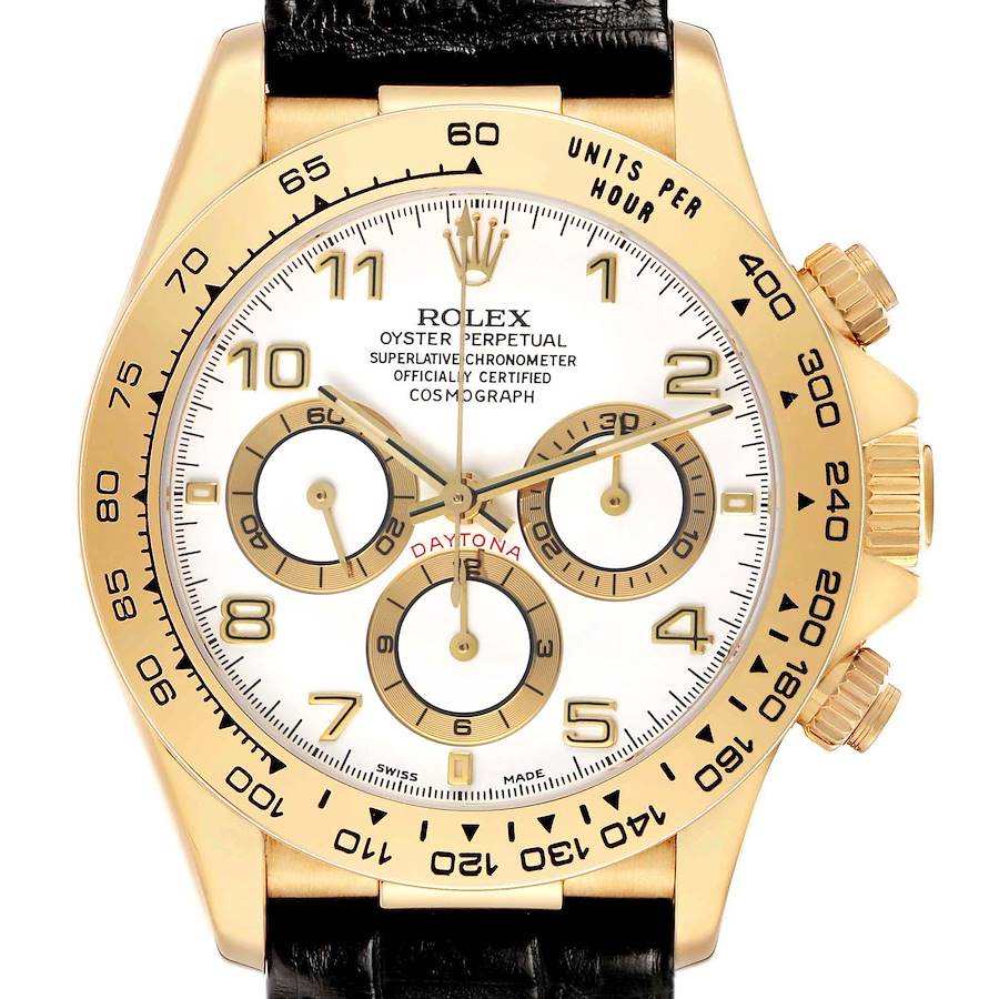 Rolex Daytona Yellow Gold White Dial Mens Watch 16518. Officially certified chronometer automatic self-winding movement. Chronograph function. 18K yellow gold oyster case 40.0 mm in diameter. Special screw-down push buttons. Rolex logo on the 18k yellow gold crown. 18K yellow gold tachymeter engraved bezel. Scratch resistant sapphire crystal. White dial with raised yellow gold Arabic numeral hour markers and yellow gold baton hands. Three black-outlined chronograph subdials -- running small seconds at 3 o'clock, 12-hours at 6 o'clock, and 60 minutes at 9 o'clock. Black leather strap with an 18K yellow gold deployant buckle.