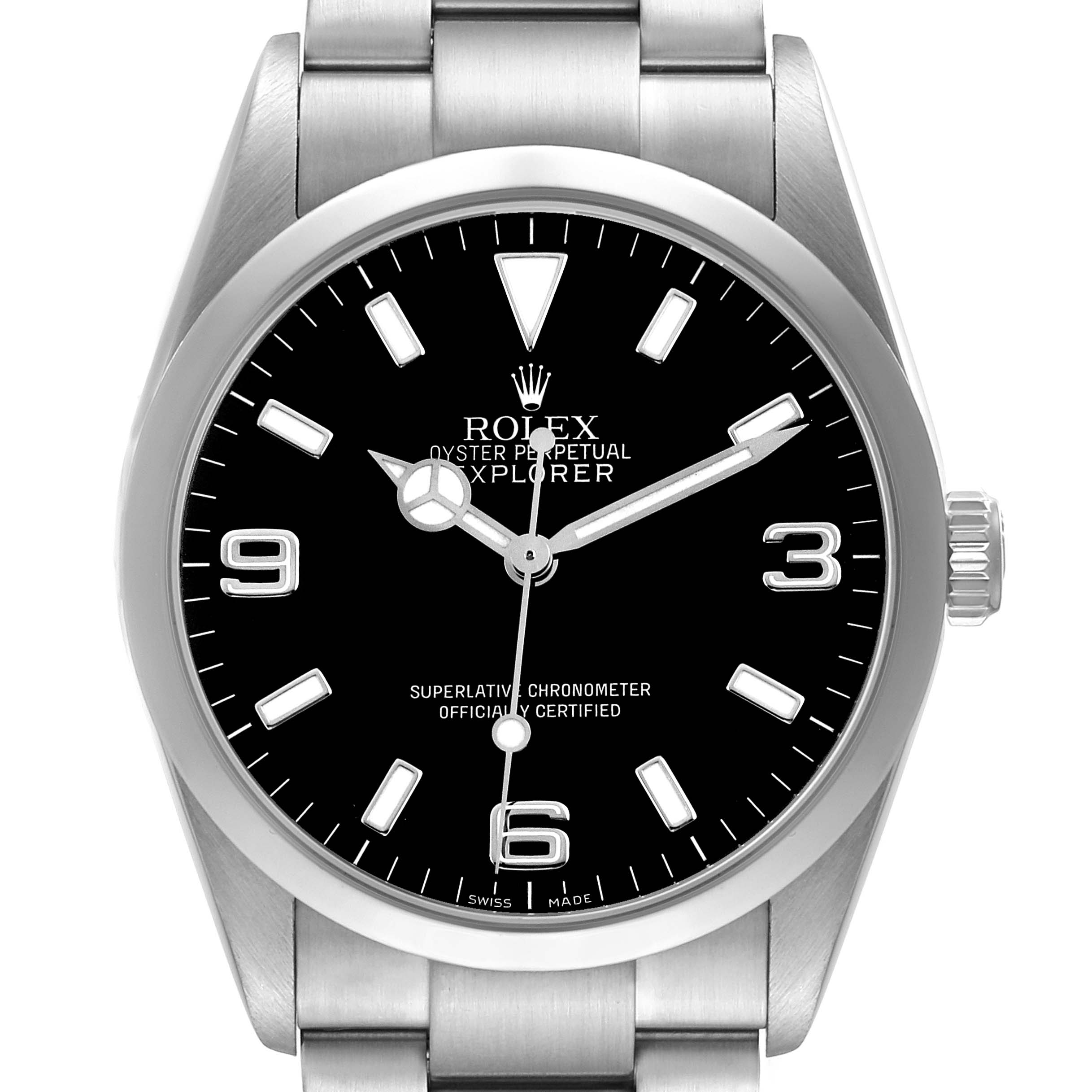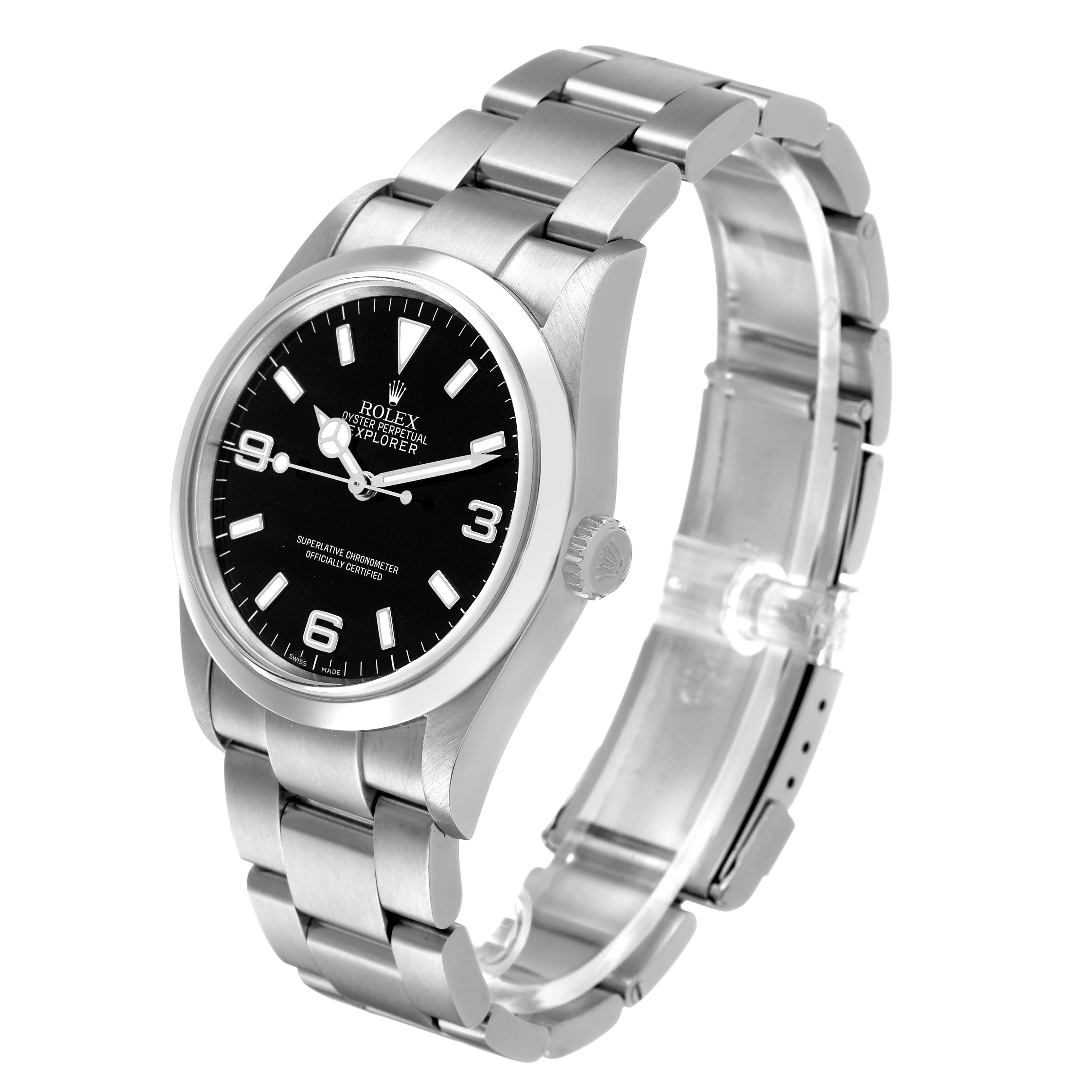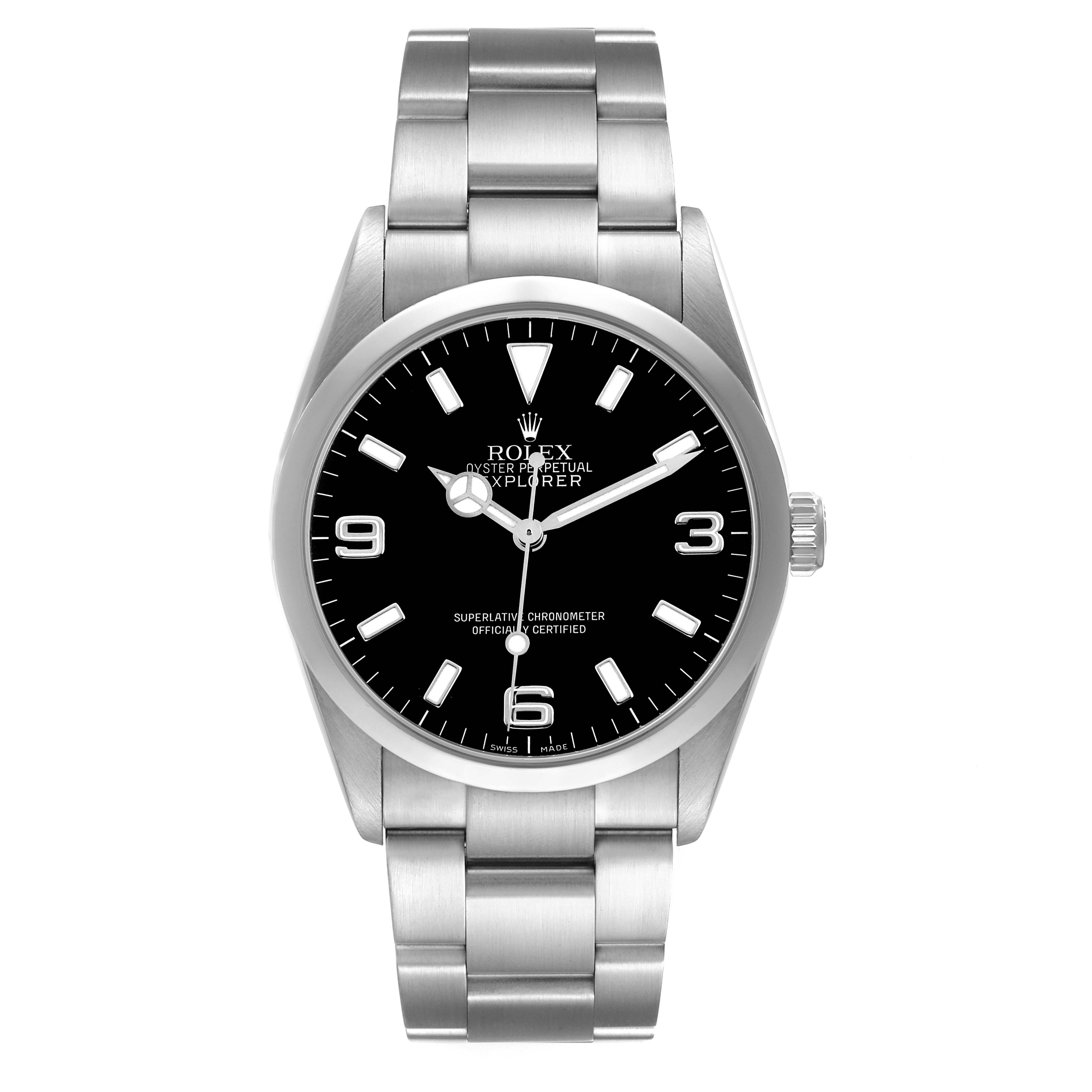Rolex Explorer I 36 Black Dial Steel Mens Watch 114270. Officially certified chronometer automatic self-winding movement. Stainless steel oyster case 36.0 mm in diameter. Rolex logo on the crown. Stainless steel smooth bezel. Scratch resistant sapphire crystal. Black dial with luminescent baton hour markers and Mercedes hands. Arabic numeral hour markers at 3, 6, and 9 o'clock. Luminescent lollipop-tipped centre seconds hand. Outer stick minute markers. Stainless steel oyster bracelet with a flip-lock clasp. Fits a 7 1/2" wrist.