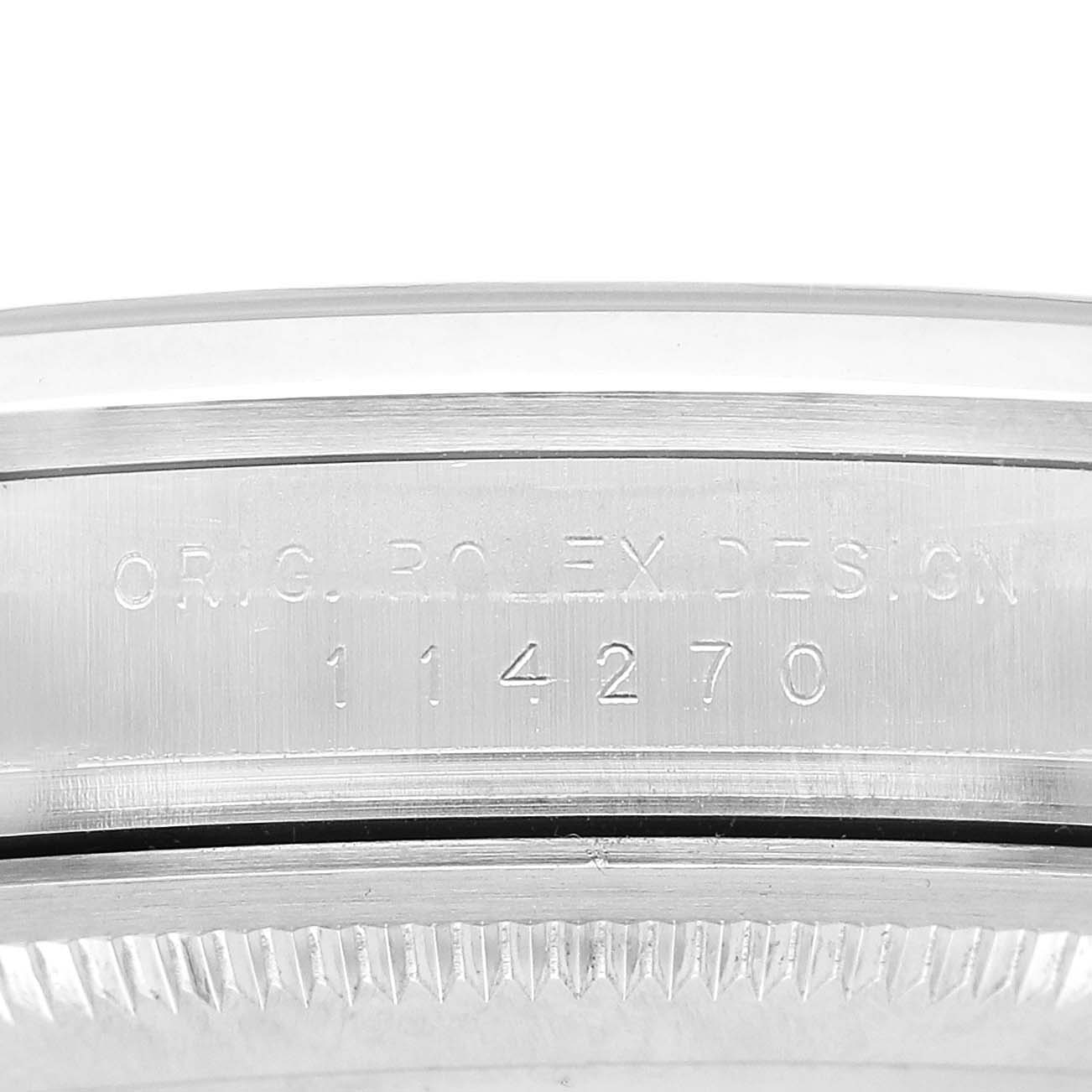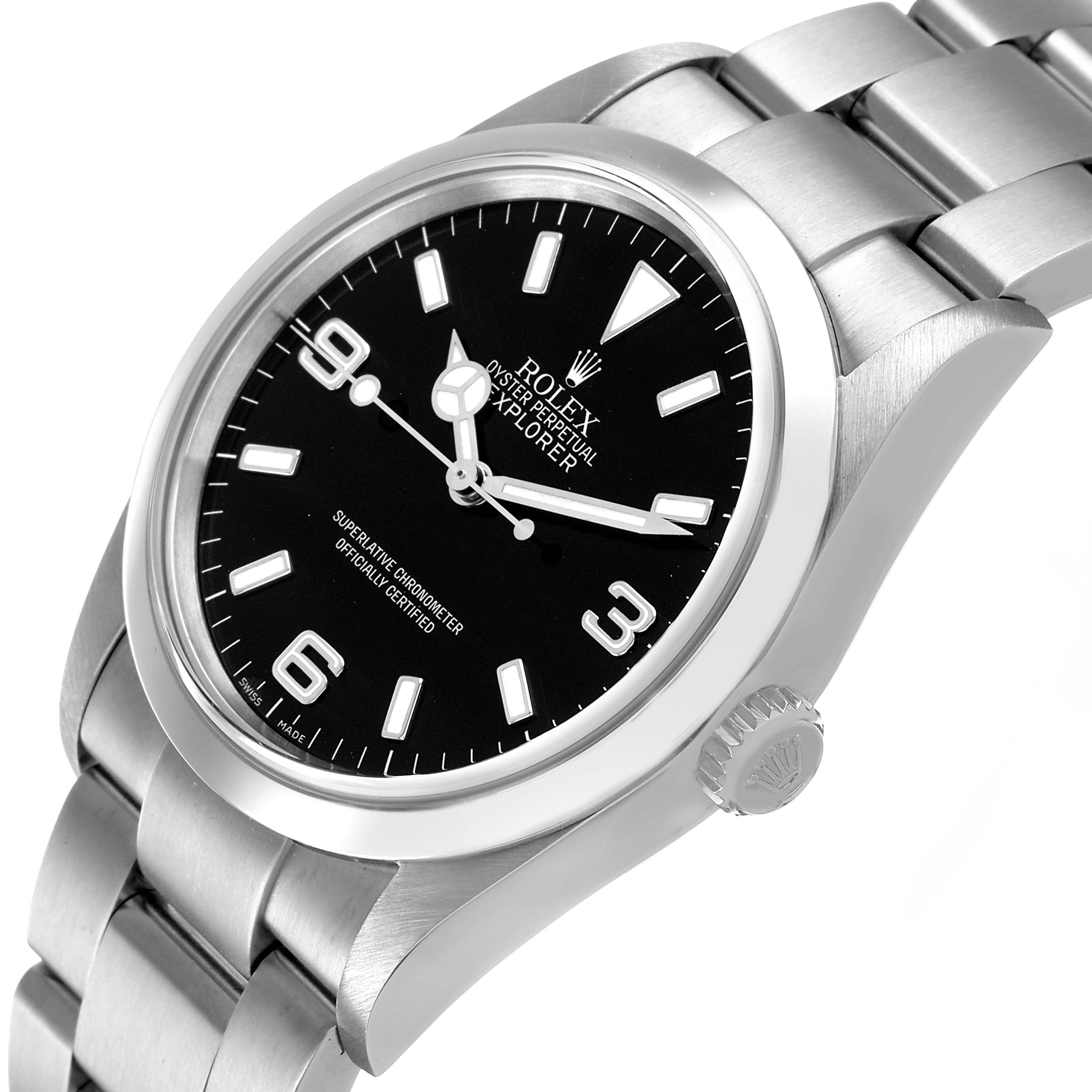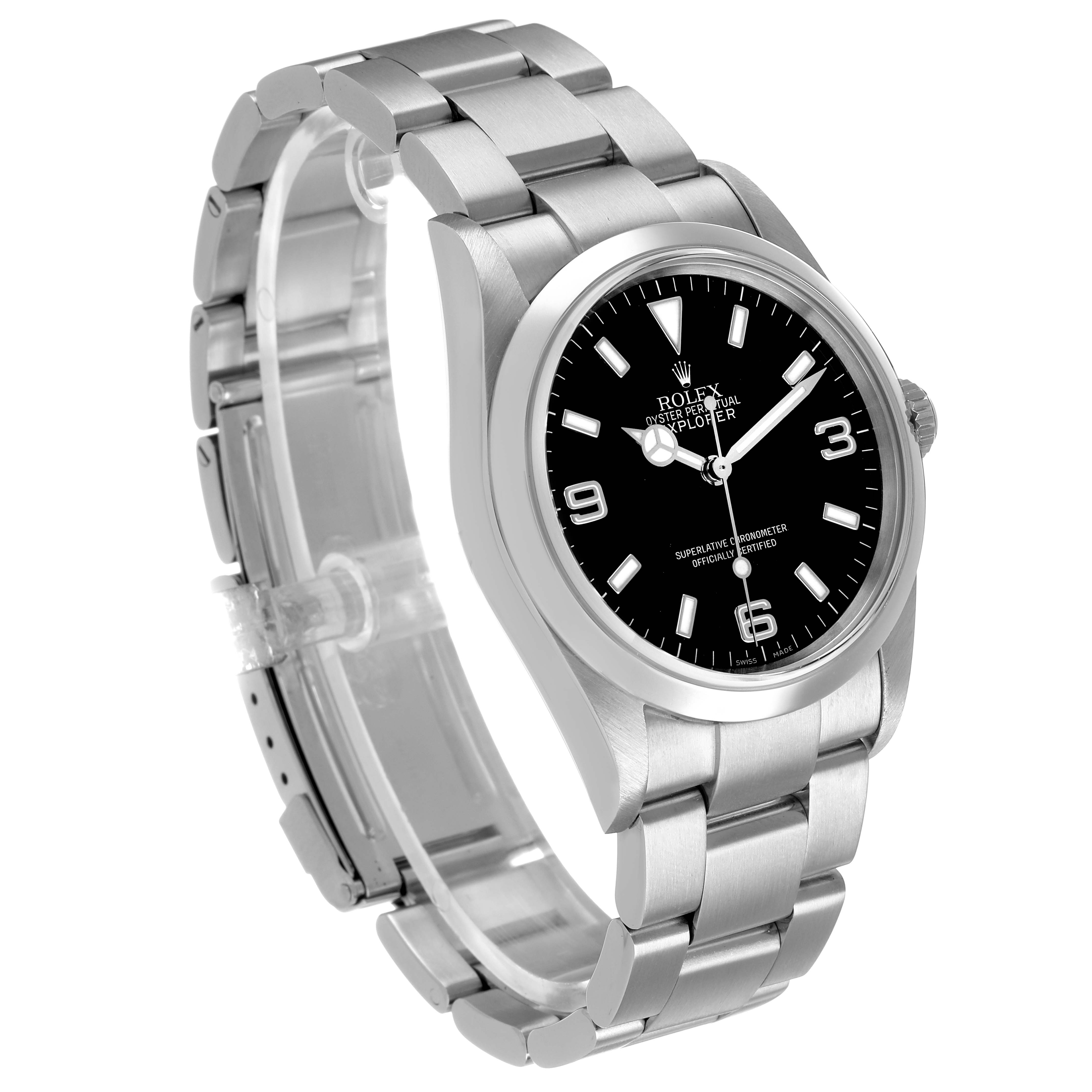 Rolex Explorer I 36 Black Dial Steel Mens Watch 114270. Officially certified chronometer automatic self-winding movement. Stainless steel oyster case 36.0 mm in diameter. Rolex logo on the crown. Stainless steel smooth bezel. Scratch resistant sapphire crystal. Black dial with luminescent baton hour markers and Mercedes hands. Arabic numeral hour markers at 3, 6, and 9 o'clock. Luminescent lollipop-tipped centre seconds hand. Outer stick minute markers. Stainless steel oyster bracelet with a flip-lock clasp. Fits a 7 1/2" wrist.