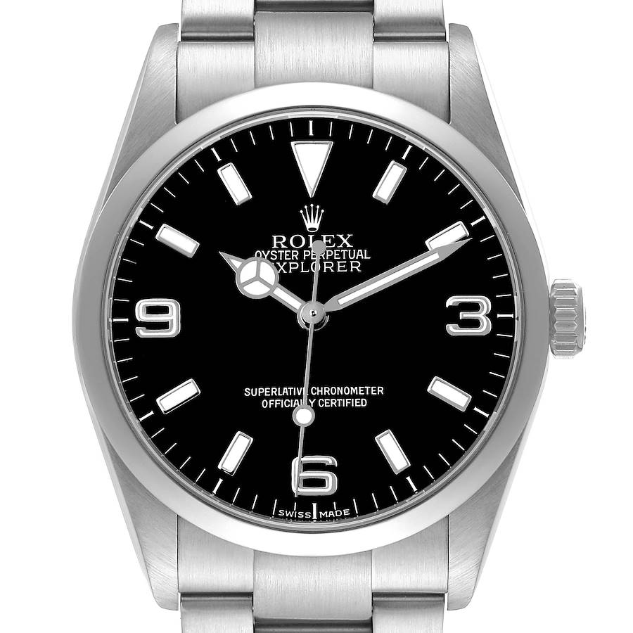 Rolex Explorer I 36 Steel Black Dial Mens Watch 114270. Officially certified chronometer automatic self-winding movement. Stainless steel oyster case 36.0 mm in diameter. Rolex logo on the crown. Stainless steel smooth bezel. Scratch resistant sapphire crystal. Black dial with luminescent baton hour markers and Mercedes hands. Arabic numeral hour markers at 3, 6, and 9 o'clock. Luminescent lollipop-tipped centre seconds hand. Outer stick minute markers. Stainless steel oyster bracelet with a flip-lock clasp. Fits a 7 1/2" wrist.
