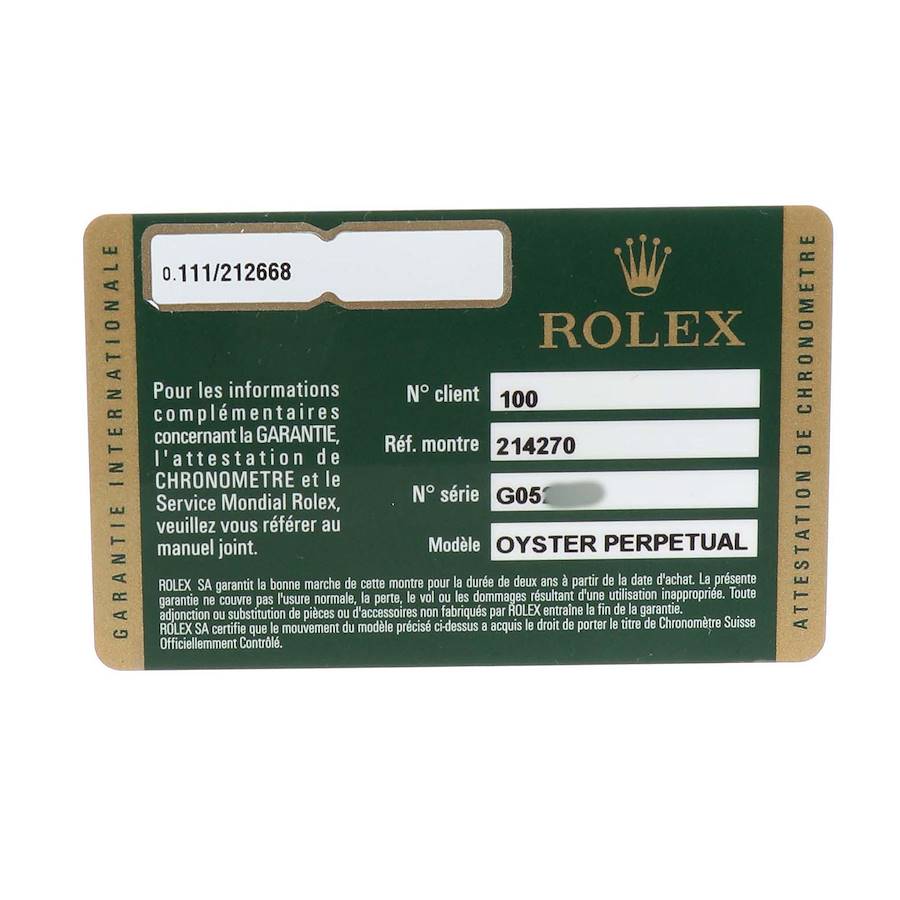 Rolex Explorer I 39 Steel Black Dial Mens Watch 214270 Card. Officially certified chronometer automatic self-winding movement. Stainless steel oyster case 39.0 mm in diameter. Rolex logo on the crown. Stainless steel smooth bezel. Scratch-resistant sapphire crystal. Black dial with luminescent baton hour markers and Mercedes hands. Raised white gold Arabic numerals at 3, 6, and 9 o'clock. Luminescent lollipop-tipped centre seconds hand. Outer minute track. Stainless steel oyster bracelet with a flip-lock clasp and easylink micro-adjustment. Fits a 7 3/4" wrist.