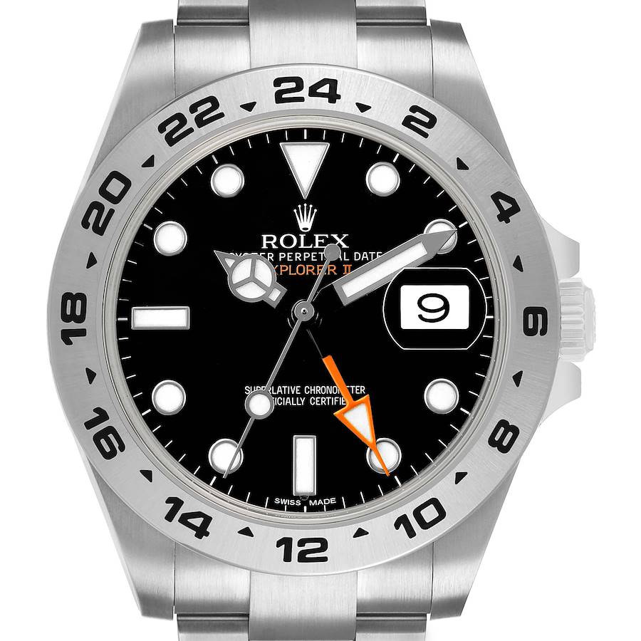 Rolex Explorer II 42 Black Dial Steel Mens Watch 216570 Box Card. Officially certified chronometer automatic self-winding movement. Stainless steel oyster case 42.0 mm in diameter. Pointed crown guards. Rolex logo on the crown. Stainless steel bezel engraved with a 24 hour timezone scale. Scratch resistant sapphire crystal with a cyclops magnifier. Black dial with luminescent dot hour markers and Mercedes hands. Orange luminescent arrow-tipped second time zone hand. Luminescent lollipop-tipped sweeping seconds hand. Date calendar at the 3 o'clock aperture. Outer stick minute markers. Stainless steel oyster bracelet with a flip-lock clasp. Fits an 7 3/4" wrist.