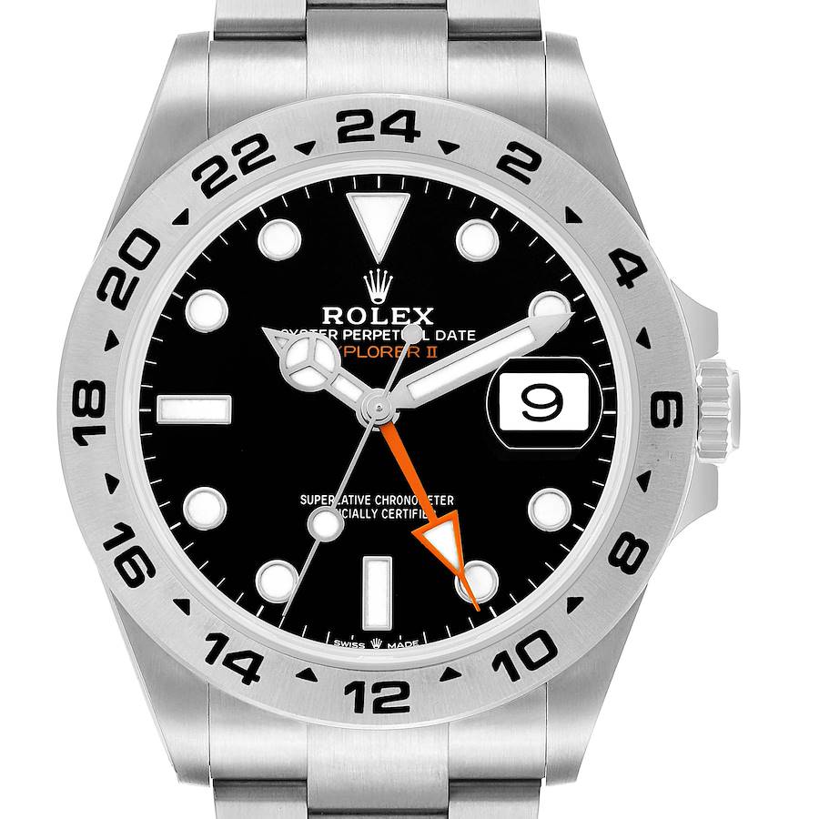 Rolex Explorer II 42mm Black Dial Automatic Steel Mens Watch 226570. Officially certified chronometer automatic self-winding movement. Stainless steel oyster case 42.0 mm in diameter. Pointed crown guards. Rolex logo on the crown. Stainless steel bezel engraved with the 24-hour scale. Scratch resistant sapphire crystal with a cyclops magnifier. Black dial with luminescent dot hour markers and Mercedes hands. Outer stick minute markers. Luminescent orange arrow-tipped GMT second time zone hand. Luminescent lollipop-tipped centre seconds hand. Date calendar at the 3 o'clock aperture. Stainless steel oyster bracelet with a flip-lock clasp and easylink micro-adjustment. Fits an 7.5" wrist.