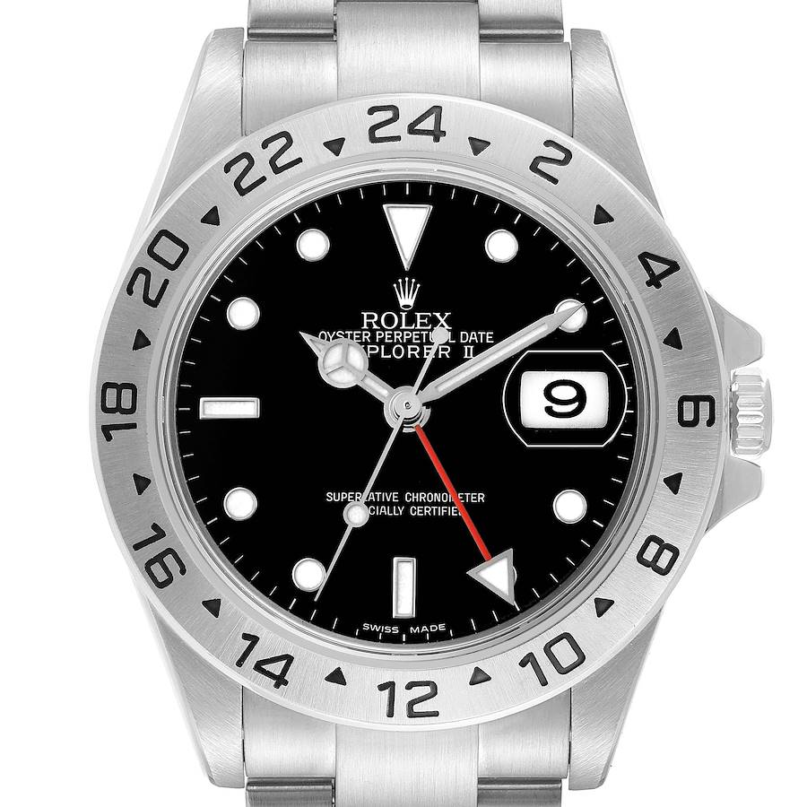 Rolex Explorer II Steel Parachrom Black Dial Mens Watch 16570 Box Card. Officially certified chronometer automatic self-winding movement with Parachrom hairspring. Stainless steel oyster case 40.0 mm in diameter. Rolex logo on the crown. Pointed crown guards. Fixed stainless steel bezel engraved with the 24-hour scale. Scratch-resistant sapphire crystal with a cyclops magnifier. Black dial with luminescent dot hour markers and Mercedes hands. Red 24-hour hand. Date calendar at the 3 o'clock aperture. Stainless steel oyster bracelet with a flip-lock clasp . Fits a 7.5'' wrist.