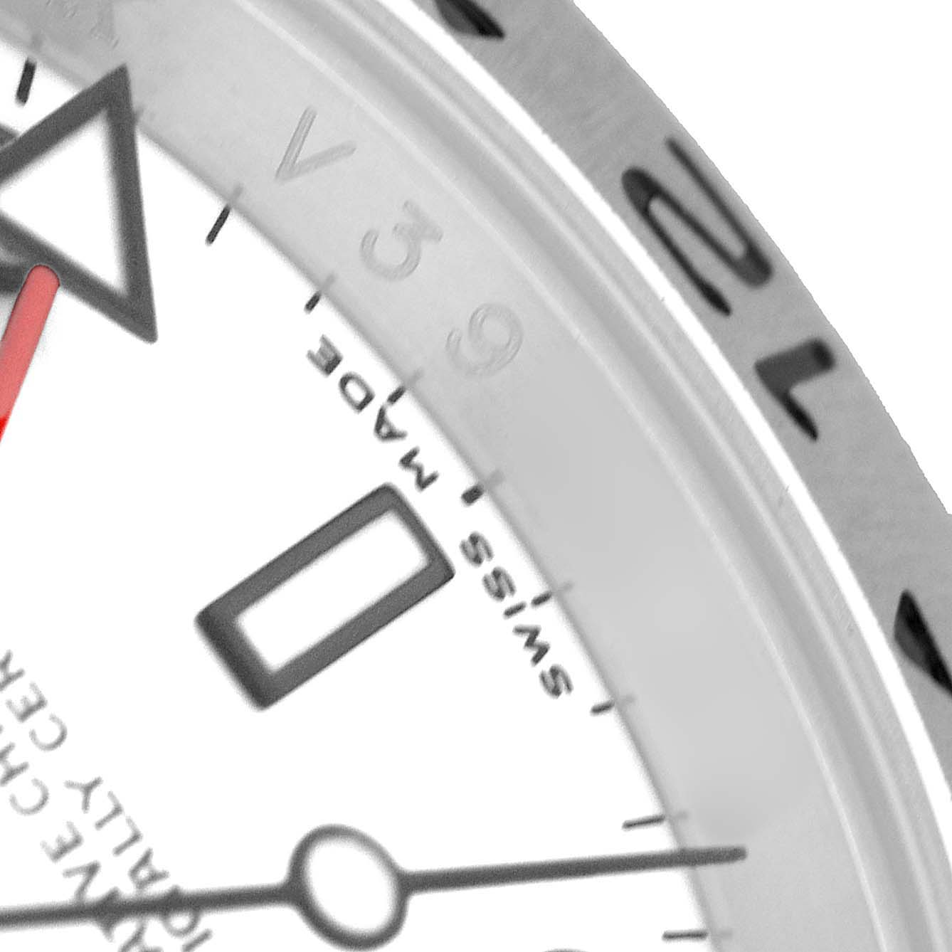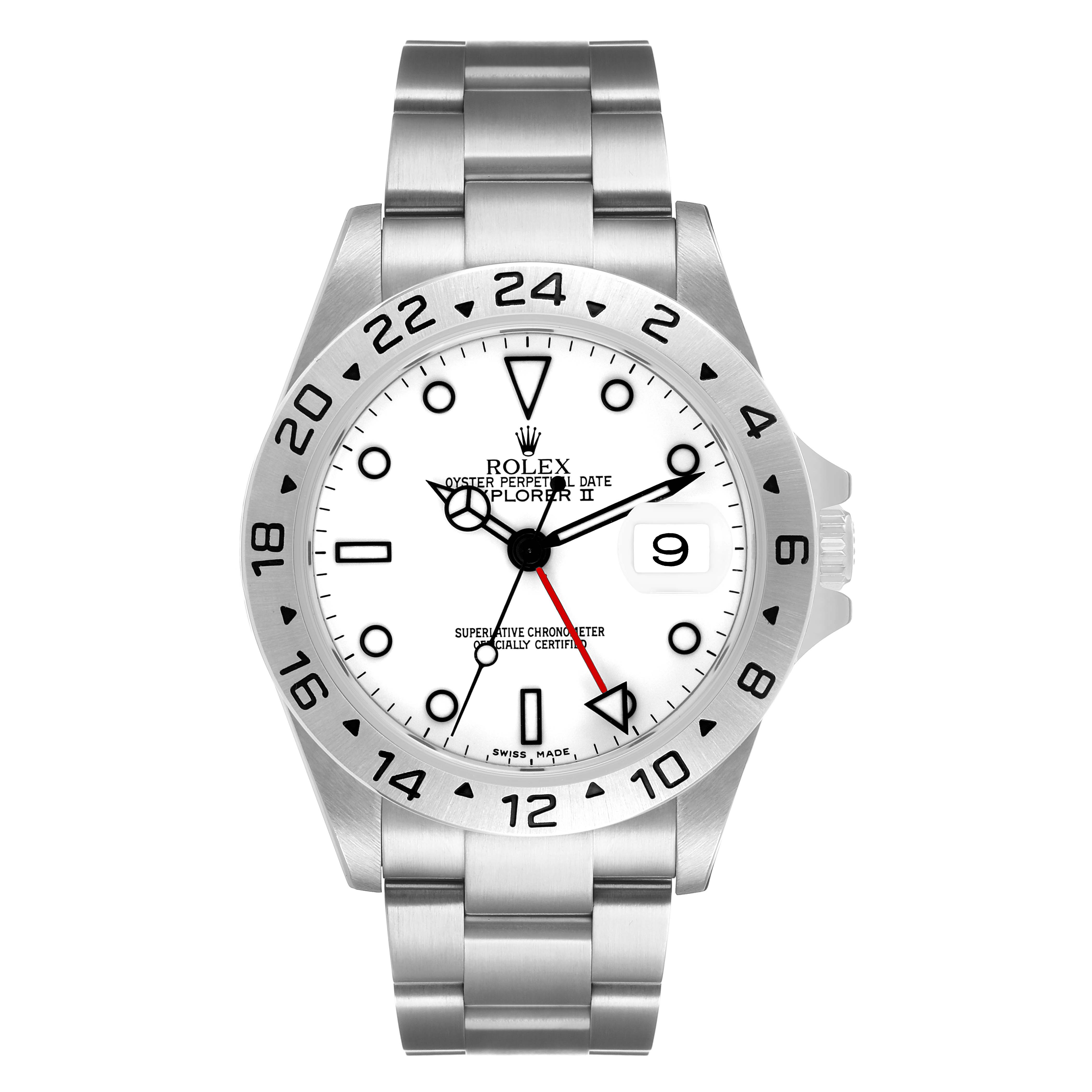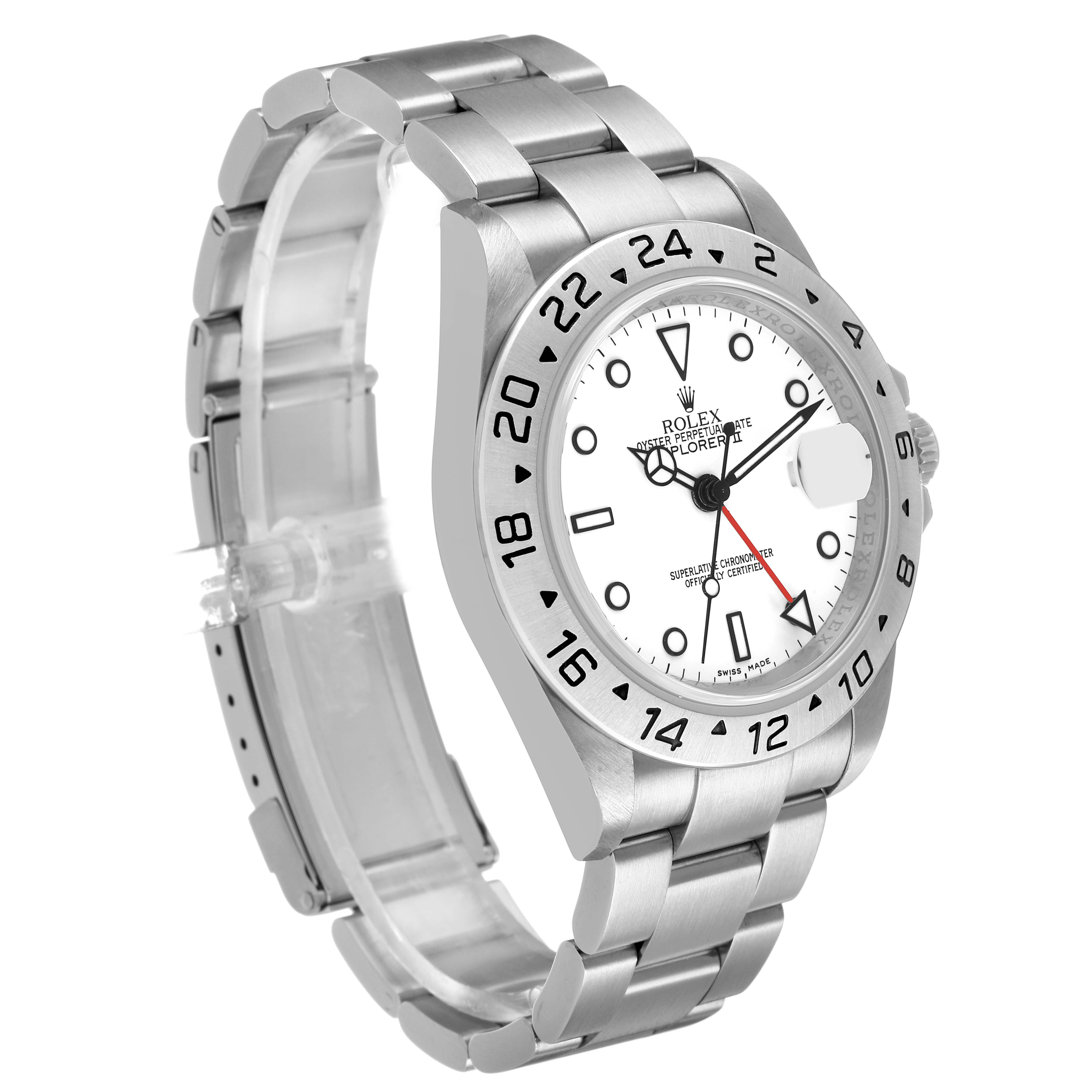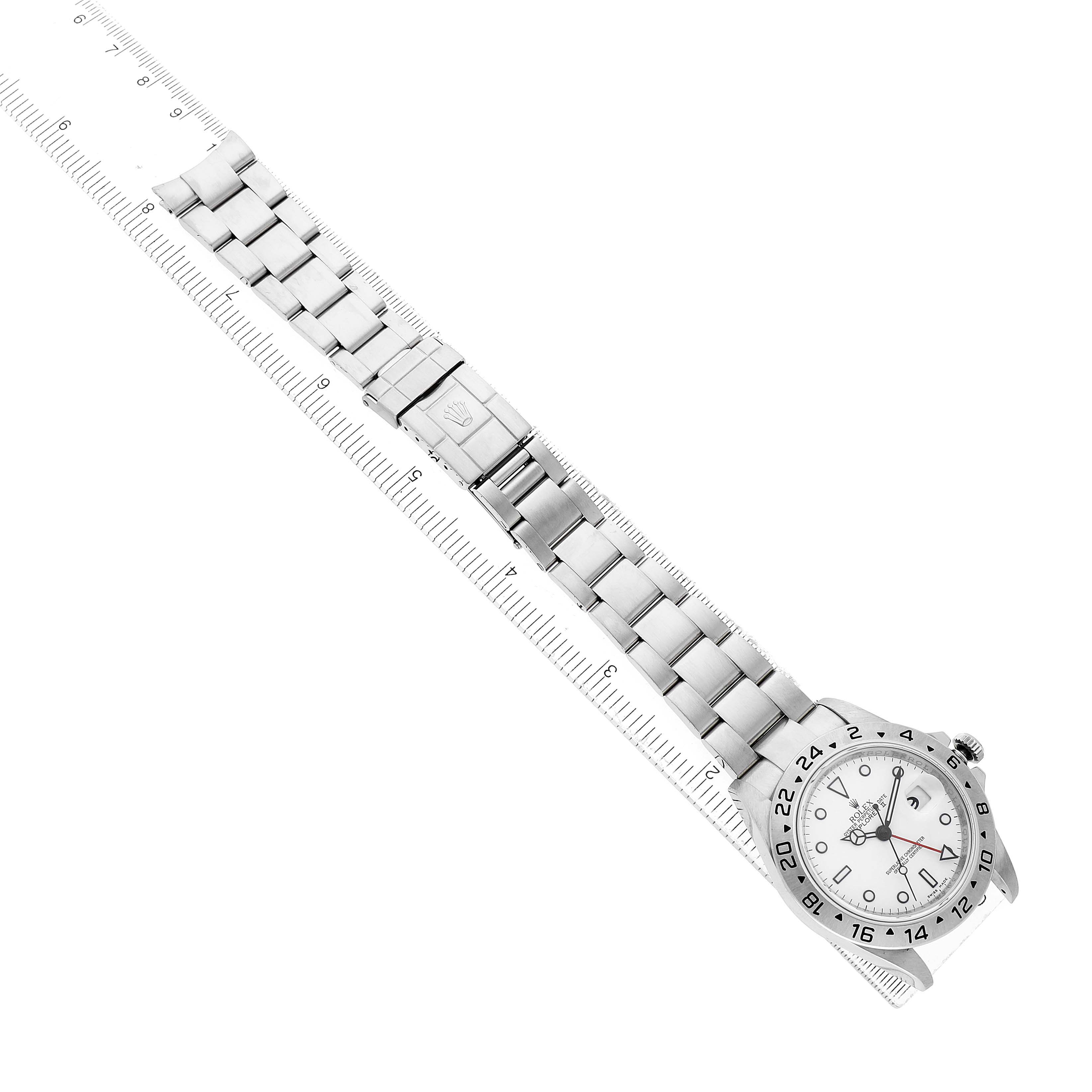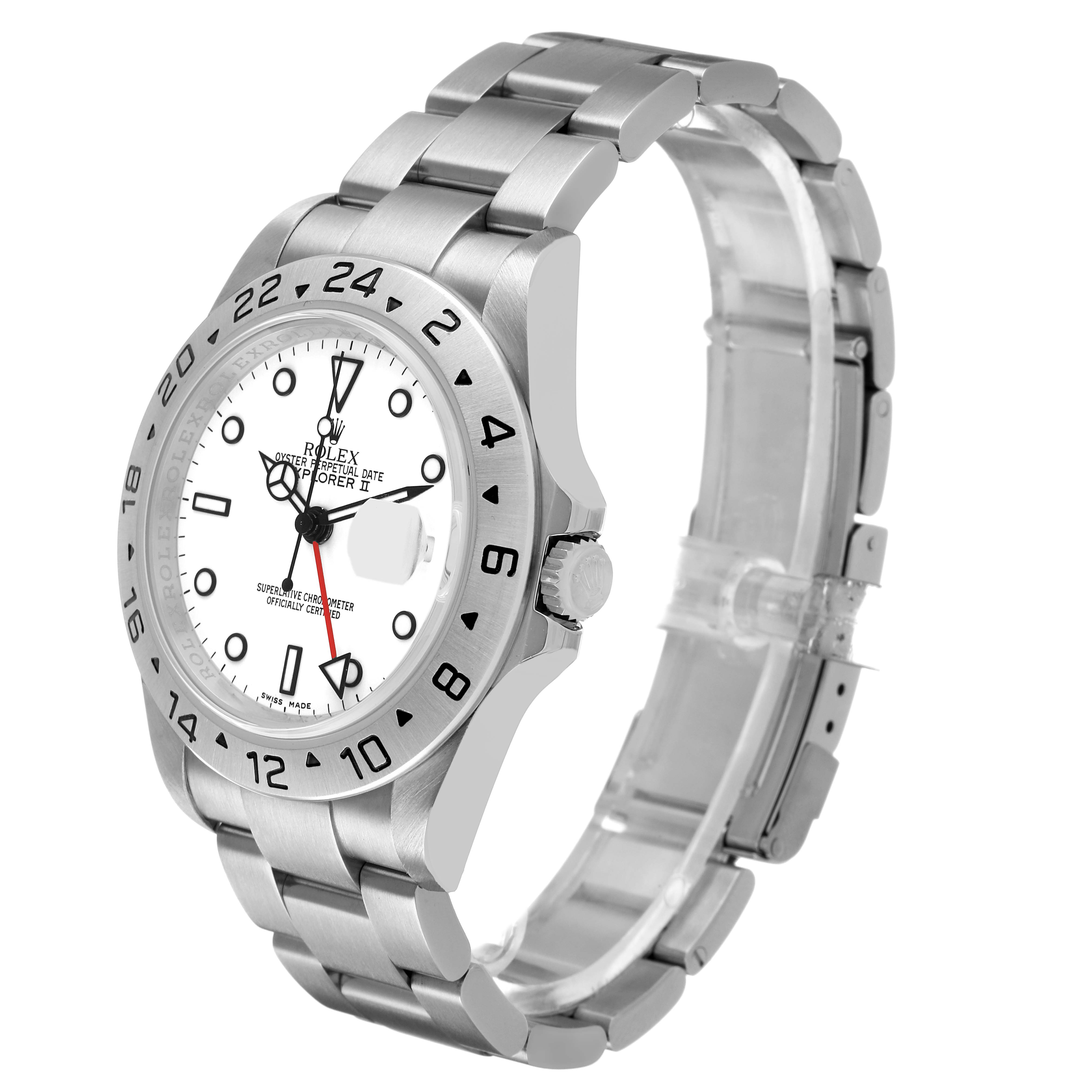 Rolex Explorer II Steel Parachrom Polar White Dial Mens Watch 16570. Officially certified chronometer automatic self-winding movement with Parachrom hairspring. Stainless steel oyster case 40.0 mm in diameter. Pointed crown guards. Rolex logo on the crown. Stainless steel bezel engraved with the 24-hour scale. Scratch-resistant sapphire crystal with a cyclops magnifier. Polar white dial with luminescent dot hour markers and Mercedes hands. Red 24 hour-hand with a luminescent arrow tip. Luminescent lollipop-tipped centre seconds hand. Outer stick minute markers. Date calendar at the 3 o'clock aperture. Stainless steel oyster bracelet with a flip-lock clasp. Fits a 7.5" wrist.