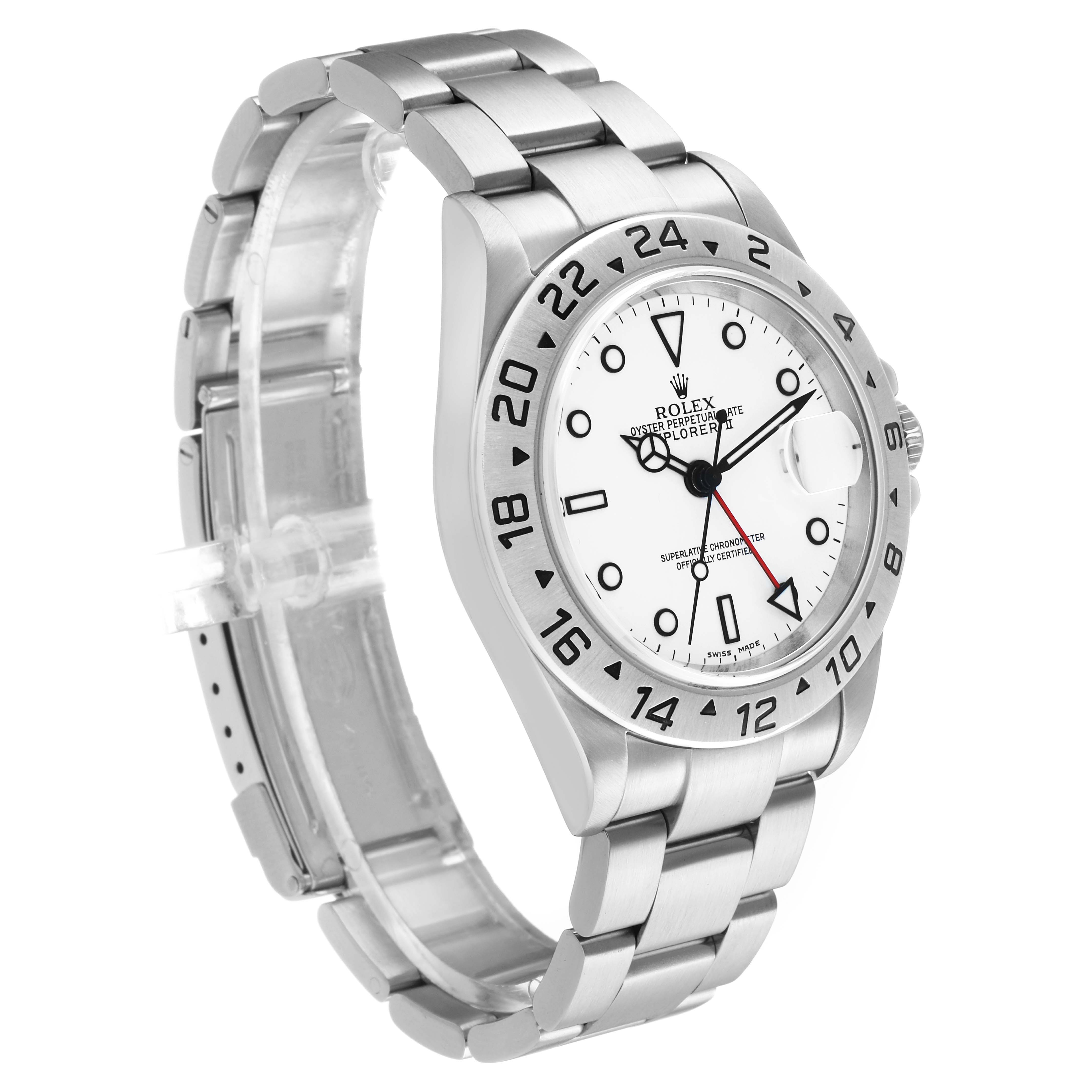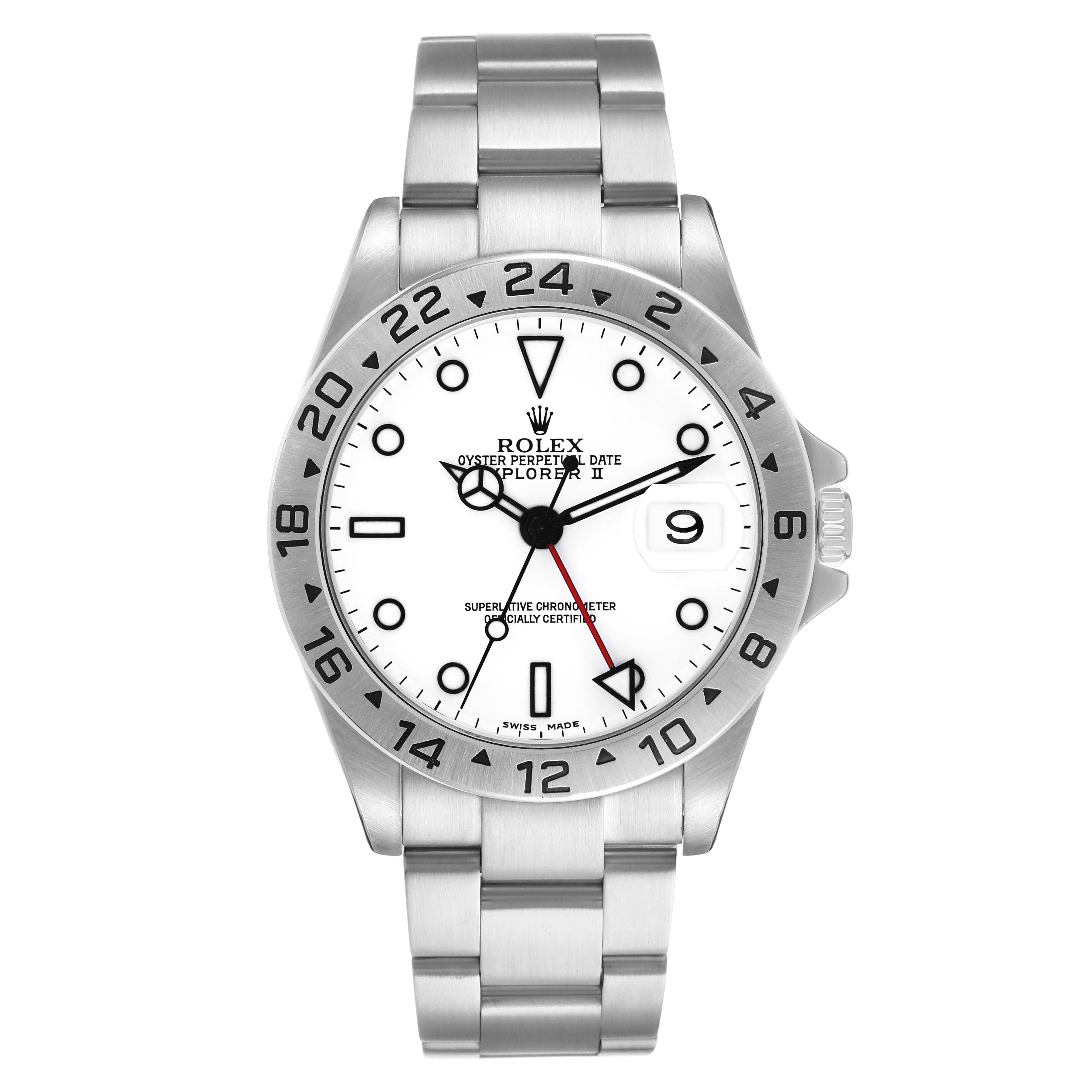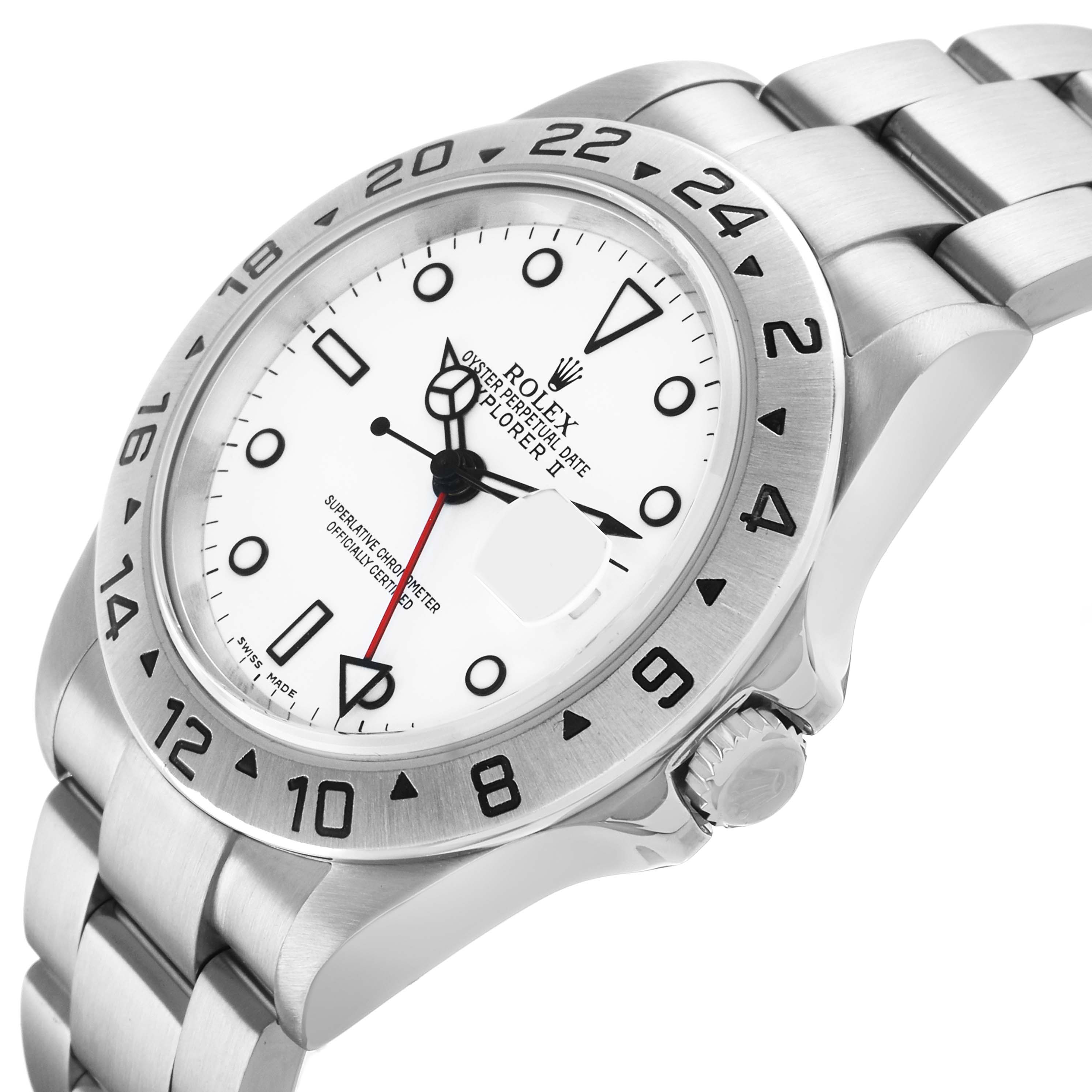Rolex Explorer II Steel Polar White Dial Mens Watch 16570. Officially certified chronometer automatic self-winding movement. Stainless steel oyster case 40.0 mm in diameter. Pointed crown guards. Rolex logo on the crown. Scratch-resistant sapphire crystal with a cyclops magnifier. Scratch-resistant sapphire crystal with a cyclops magnifier. Polar white dial with luminescent dot hour markers and Mercedes hands. Red second timezone hand with a luminescent arrow tip. Luminescent lollipop-tipped centre seconds hand. Outer stick minute markers. Date calendar at the 3 o'clock aperture. Stainless steel oyster bracelet with a flip-lock clasp. Fits a 7.5" wrist.