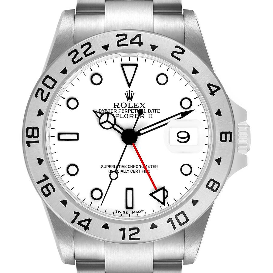 Rolex Explorer II Steel Polar White Dial Mens Watch 16570. Officially certified chronometer automatic self-winding movement. Stainless steel oyster case 40.0 mm in diameter. Pointed crown guards. Rolex logo on the crown. Stainless steel bezel engraved with the 24-hour scale. Scratch-resistant sapphire crystal with a cyclops magnifier. Polar white dial with luminescent dot hour markers and Mercedes hands. Red 24-hour hand with a luminescent arrow tip. Luminescent lollipop-tipped centre seconds hand. Outer stick minute markers. Date calendar at the 3 o'clock aperture. Stainless steel oyster bracelet with a flip-lock clasp. Fits a 7 1/4" wrist.