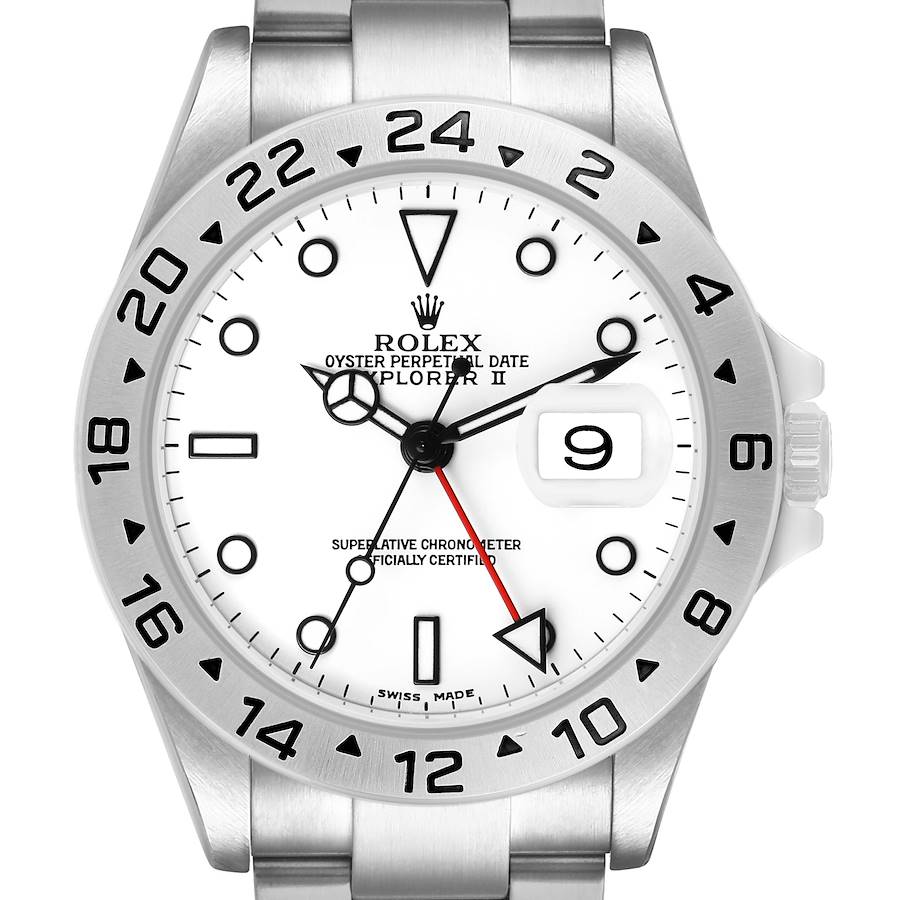 Rolex Explorer II Steel Polar White Dial Mens Watch 16570. Officially certified chronometer automatic self-winding movement. Stainless steel oyster case 40.0 mm in diameter. Pointed crown guards. Rolex logo on the crown. Stainless steel bezel engraved with the 24-hour scale. Scratch-resistant sapphire crystal with a cyclops magnifier. Polar white dial with luminescent dot hour markers and Mercedes hands. Red 24-hour hand with a luminescent arrow tip. Luminescent lollipop-tipped centre seconds hand. Outer stick minute markers. Date calendar at the 3 o'clock aperture. Stainless steel oyster bracelet with a flip-lock clasp. Fits a 7.5" wrist.