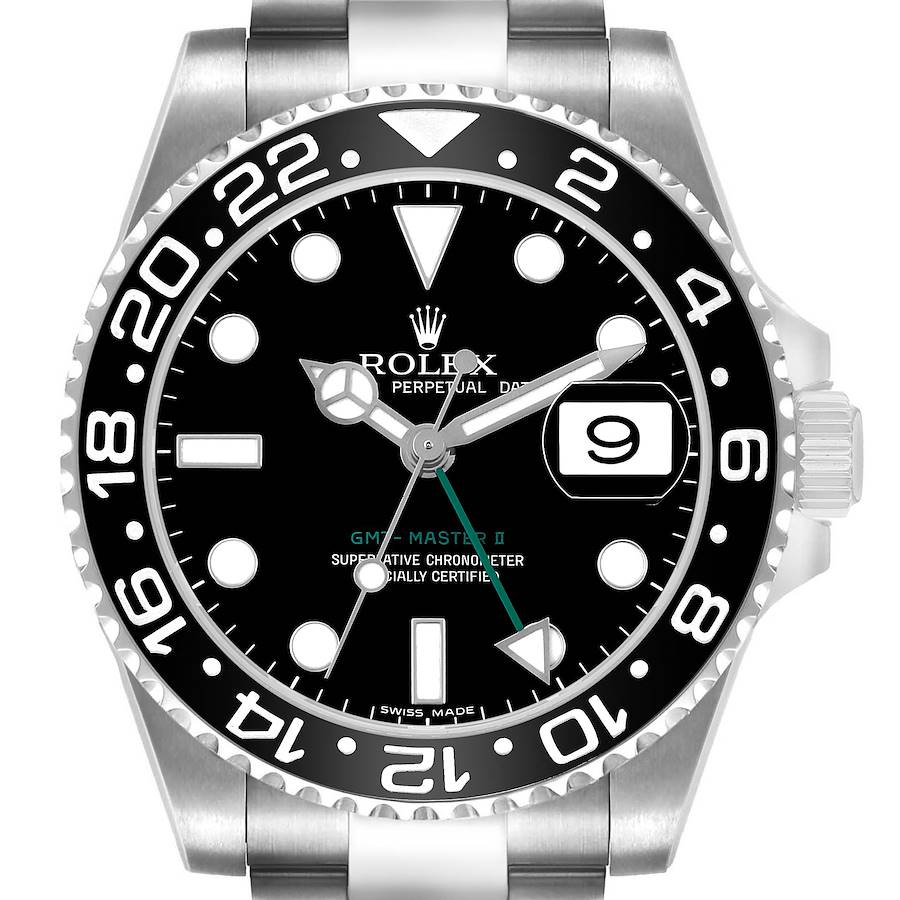 Rolex GMT Master II Black Dial Black Bezel Steel Mens Watch 116710. Officially certified chronometer automatic self-winding movement. Stainless steel oyster case 40.0 mm in diameter. Pointed crown guards. Rolex logo on the crown. Stainless steel bidirectional rotating 24-hour bezel with a black Cerachrom ceramic insert. Scratch resistant sapphire crystal with a cyclops magnifier. Black dial with white luminescent dot hour markers and Mercedes hands. Green GMT arrow hand. Luminescent lollipop-tipped sweeping seconds hand. Outer stick minute markers. Date calendar at the 3 o'clock aperture. Stainless steel oyster bracelet with a flip-lock clasp and easylink micro-adjustment. Fits an 7 3/4" wrist.
