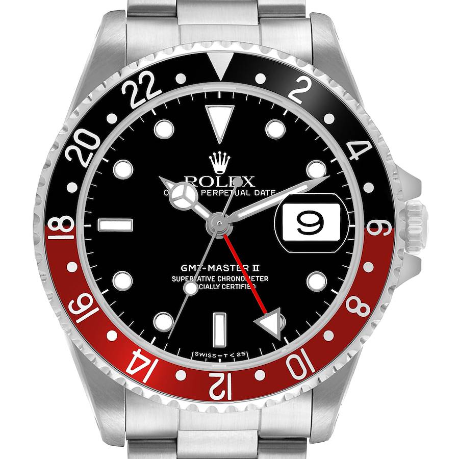 Rolex GMT Master II Black Red Coke Bezel Steel Mens Watch 16710. Officially certified chronometer automatic self-winding movement. Stainless steel oyster case 40.0 mm in diameter. Rolex logo on the crown. Pointed crown guards. Stainless steel bidirectional rotating GMT bezel with a 24-hour black and red "Coke" bezel insert. Scratch resistant sapphire crystal with a cyclops magnifier. Black dial with white luminescent dot hour markers and Mercedes hands. Luminescent arrow-tipped red GMT second timezone hand. Date calendar at the 3 o'clock aperture. Outer stick minute markers. Stainless steel oyster bracelet with a flip-lock clasp. Fits a 7 3/4" wrist.