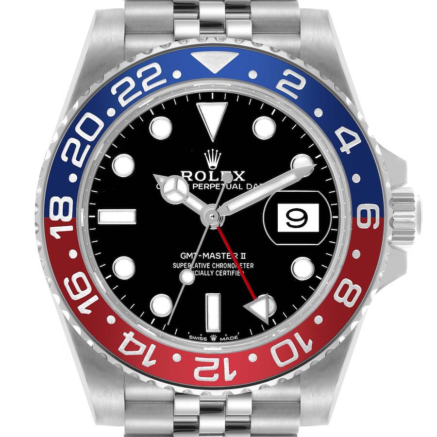 Rolex GMT Master II Blue Red Pepsi Bezel Steel Mens Watch 126710 Box Card. Officially certified chronometer automatic self-winding movement. Stainless steel oyster case 40.0 mm in diameter. Rolex logo on the crown. Stainless steel bidirectional rotating bezel with a Pepsi blue and red 24-hour ceramic bezel insert. Scratch resistant sapphire crystal with a cyclops magnifier. Black lacquer dial with luminescent dot hour markers and Mercedes hands. Red luminescent arrow-tipped GMT hand. Date calendar at the 3 o'clock aperture. Stainless steel jubilee bracelet with a flip lock clasp and easylink micro-adjustment. Fits up to an 8 1/4" wrist.