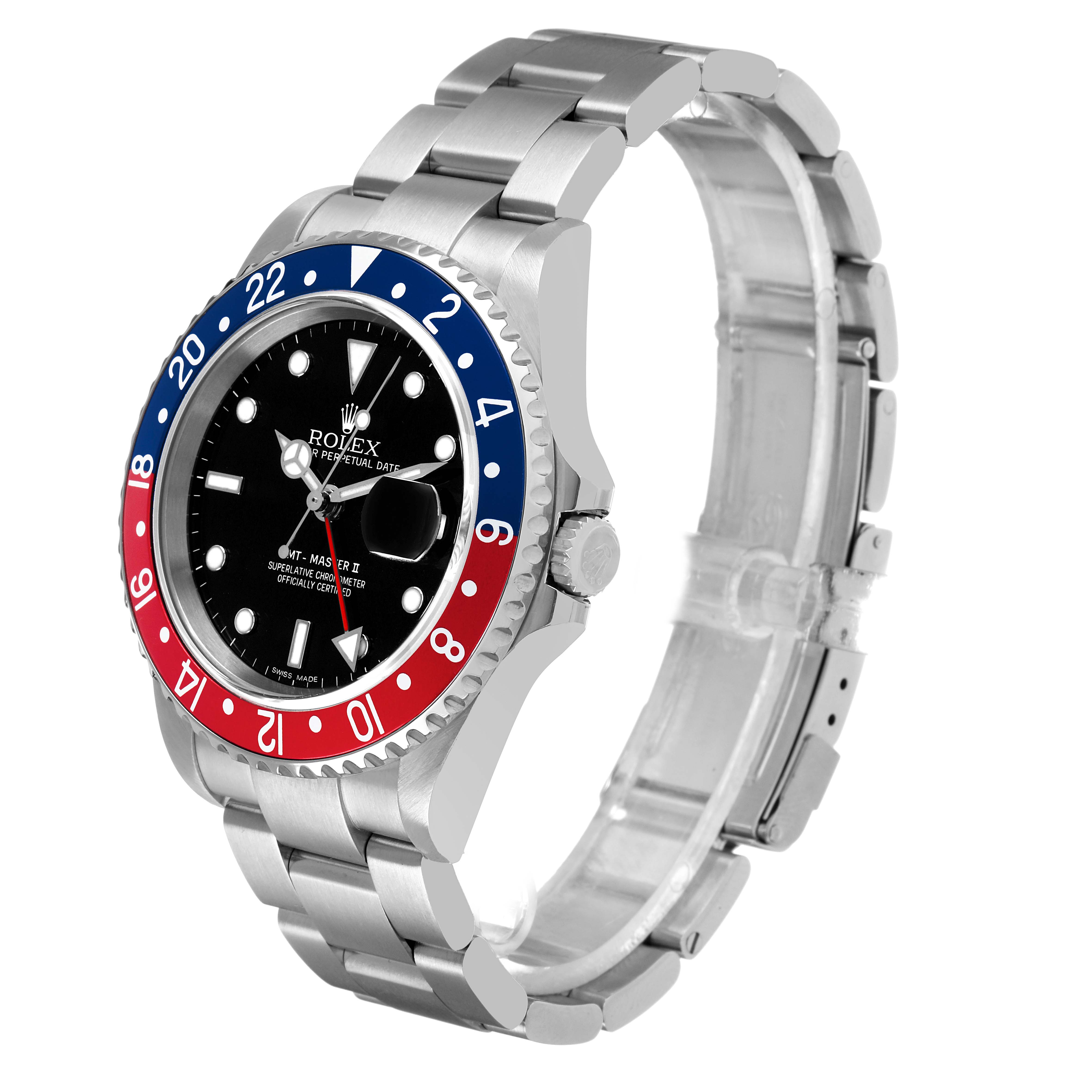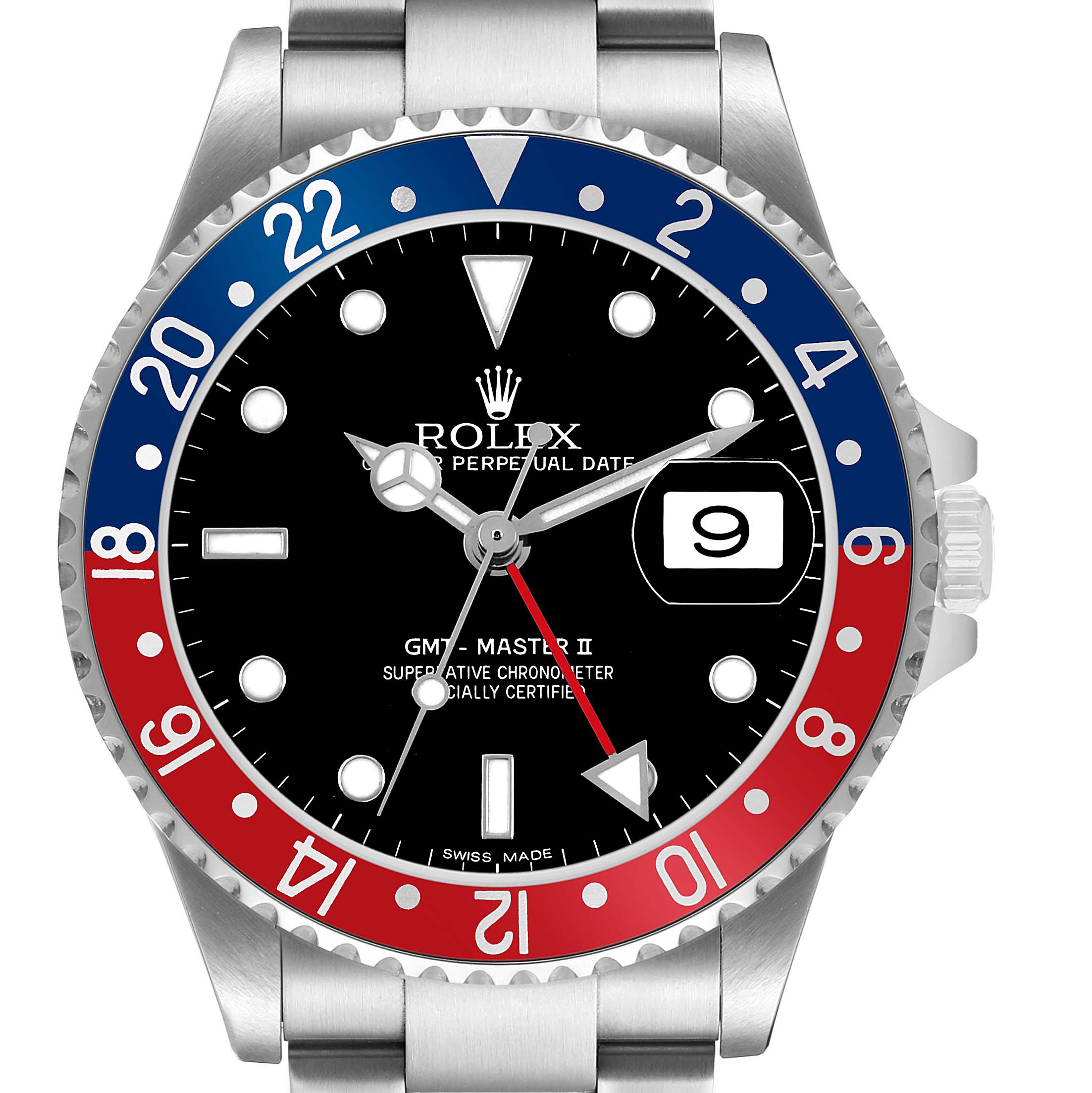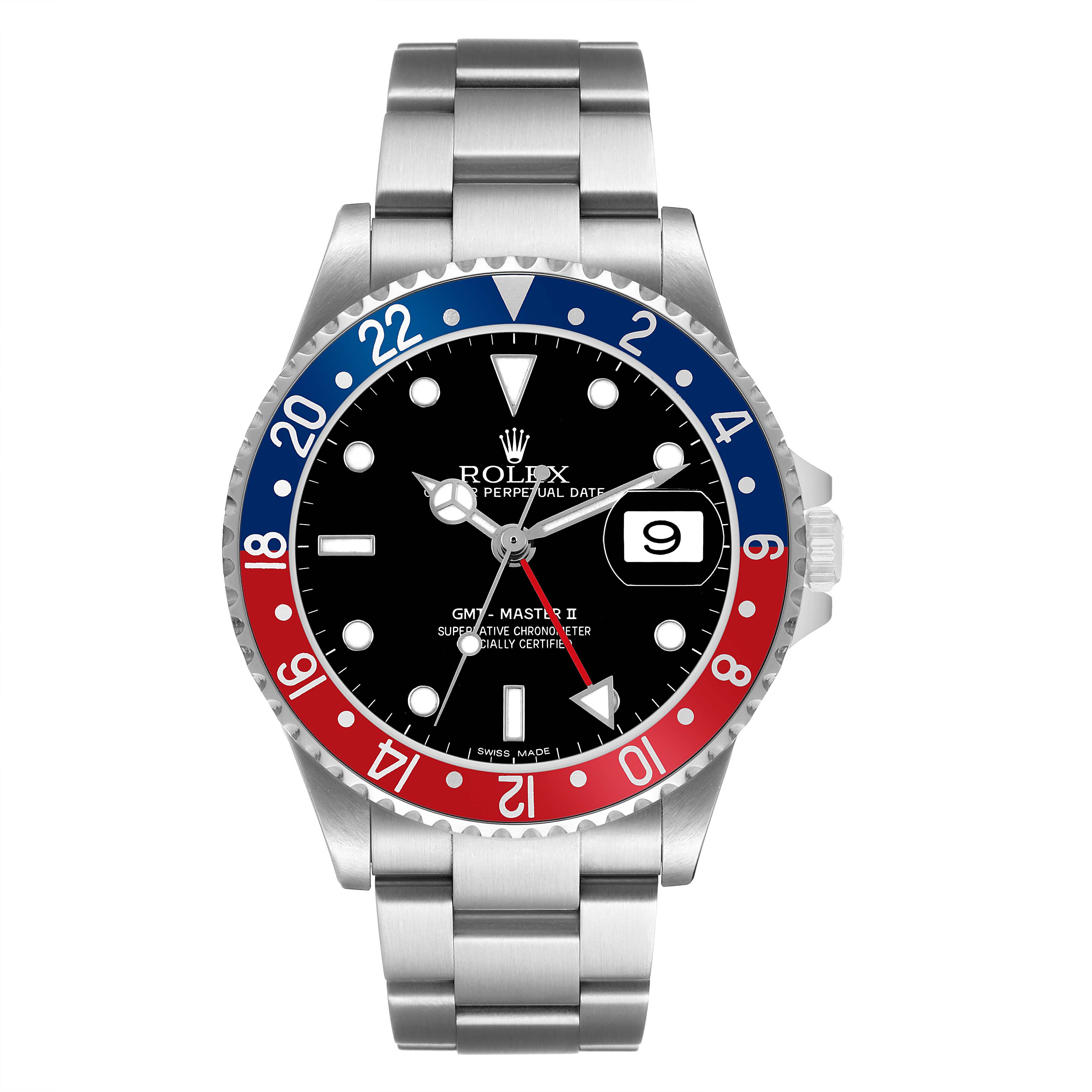 Rolex GMT Master II Blue Red Pepsi Bezel Steel Mens Watch 16710. Officially certified chronometer automatic self-winding movement. Stainless steel oyster case 40.0 mm in diameter. Rolex logo on the crown. Pointed crown guards. Stainless steel bidirectional rotating GMT bezel with a 24-hour blue and red "Pepsi" bezel insert. Scratch resistant sapphire crystal with a cyclops magnifier. Black dial with white luminescent dot hour markers and Mercedes hands. Luminescent arrow-tipped red GMT second timezone hand. Date calendar at the 3 o'clock aperture. Outer stick minute markers. Stainless steel oyster bracelet with a flip-lock clasp. Fits a 7.5" wrist.