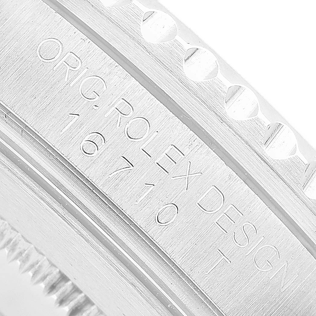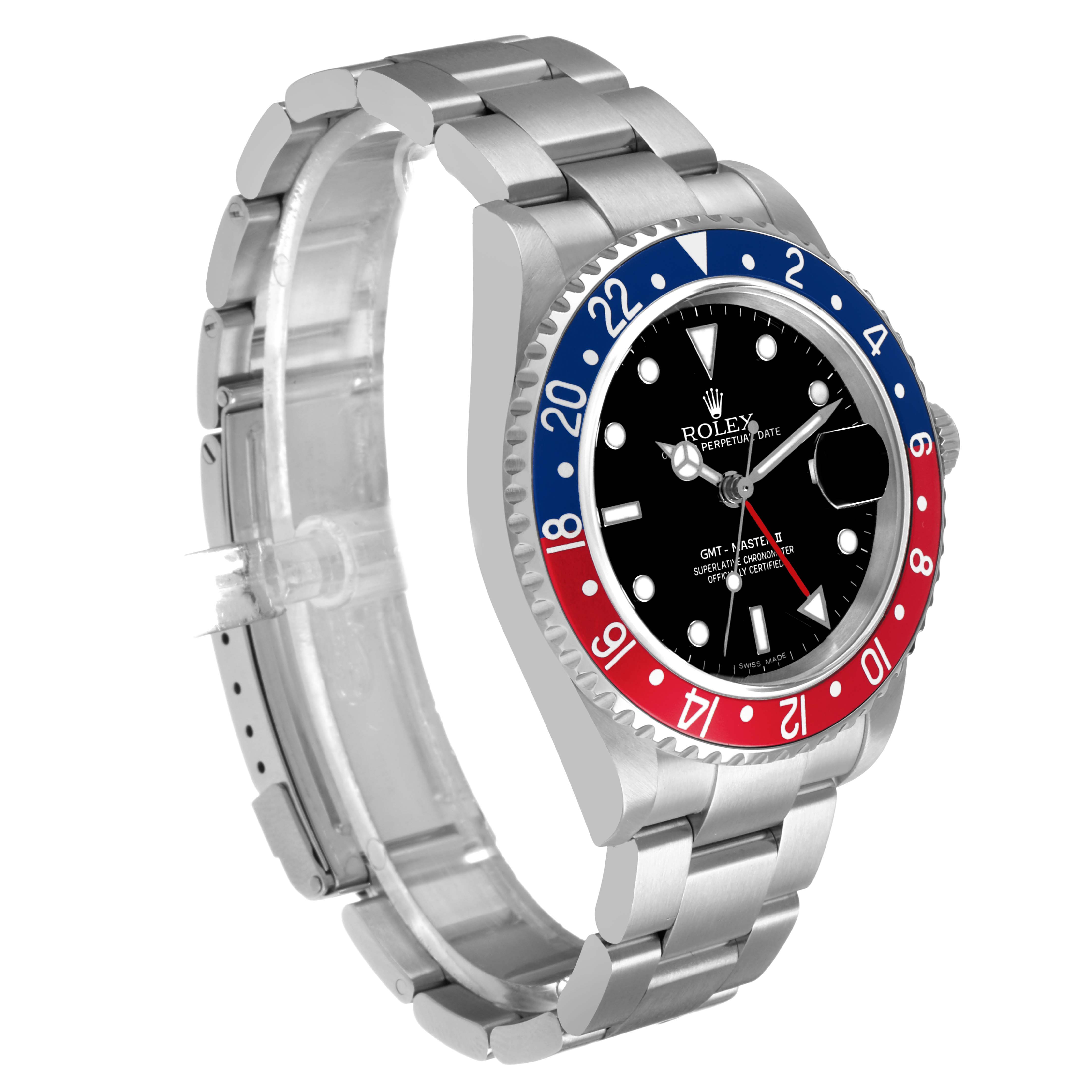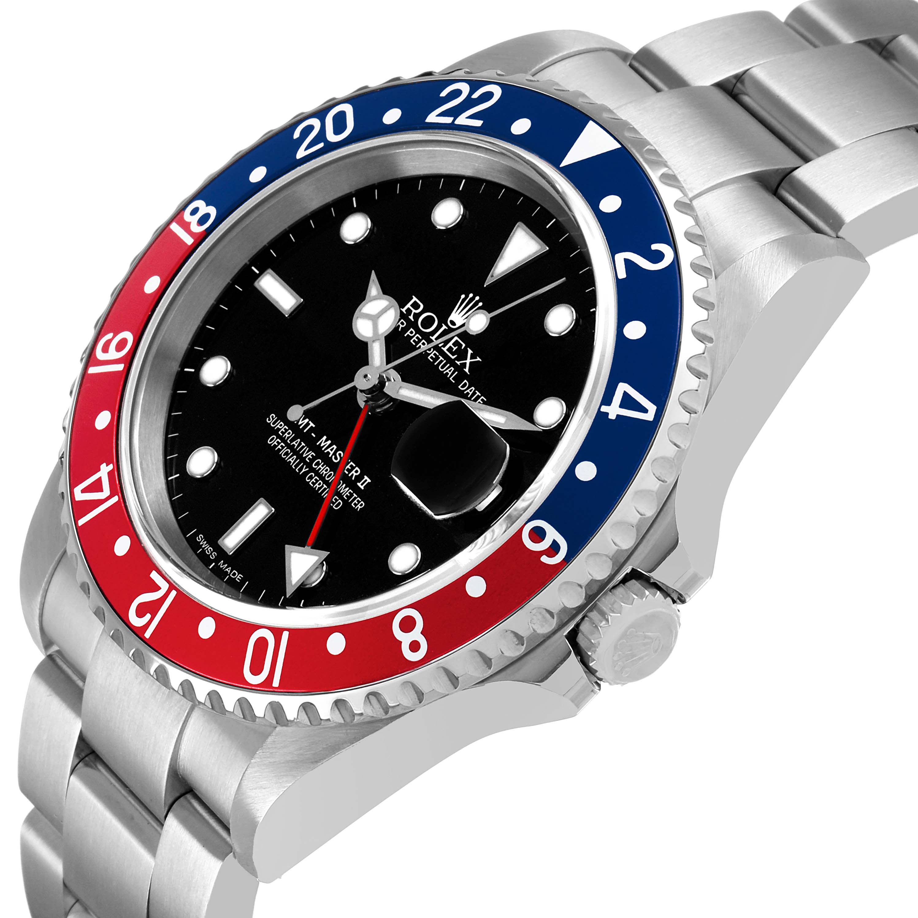 Rolex GMT Master II Blue Red Pepsi Bezel Steel Mens Watch 16710. Officially certified chronometer automatic self-winding movement. Stainless steel oyster case 40.0 mm in diameter. Rolex logo on the crown. Pointed crown guards. Stainless steel bidirectional rotating GMT bezel with a 24-hour blue and red "Pepsi" bezel insert. Scratch resistant sapphire crystal with a cyclops magnifier. Black dial with white luminescent dot hour markers and Mercedes hands. Luminescent arrow-tipped red GMT second timezone hand. Date calendar at the 3 o'clock aperture. Outer stick minute markers. Stainless steel oyster bracelet with a flip-lock clasp. Fits a 7.5" wrist.