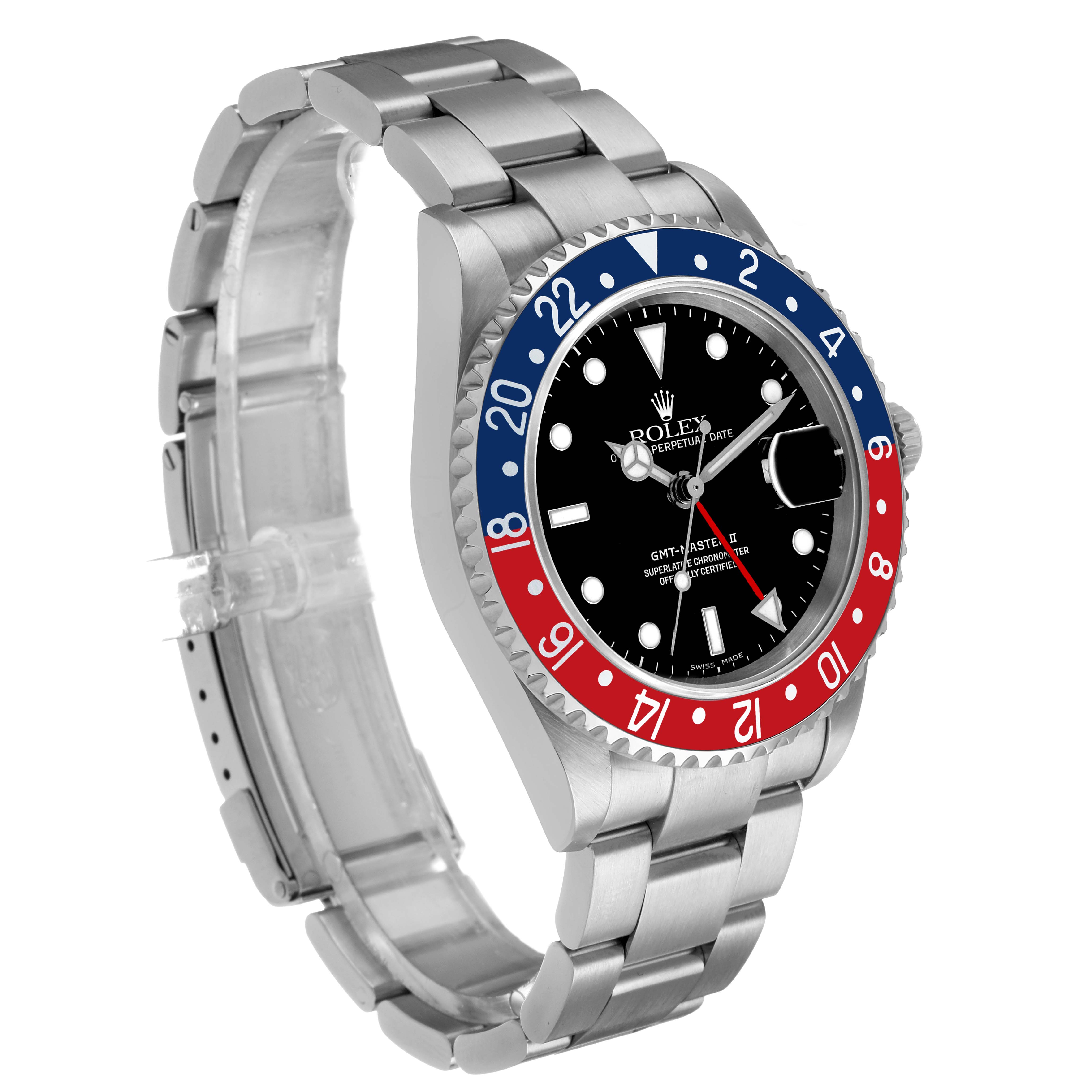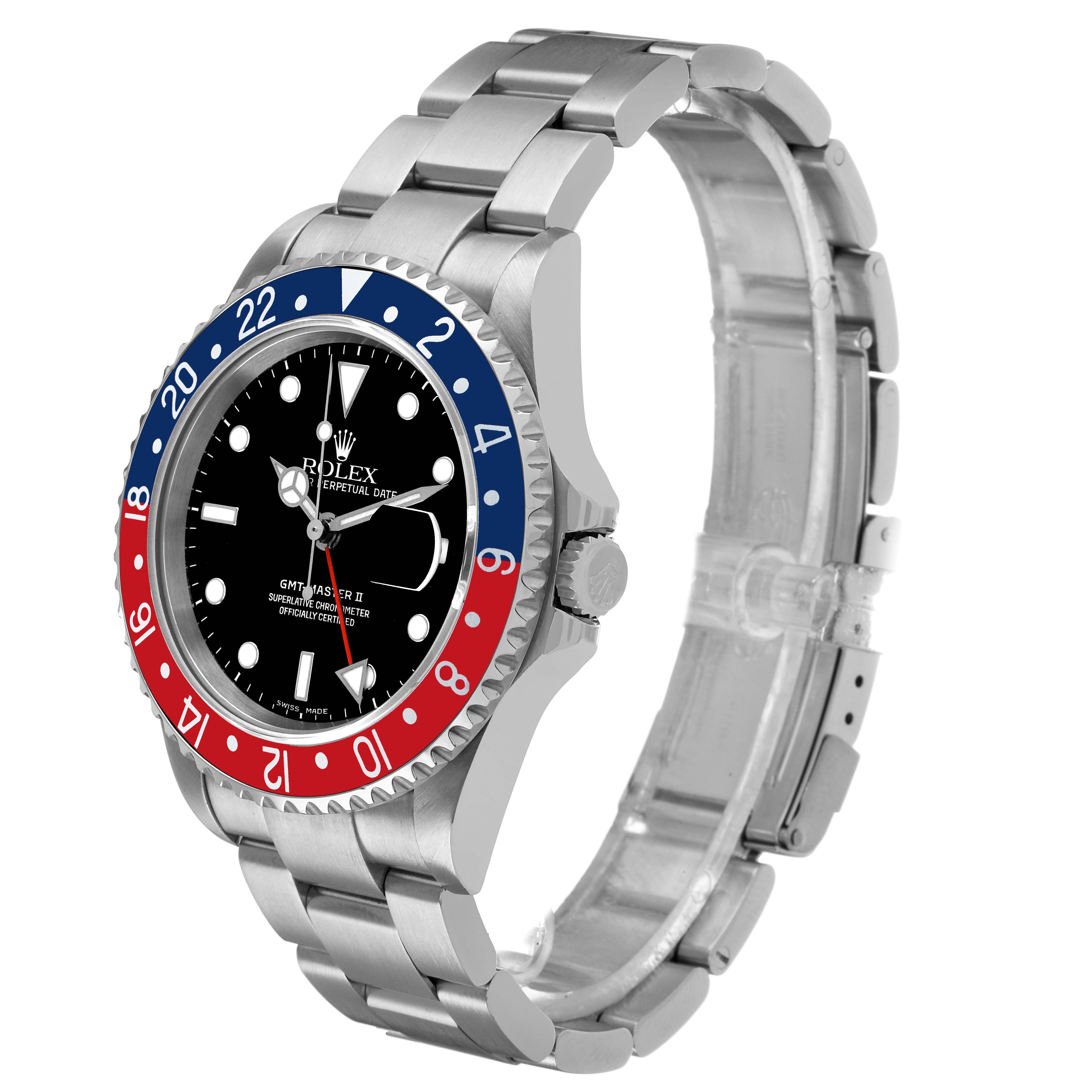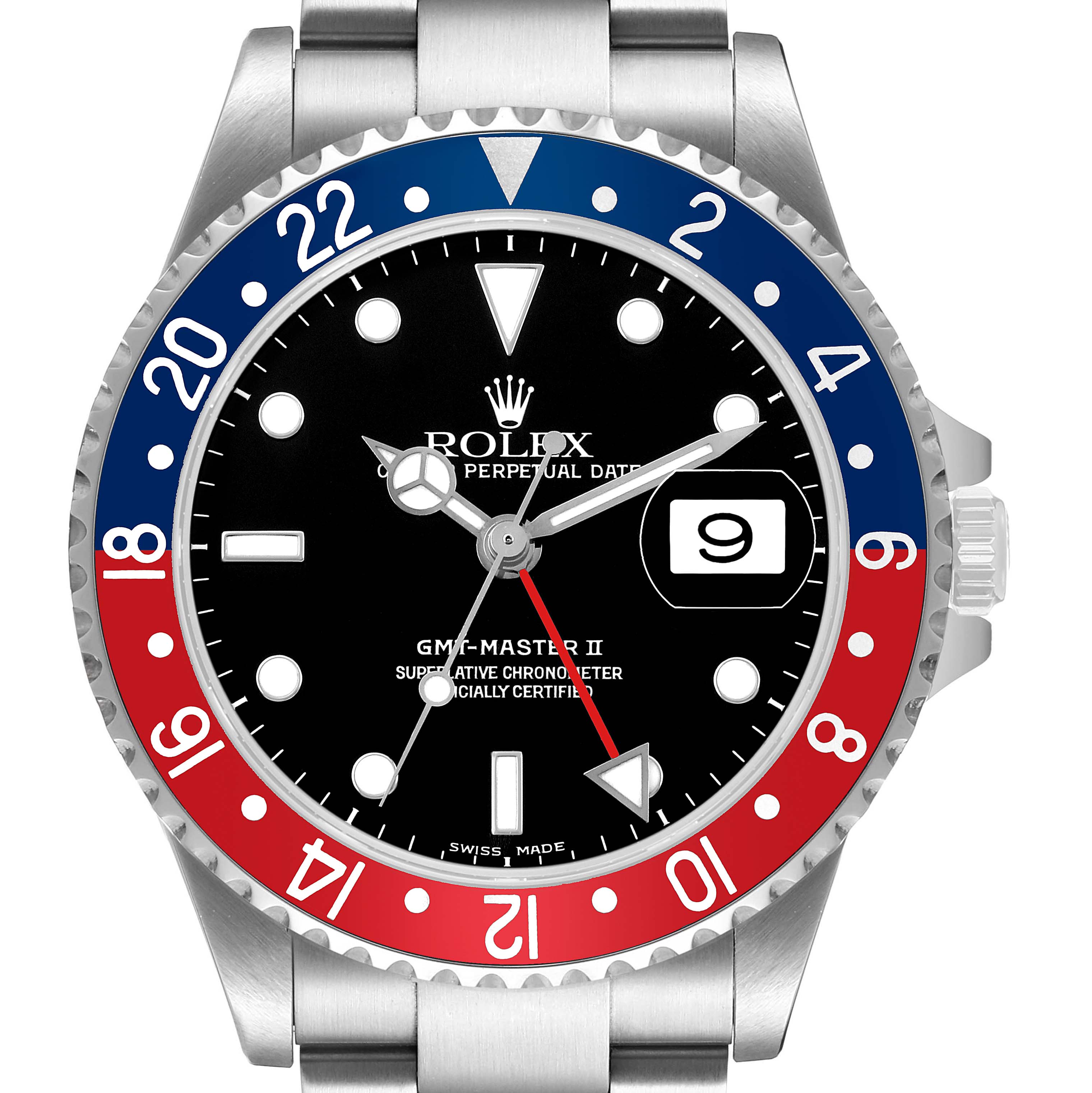 | Bezel: | Stainless steel bidirectional rotating GMT bezel with a 24-hour blue and red "Pepsi" bezel insert. |