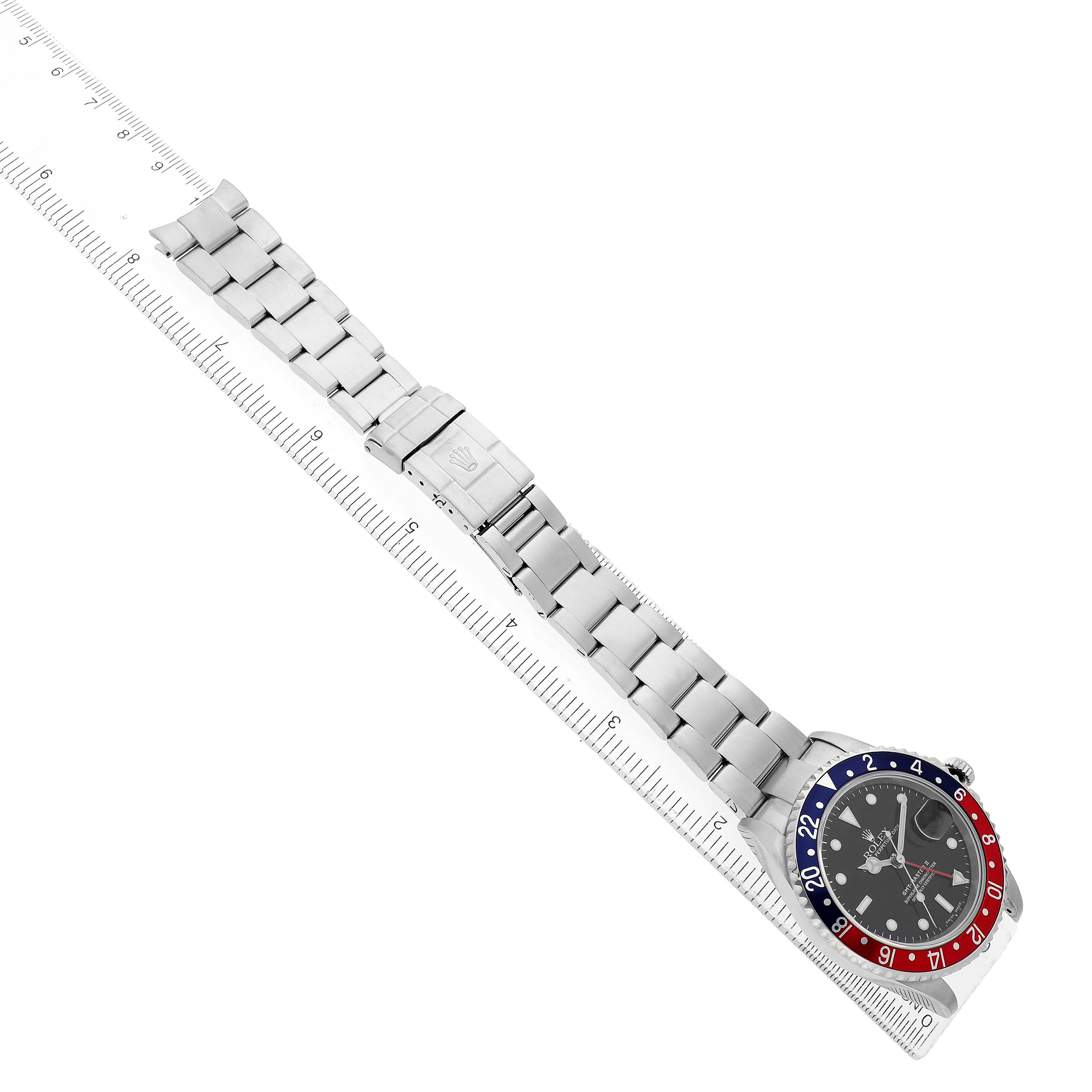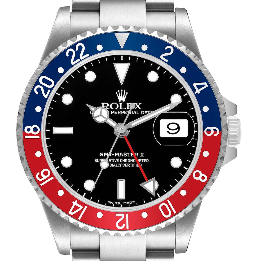 Rolex GMT Master II Blue Red Pepsi Bezel Steel Mens Watch 16710. Officially certified chronometer automatic self-winding movement. Stainless steel oyster case 40.0 mm in diameter. Rolex logo on the crown. Pointed crown guards. Stainless steel bidirectional rotating GMT bezel with a 24-hour blue and red "Pepsi" bezel insert. Scratch resistant sapphire crystal with a cyclops magnifier. Black dial with white luminescent dot hour markers and Mercedes hands. Luminescent arrow-tipped red GMT second timezone hand. Date calendar at the 3 o'clock aperture. Outer stick minute markers. Stainless steel oyster bracelet with a flip-lock clasp. Fits a 7 3/4" wrist.