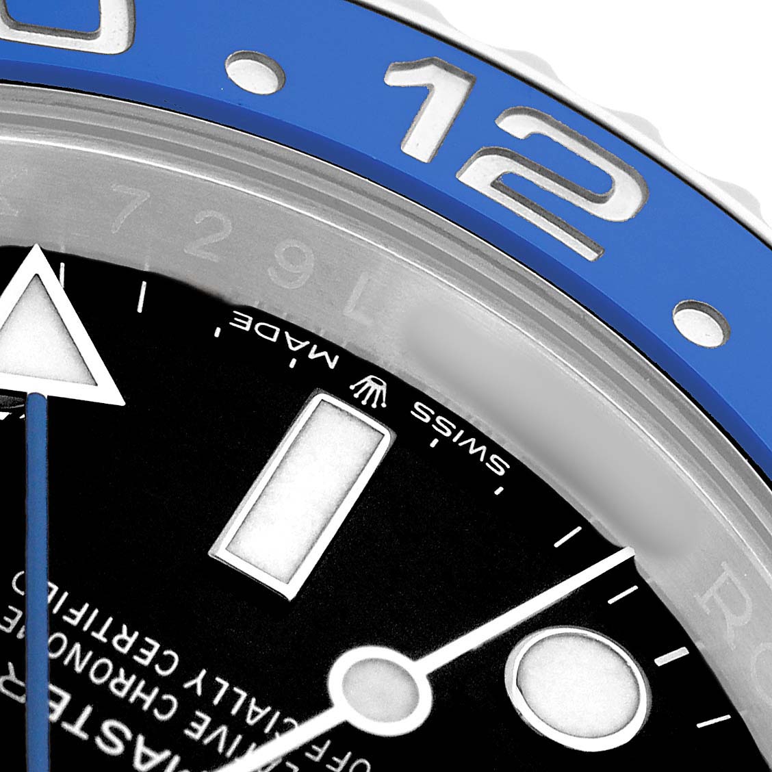 | Bezel: | Stainless steel bidirectional rotating bezel with black and blue "Batgirl" ceramic insert. Engraved with the 24-hour GMT scale. |