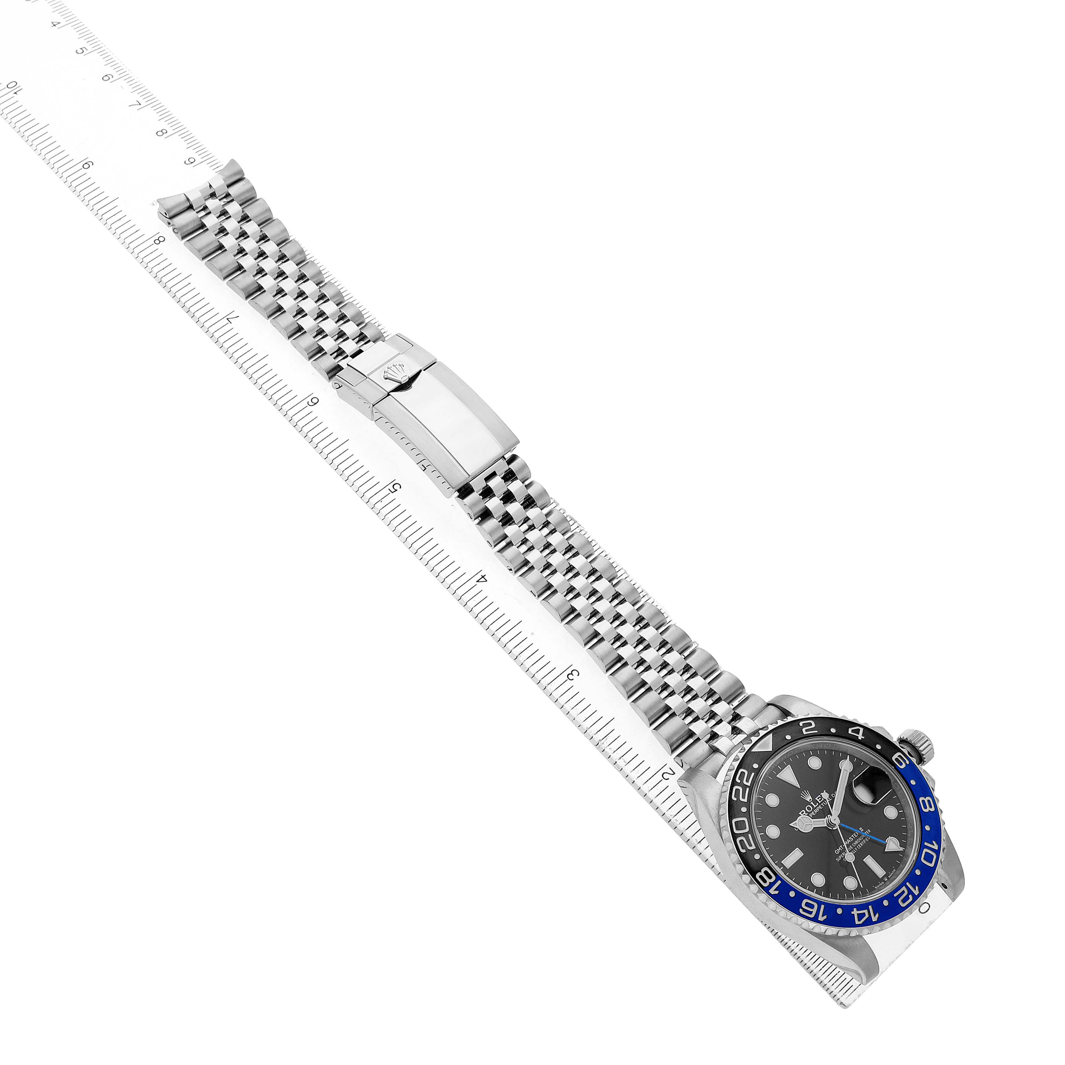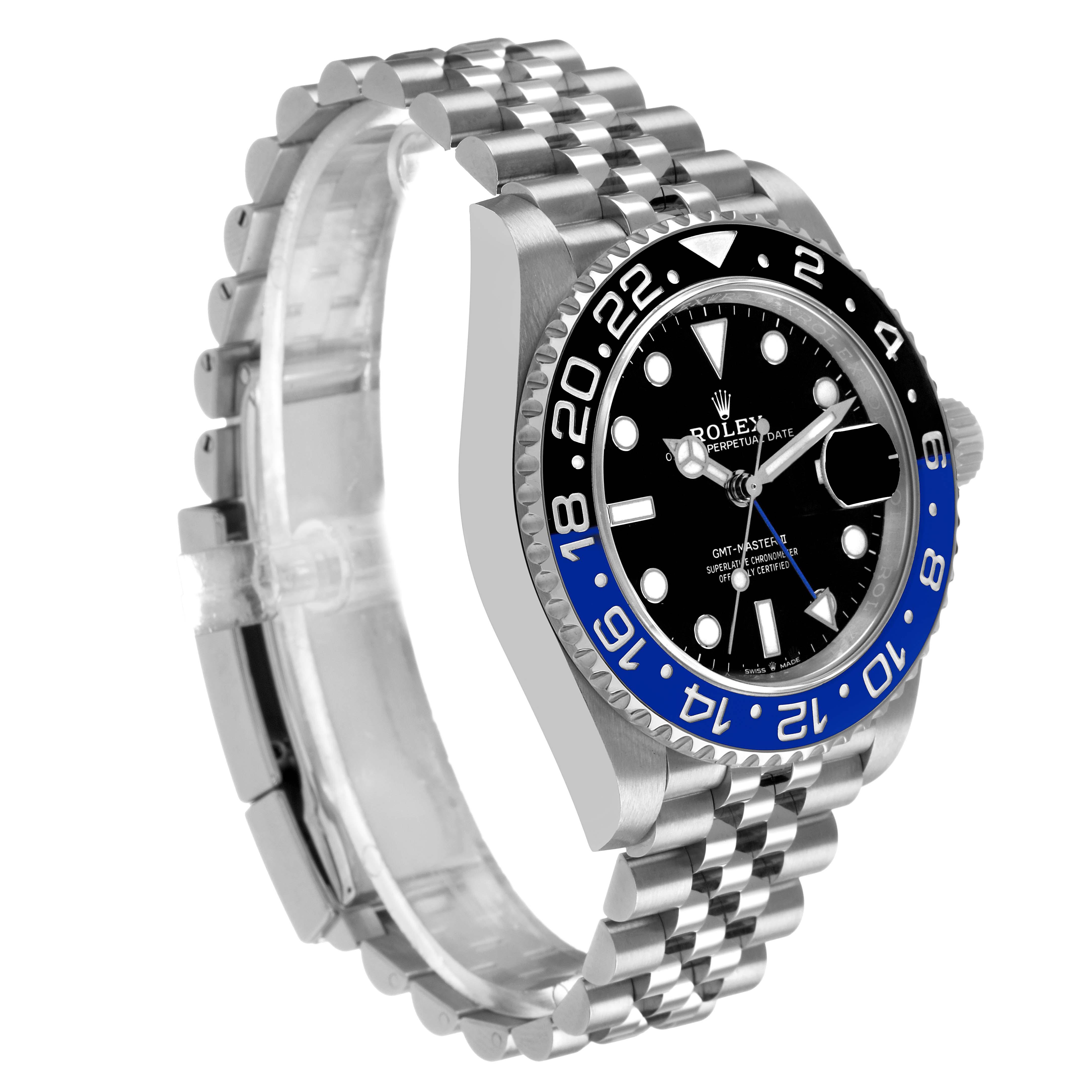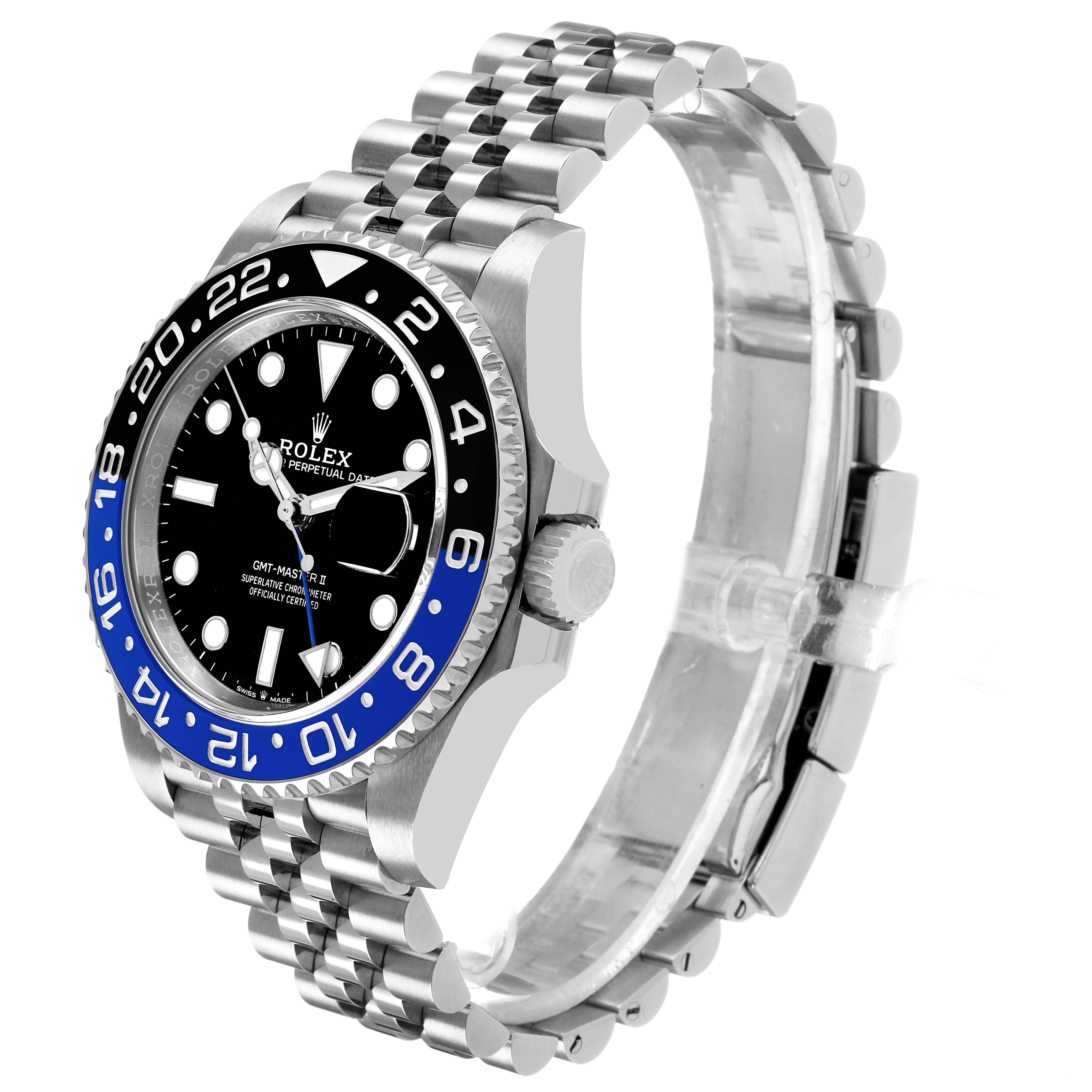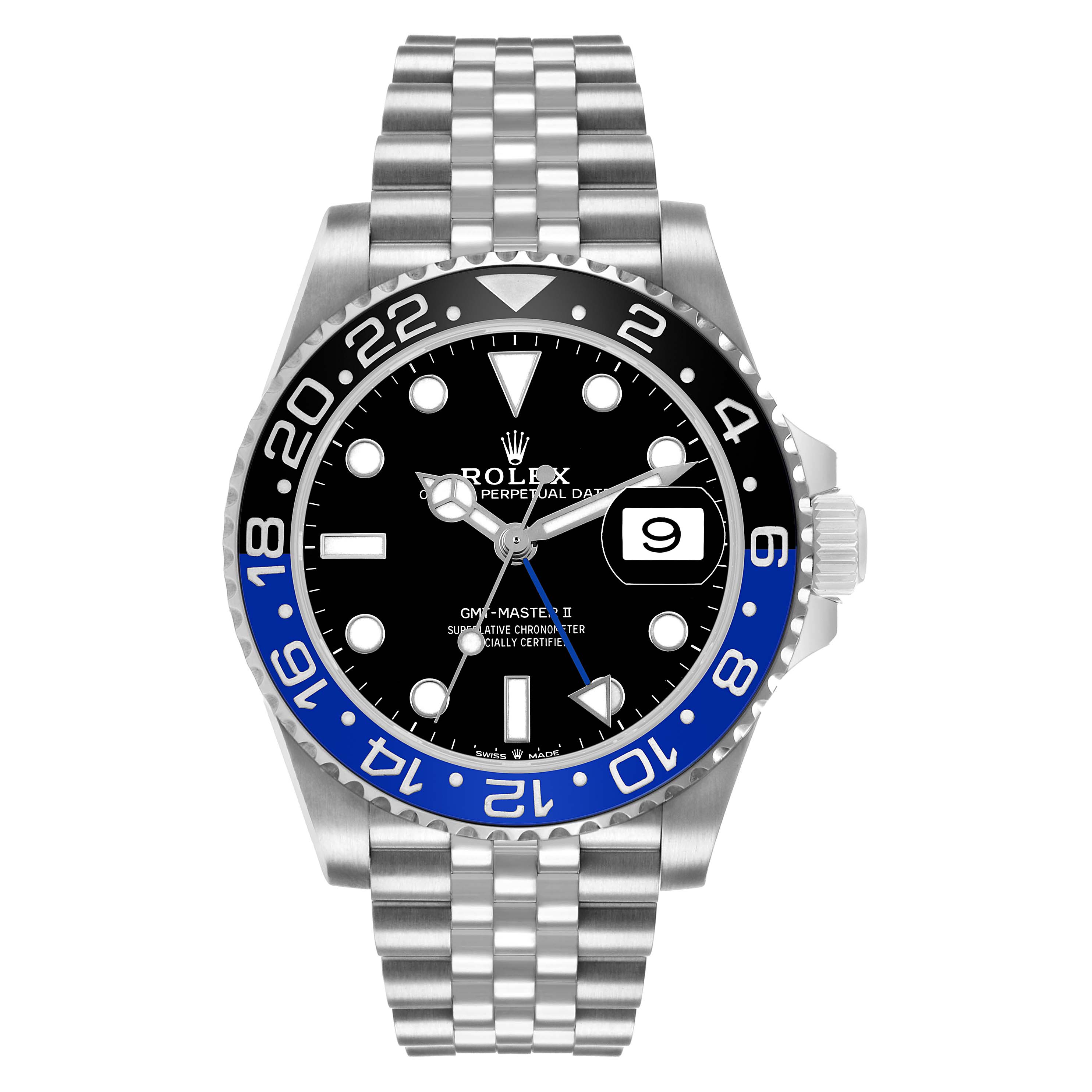Rolex GMT Master II Steel Batgirl Black Blue Bezel Mens Watch 126710. Officially certified chronometer, automatic self-winding movement. Stainless steel oyster case 40.0 mm in diameter. Pointed crown guards. Rolex logo on the crown. Stainless steel bidirectional rotating bezel with black and blue "Batgirl" ceramic insert. Engraved with the 24-hour GMT scale. Scratch-resistant sapphire crystal with cyclops magnifier. Black lacquer dial with white luminescent dot hour markers and Mercedes hands. Luminescent lollipop-tipped centre seconds hand. Blue GMT hand with a luminescent arrow tip. Date calendar at the 3 o'clock aperture. Stainless steel jubilee bracelet with a flip-lock safety clasp and easylink micro-adjustment. Fits a 8'' wrist.