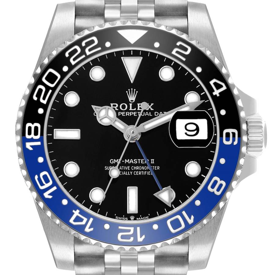 Rolex GMT Master II Steel Batgirl Black Blue Bezel Watch 126710 Box Card Unworn. Officially certified chronometer, automatic self-winding movement. Stainless steel oyster case 40.0 mm in diameter. Pointed crown guards. Rolex logo on the crown. Stainless steel bidirectional rotating bezel with black and blue "Batgirl" ceramic insert. Engraved with the 24-hour GMT scale. Scratch-resistant sapphire crystal with cyclops magnifier. Black lacquer dial with white luminescent dot hour markers and Mercedes hands. Luminescent lollipop-tipped centre seconds hand. Blue GMT hand with a luminescent arrow tip. Date calendar at the 3 o'clock aperture. Stainless steel jubilee bracelet with a flip-lock safety clasp and easylink micro-adjustment.
