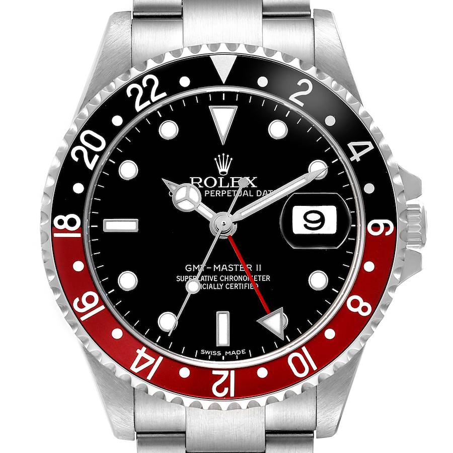 Rolex GMT Master II Steel Black Red Coke Bezel Error Dial Mens Watch 16710. Officially certified chronometer automatic self-winding movement. Stainless steel oyster case 40.0 mm in diameter. Rolex logo on the crown. Pointed crown guards. Stainless steel bidirectional rotating GMT bezel with a 24-hour black and red "Coke" bezel insert. Additional black bezel insert. Scratch resistant sapphire crystal with a cyclops magnifier. Black "error" dial with white luminescent dot hour markers and Mercedes hands. Luminescent arrow-tipped red GMT second timezone hand. Date calendar at the 3 o'clock aperture. Outer stick minute markers. Stainless steel oyster bracelet with a flip-lock clasp. Fits a 7.5" wrist.