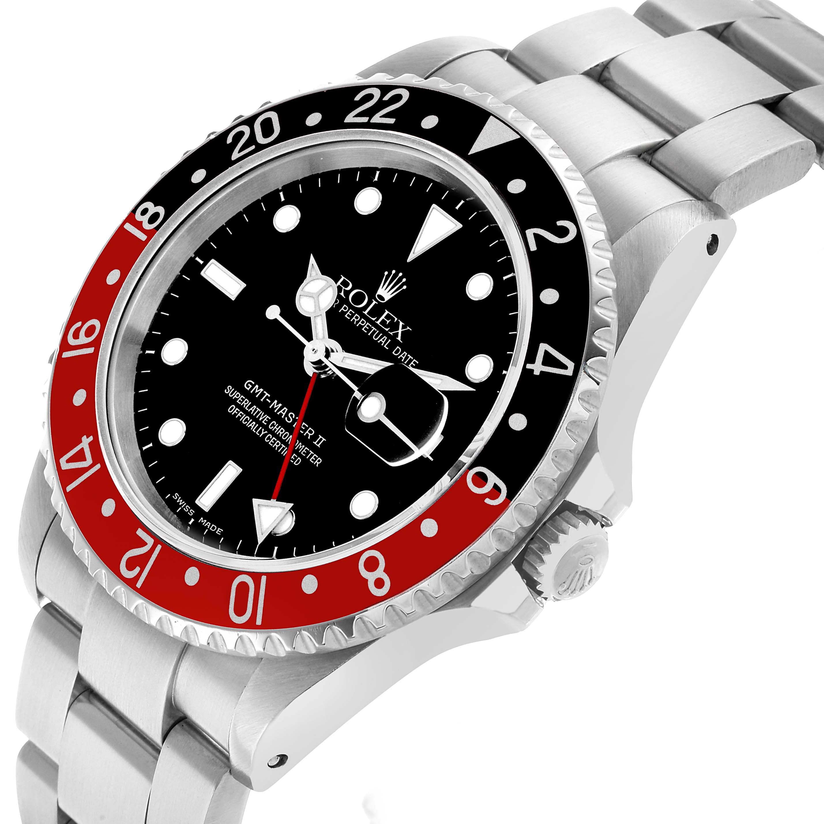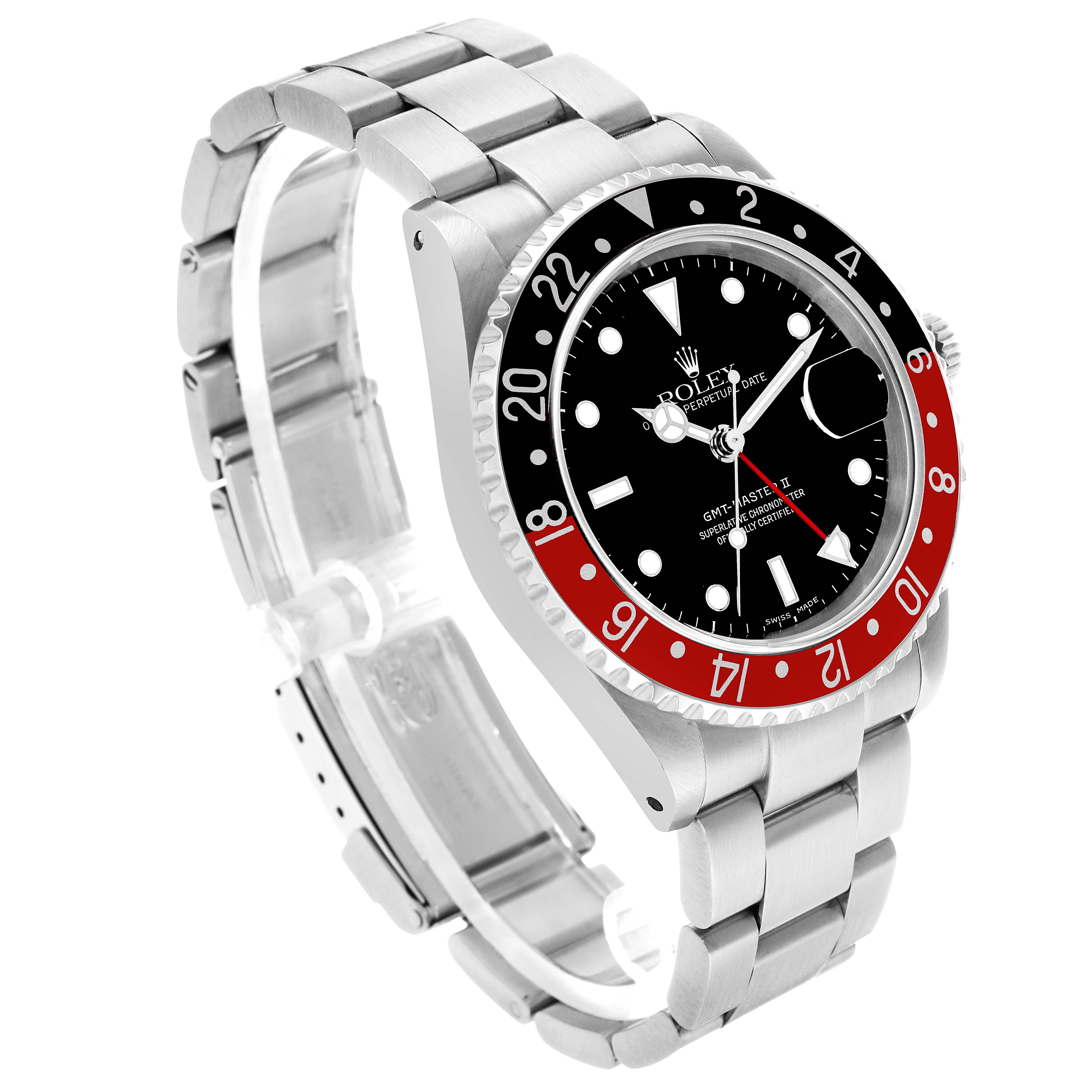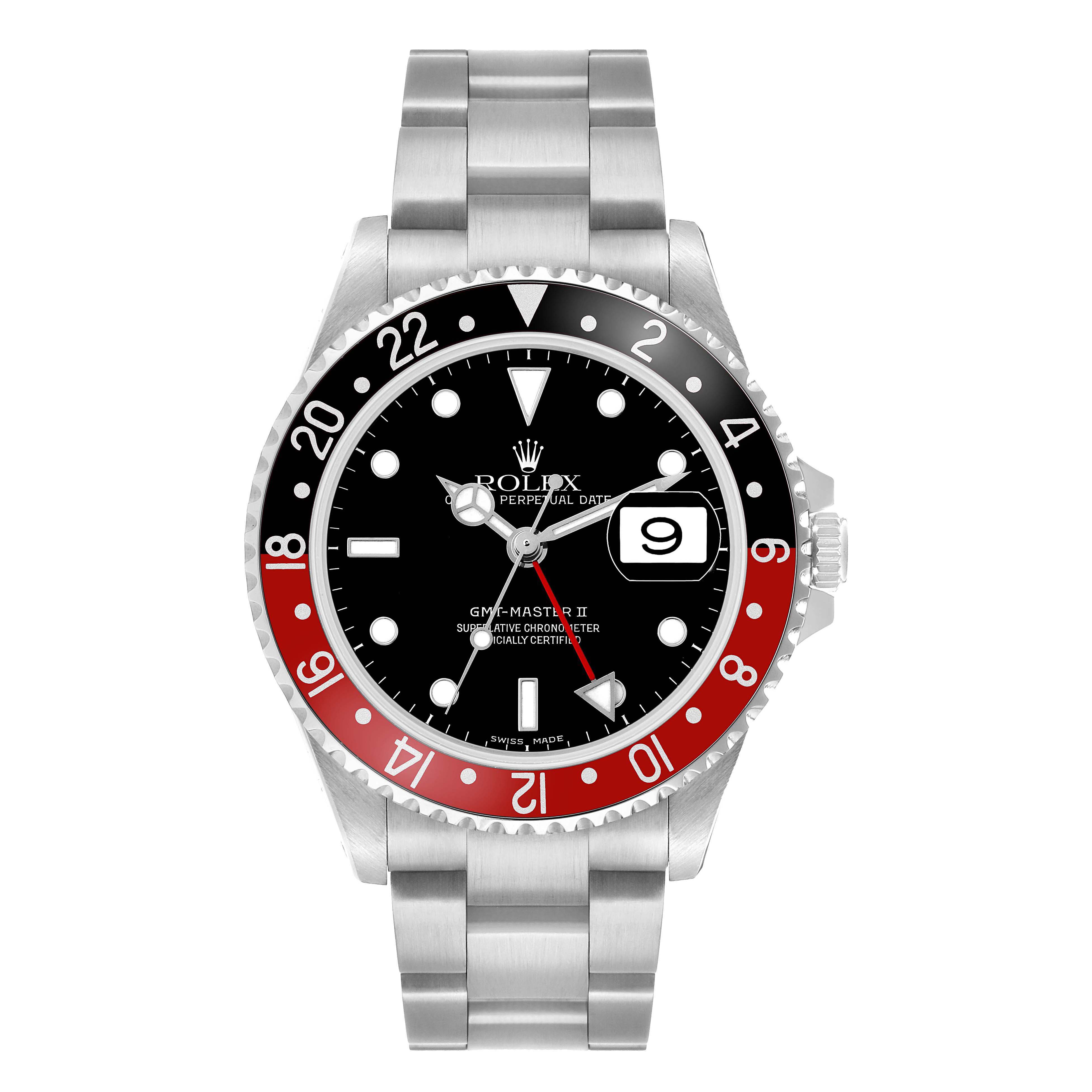 Rolex GMT Master II Steel Black Red Coke Bezel Mens Watch 16710. Officially certified chronometer automatic self-winding movement. Stainless steel oyster case 40.0 mm in diameter. Rolex logo on the crown. Pointed crown guards. Stainless steel bidirectional rotating GMT bezel with a 24-hour black and red "Coke" bezel insert. Scratch resistant sapphire crystal with a cyclops magnifier. Black dial with white luminescent dot hour markers and Mercedes hands. Luminescent lollipop-tipped center seconds hand and luminescent arrow-tipped red GMT second timezone hand. Date calendar at the 3 o'clock aperture. Outer stick minute markers. Stainless steel oyster bracelet with a flip-lock clasp. Fits a 7.5" wrist.