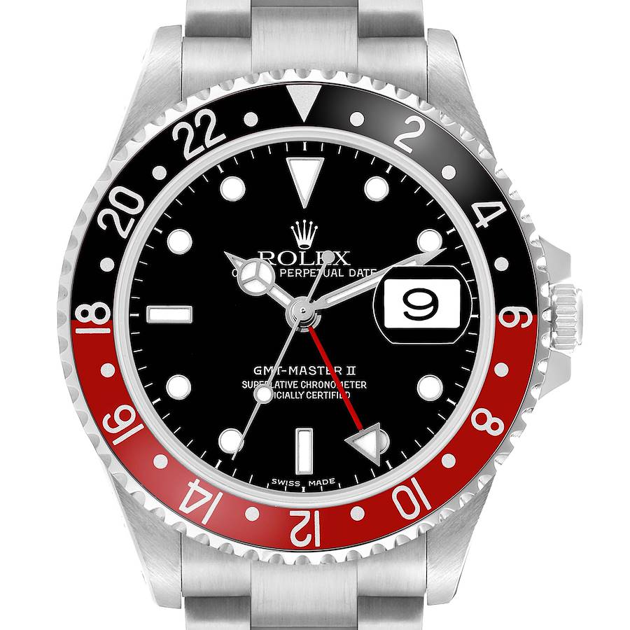 | Bezel: | Stainless steel bidirectional rotating GMT bezel with a 24-hour black and red "Coke" bezel insert. |