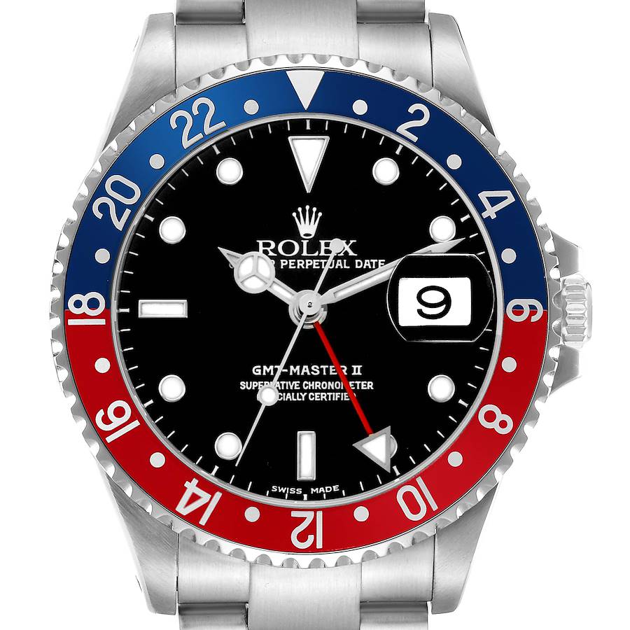 Rolex GMT Master II Steel Blue Red Pepsi Bezel Mens Watch 16710. Officially certified chronometer automatic self-winding movement. Stainless steel oyster case 40.0 mm in diameter. Rolex logo on the crown. Pointed crown guards. Stainless steel bidirectional rotating GMT bezel with a 24-hour blue and red "Pepsi" bezel insert. Scratch resistant sapphire crystal with a cyclops magnifier. Black dial with white luminescent dot hour markers and Mercedes hands. Luminescent arrow-tipped red GMT second timezone hand. Date calendar at the 3 o'clock aperture. Outer stick minute markers. Stainless steel oyster bracelet with a flip-lock clasp. Fits a 7 1/2" wrist.
