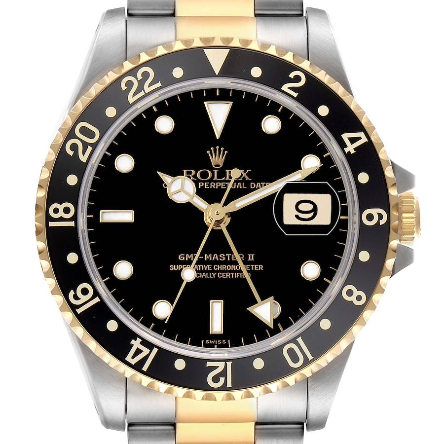 Rolex GMT Master II Steel Yellow Gold Black Dial Mens Watch 16713 Box Papers. Officially certified chronometer automatic self-winding movement. Stainless steel oyster case 40.0 mm in diameter. Rolex logo on the 18k yellow gold crown. 18k yellow gold bidirectional rotating bezel with a special 24-hour black bezel insert. Scratch resistant sapphire crystal with a cyclops magnifier. Black dial with yellow gold luminescent dot hour markers and Mercedes hands. Date calendar at the 3 o'clock aperture. Stainless steel and 18k yellow gold oyster bracelet with a fold-over clasp. Fits a 7 1/4" wrist.