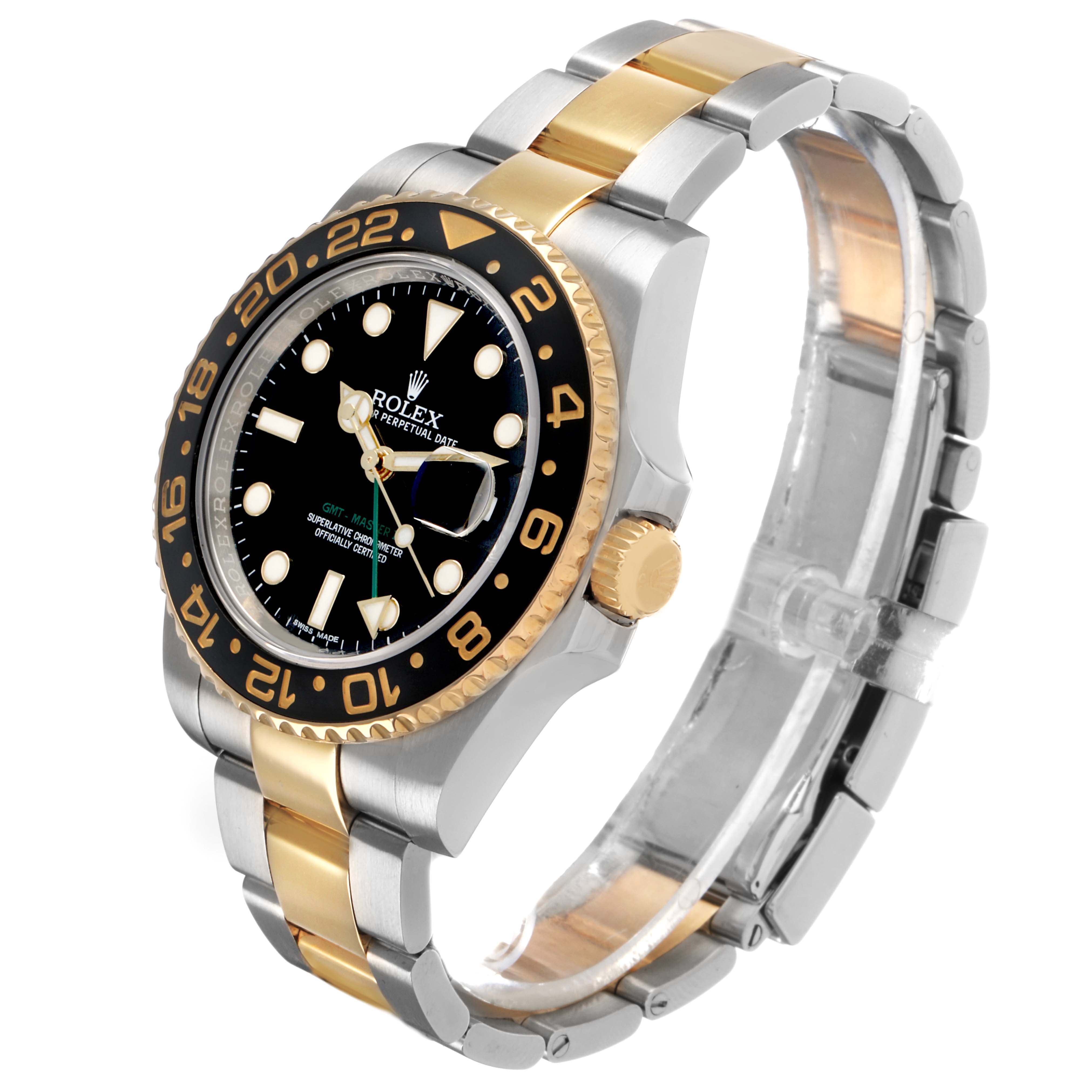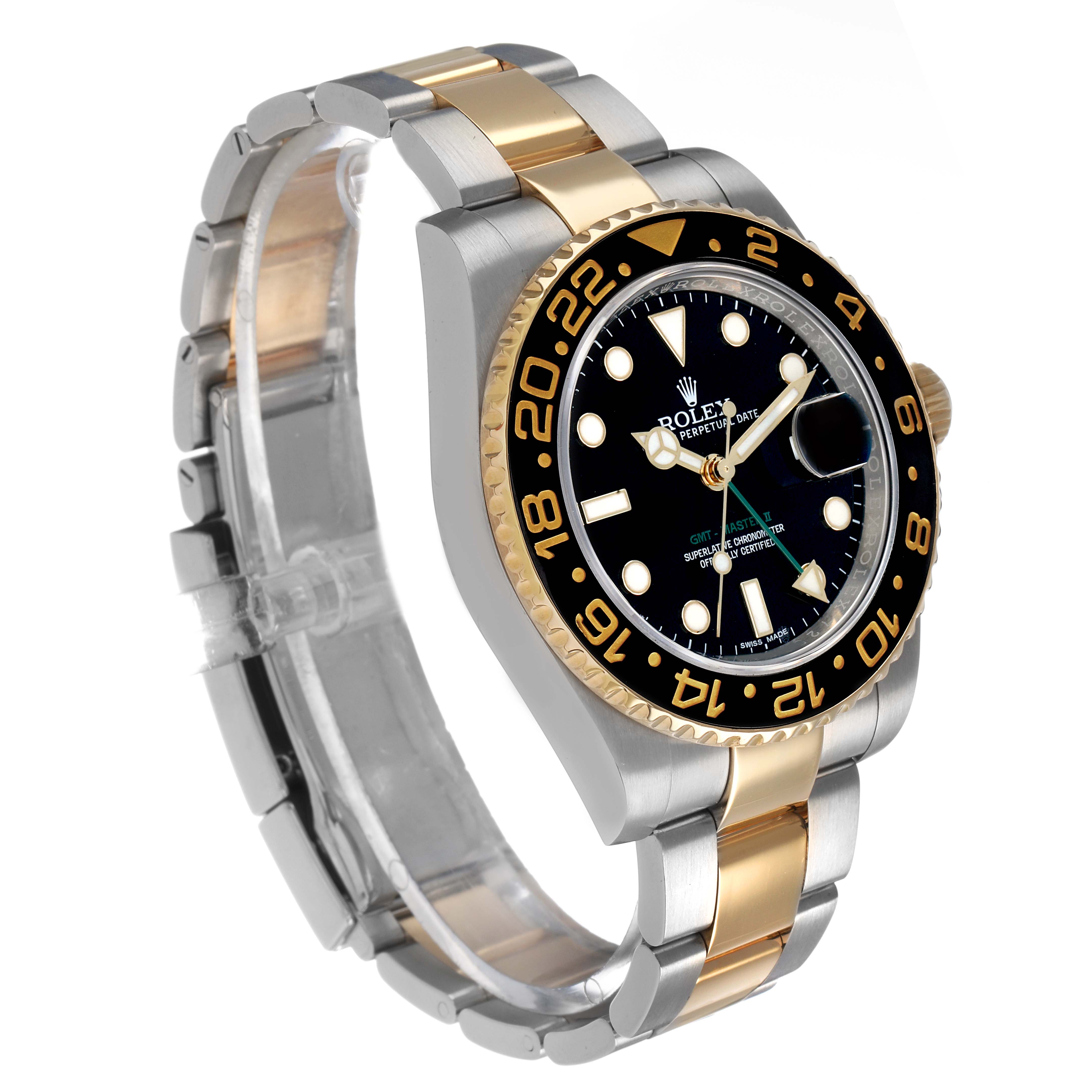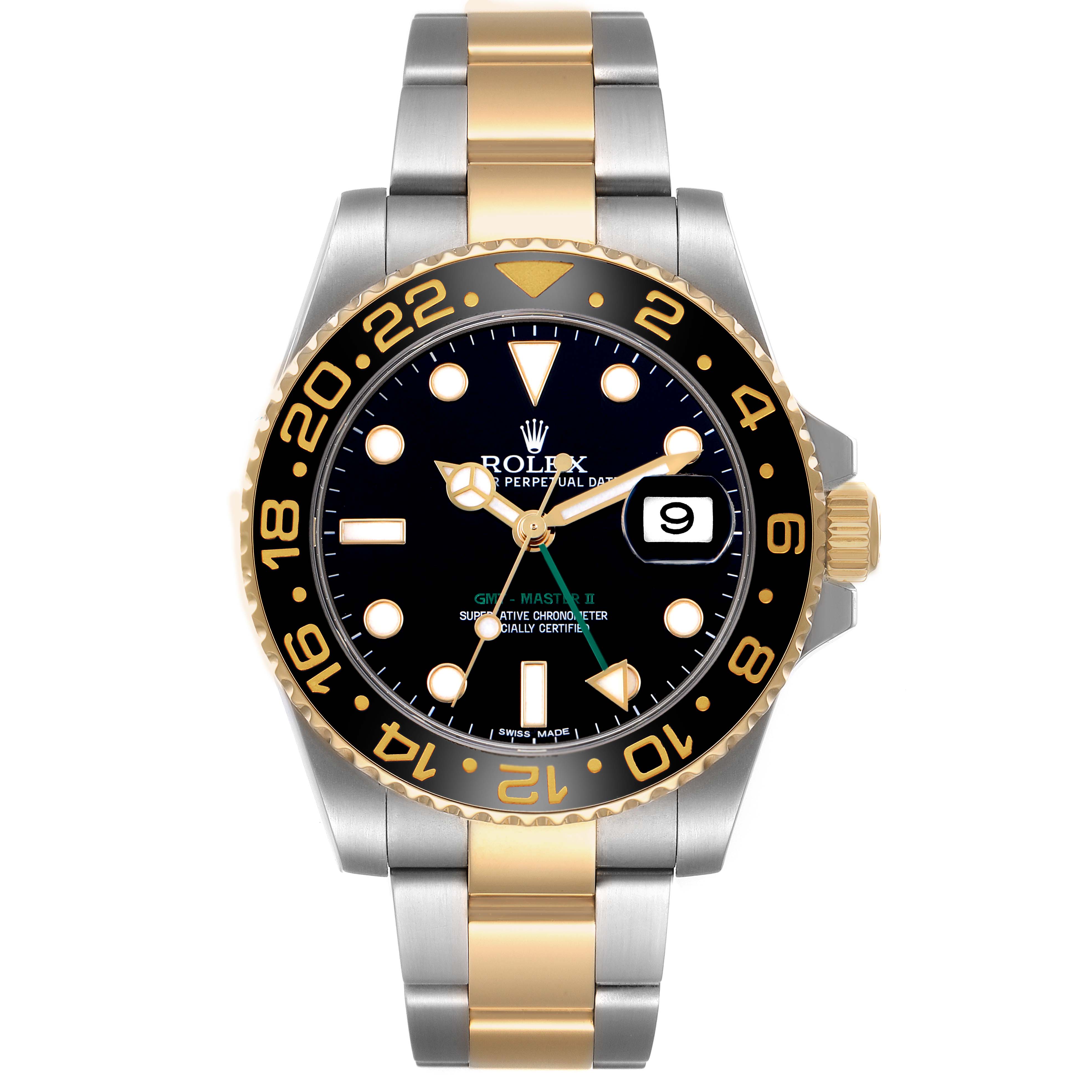Rolex GMT Master II Steel Yellow Gold Mens Watch 116713 Card. Officially certified chronometer automatic self-winding movement. Stainless steel oyster case 40.0 mm in diameter. Pointed crown guards. Rolex logo on the 18k yellow gold crown. 18k yellow gold bidirectional rotating bezel with a special 24-hour black bezel insert. Scratch resistant sapphire crystal with a cyclops magnifier. Black lacquer dial with luminescent yellow gold dot hour markers and Mercedes hands. Luminescent green arrow-tipped GMT hand. Luminescent lollipop-tipped center sweeping seconds hand. Date calendar at the 3 o'clock aperture. Outer stick minute markers. Stainless steel and 18K yellow gold oyster bracelet with a flip-lock clasp. Fits an 8" wrist.